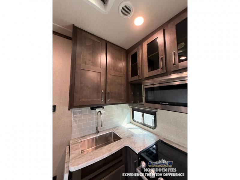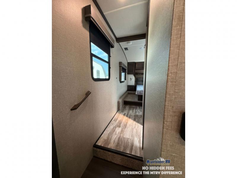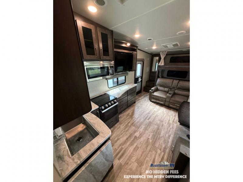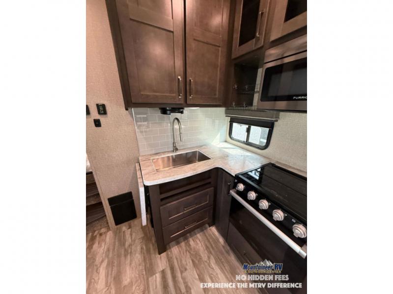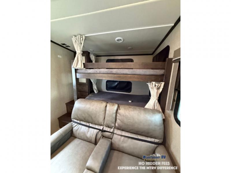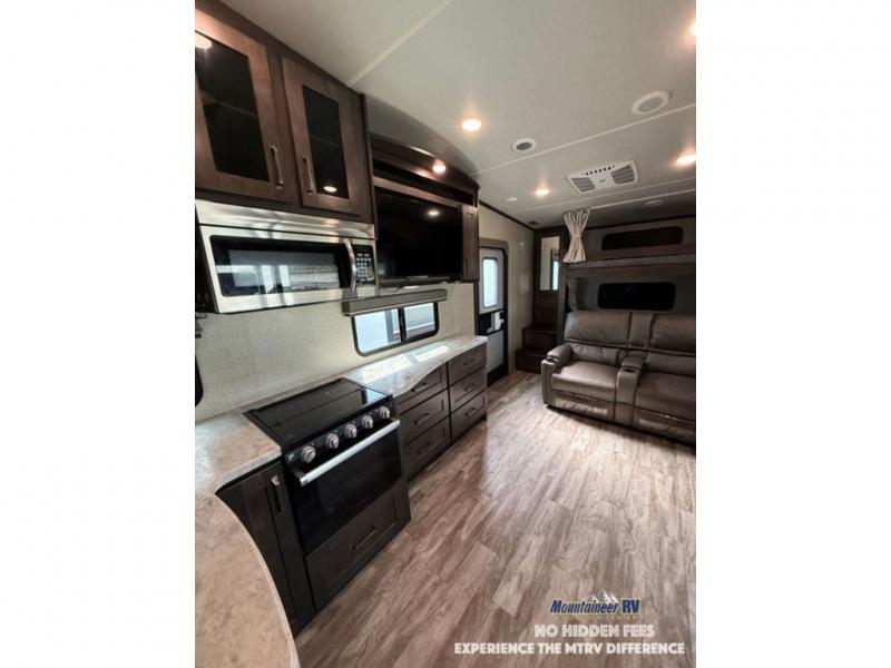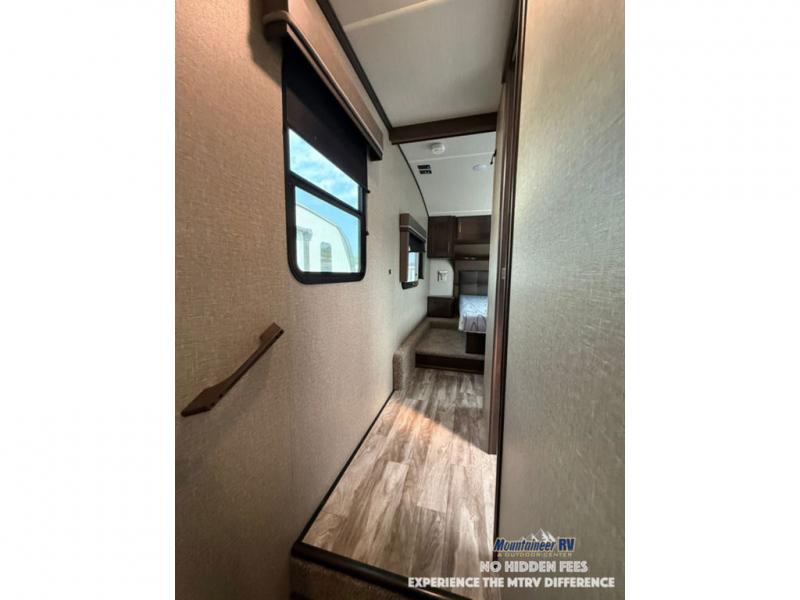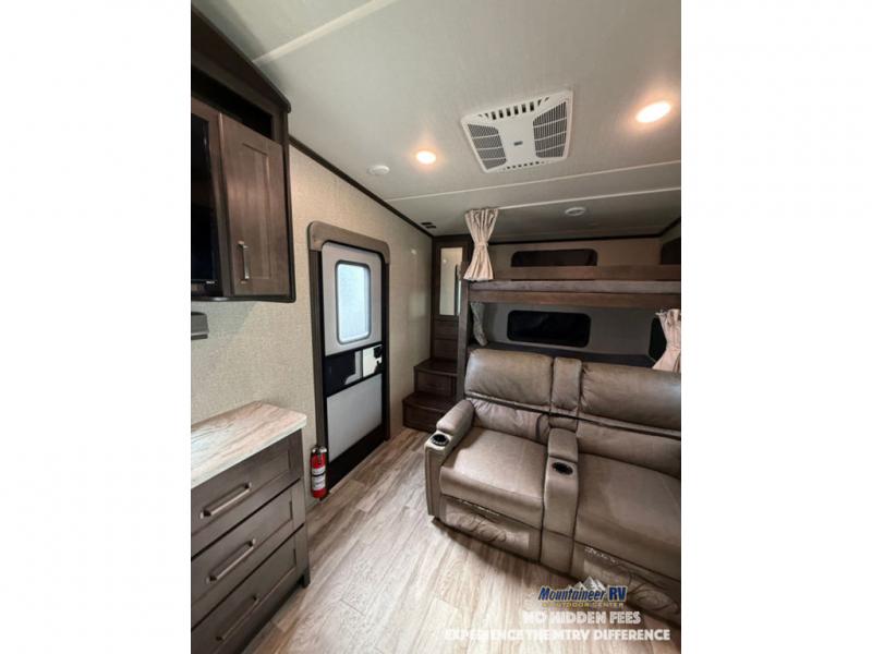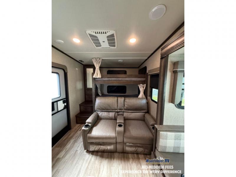 Get away from the hustle and bustle of the city every chance you get with this fifth wheel in tow! Once at your campsite, you can easily set up the single slide and the 20' electric awning and head out for a hike or relax on the U-shaped dinette and theatre seating while watching the 40" LED HDTV. The cook will love the L-shaped kitchen giving them their own space without interruptions and they will have full amenities to keep everyone fed. Everyone can take turns getting cleaned up in the walk-in shower in the full bathroom before calling it a night. The front bedroom offers a walk-around queen bed and plenty of storage, while the rear of this fifth wheel gives the kids or your friends 46" bunk beds to sleep on with their own storage near the step storage. And the U-shaped dinette offers extra sleeping space.