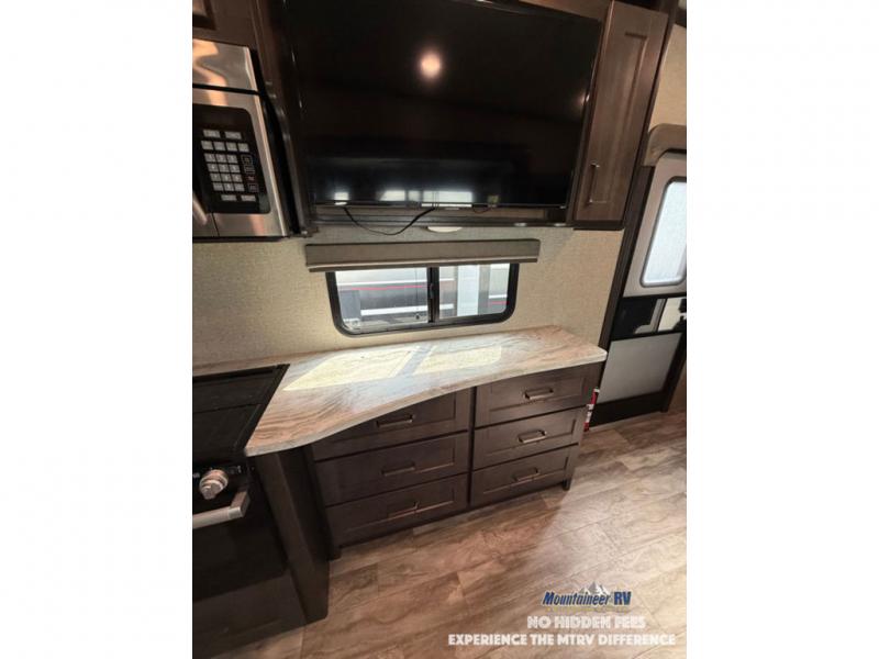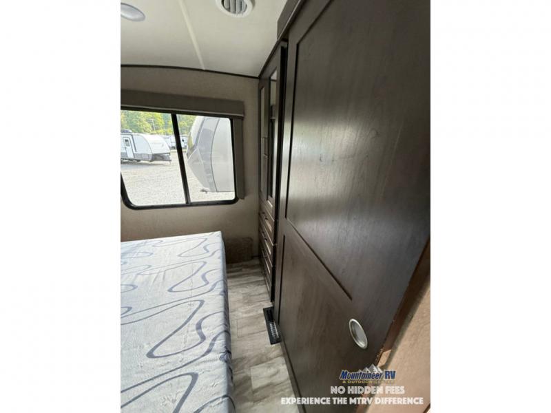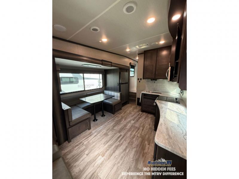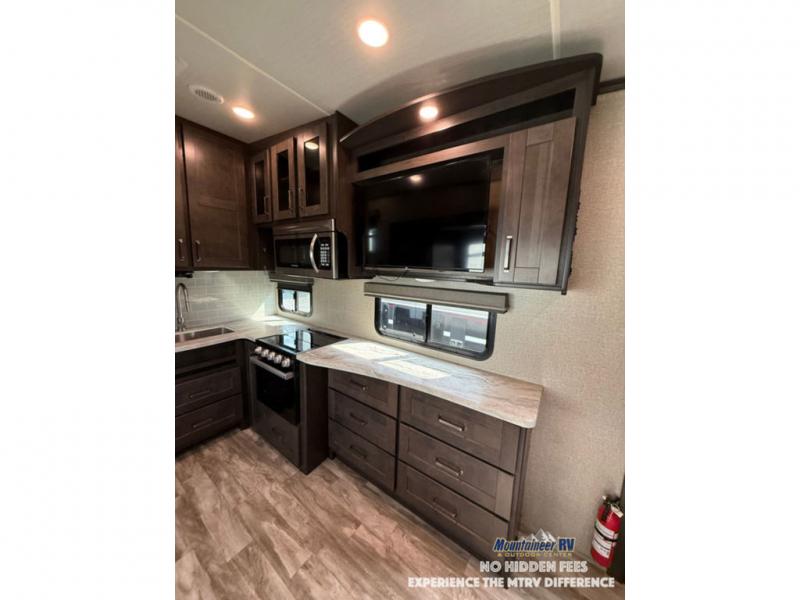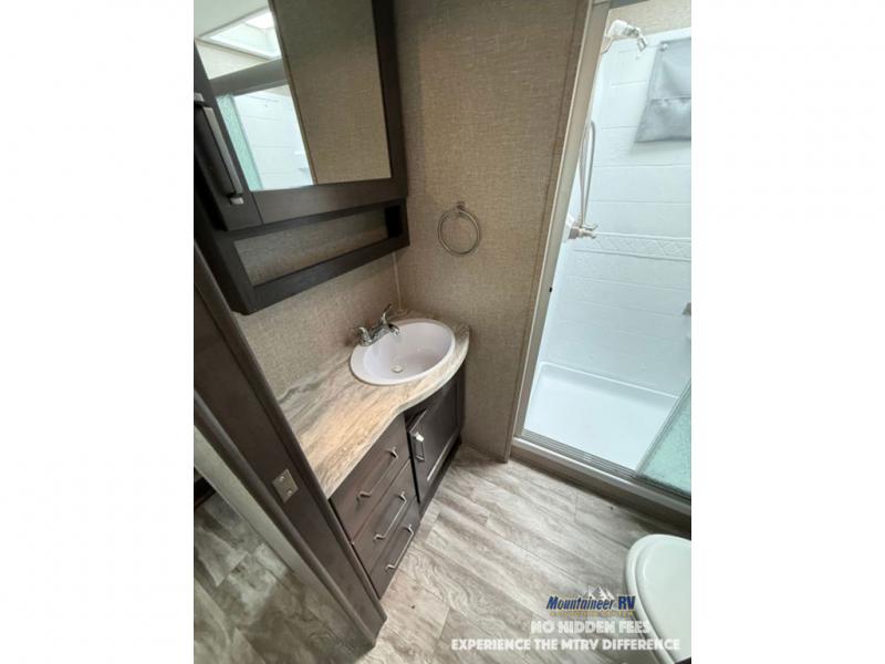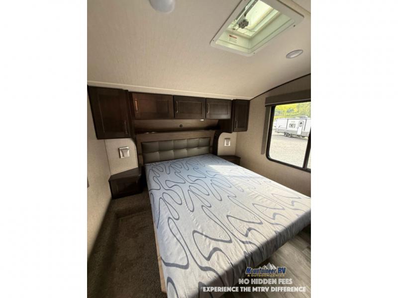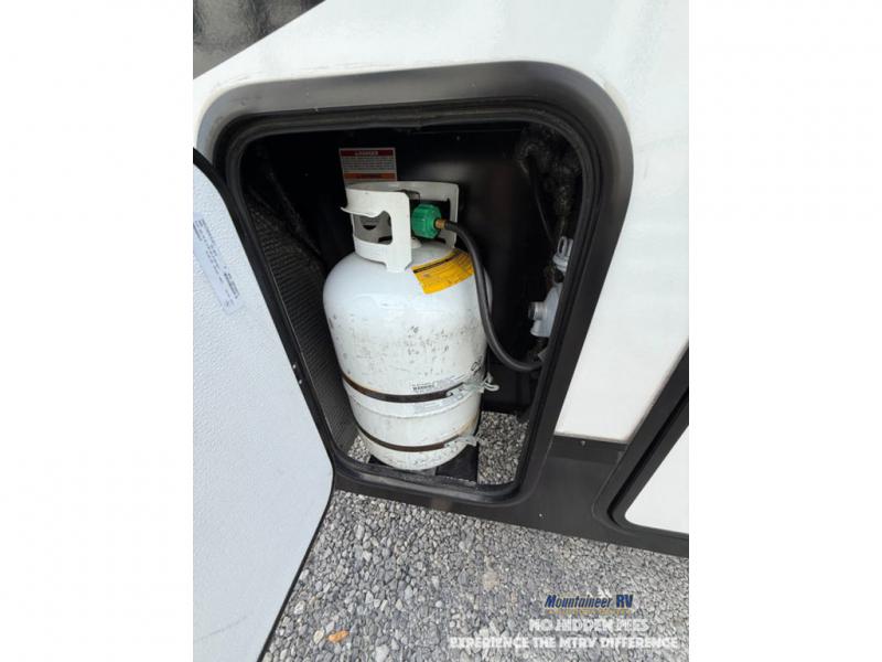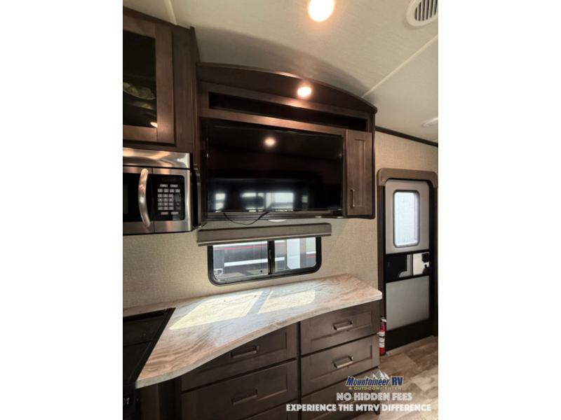Get away from the hustle and bustle of the city every chance you get with this fifth wheel in tow! Once at your campsite, you can easily set up the single slide and the 20' electric awning and head out for a hike or relax on the U-shaped dinette and theatre seating while watching the 40" LED HDTV. The cook will love the L-shaped kitchen giving them their own space without interruptions and they will have full amenities to keep everyone fed. Everyone can take turns getting cleaned up in the walk-in shower in the full bathroom before calling it a night. The front bedroom offers a walk-around queen bed and plenty of storage, while the rear of this fifth wheel gives the kids or your friends 46" bunk beds to sleep on with their own storage near the step storage. And the U-shaped dinette offers extra sleeping space.