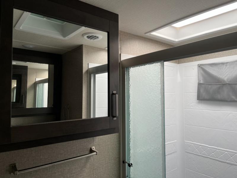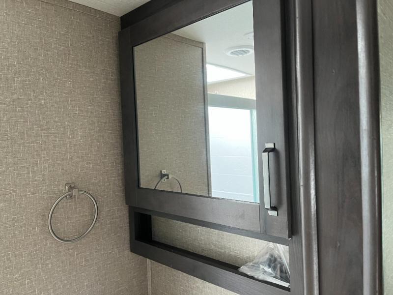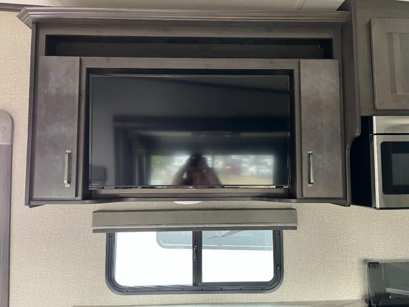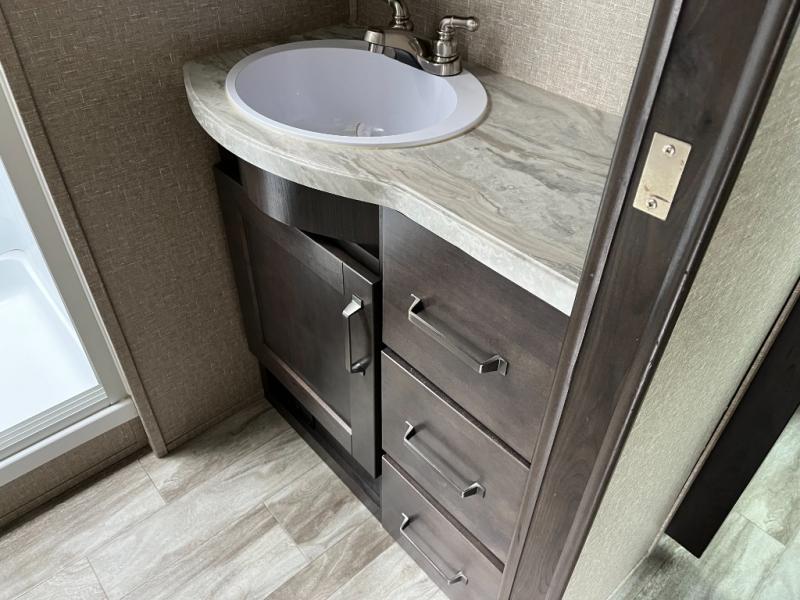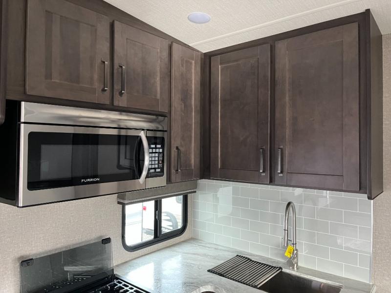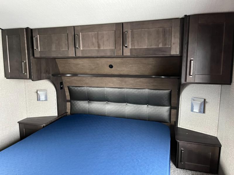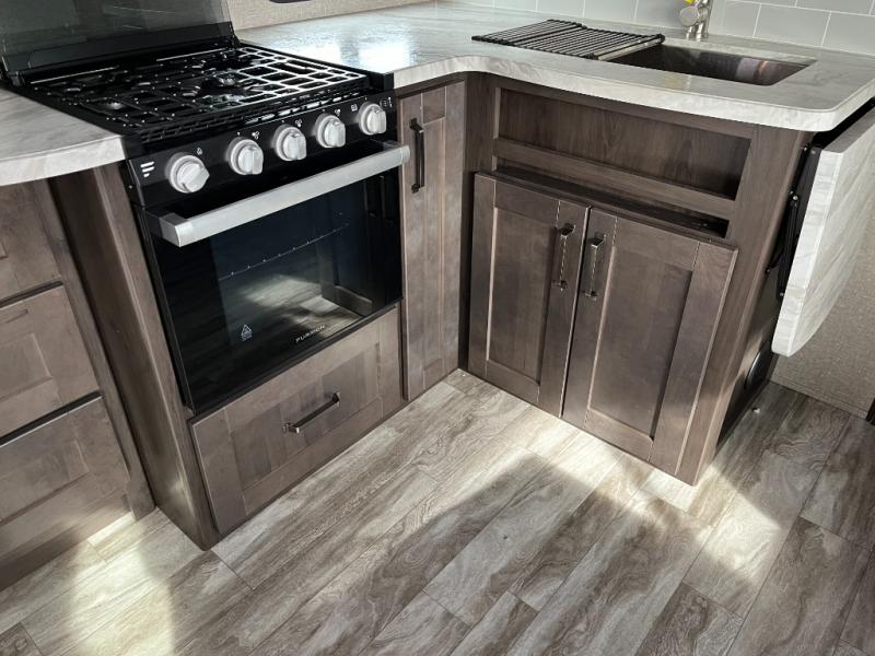 The fully equipped kitchen makes cooking while camping fun and convenient, with a refrigerator, microwave, cooktop, oven, and generous counter space for meal prep. Abundant storage cabinets help you keep dishes, cookware, and food organized throughout your journey.