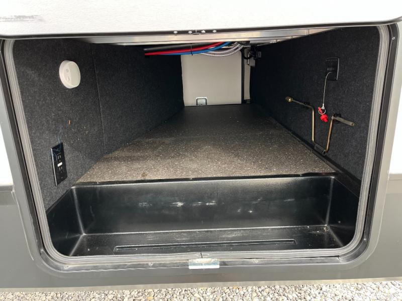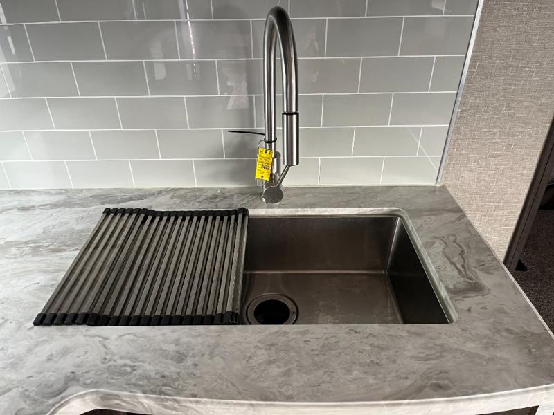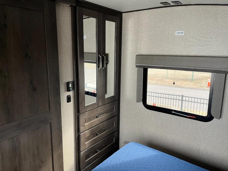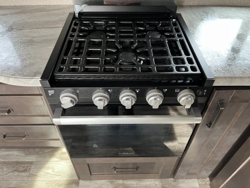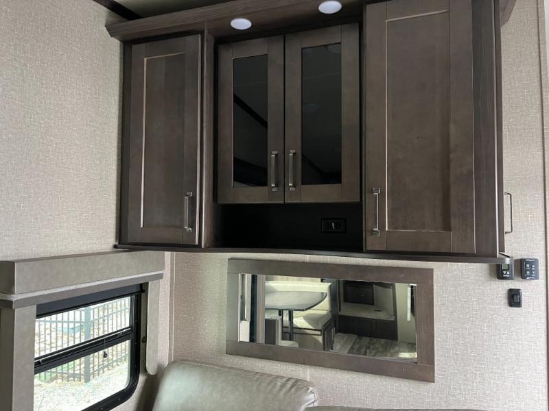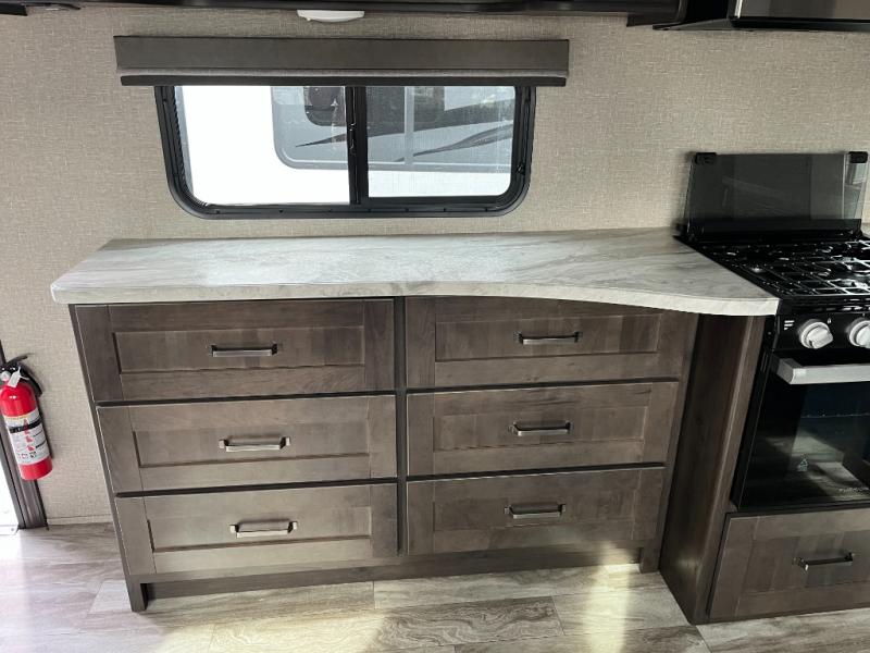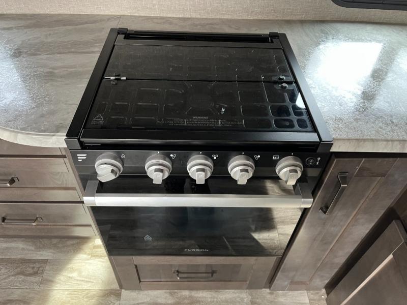 The fully equipped kitchen makes cooking while camping fun and convenient, with a refrigerator, microwave, cooktop, oven, and generous counter space for meal prep. Abundant storage cabinets help you keep dishes, cookware, and food organized throughout your journey.
