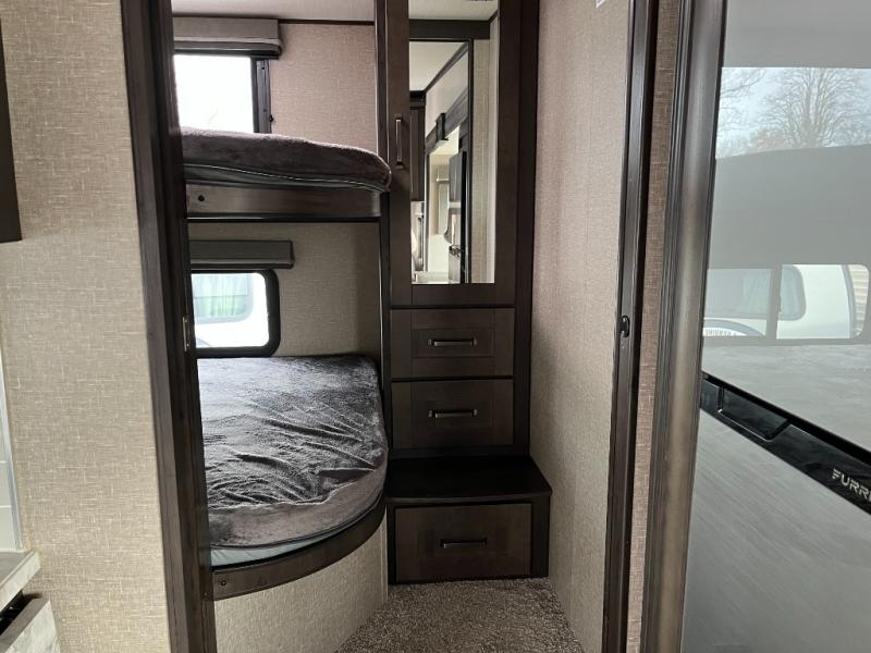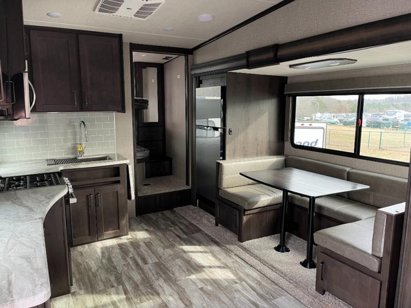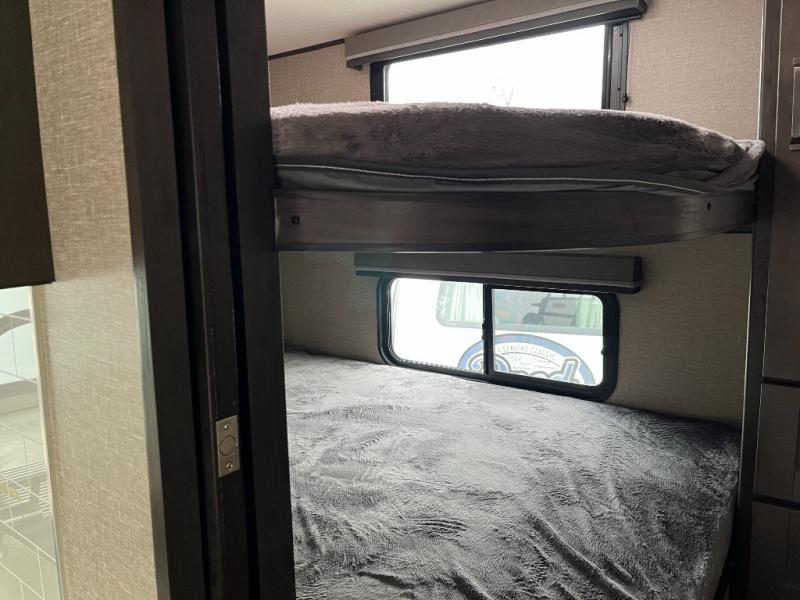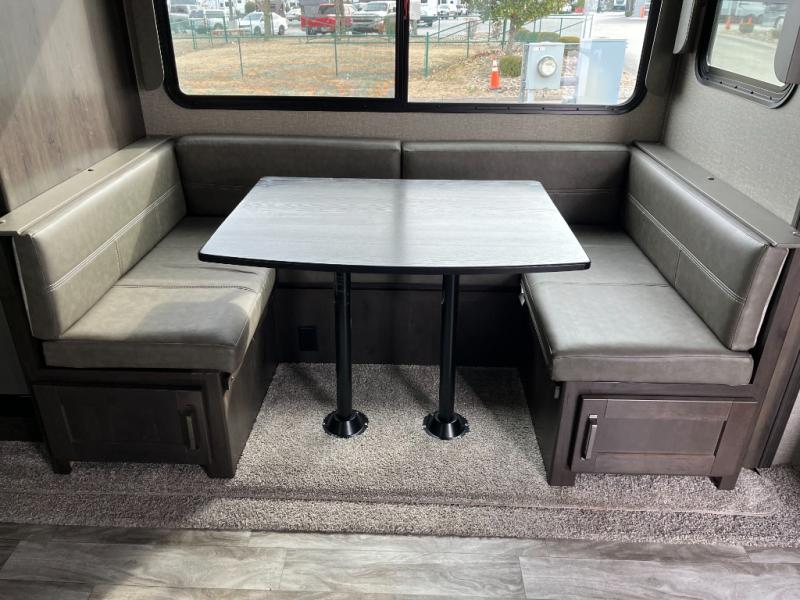 Step inside and experience a bright, open interior designed for real living. The Reflection’s bunkhouse layout makes it easy to bring kids, guests, or extra gear without sacrificing space or comfort. The main living area features comfortable seating, a large dinette, plenty of windows, and a well-designed entertainment center — perfect for laughs, meals, or movie nights on the road.