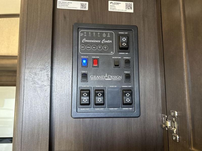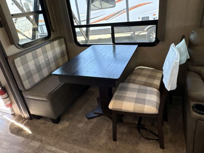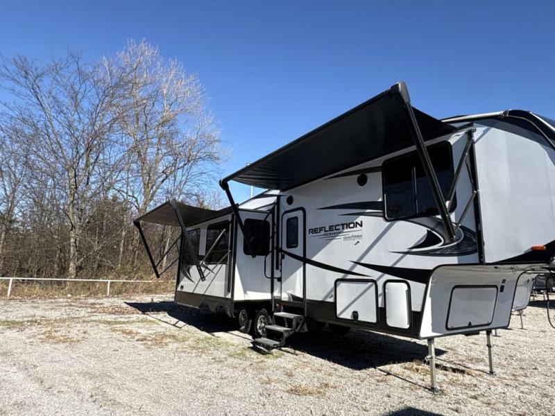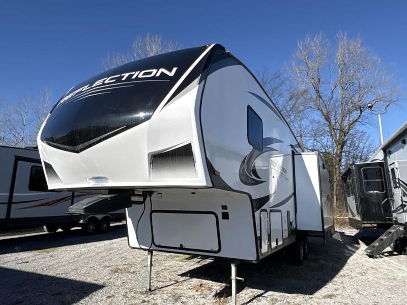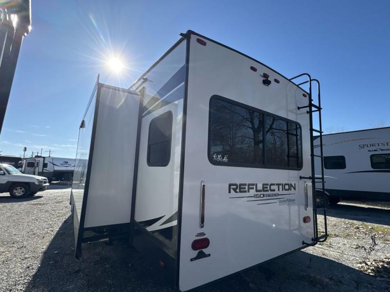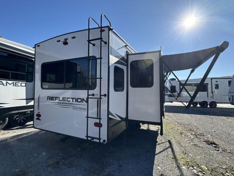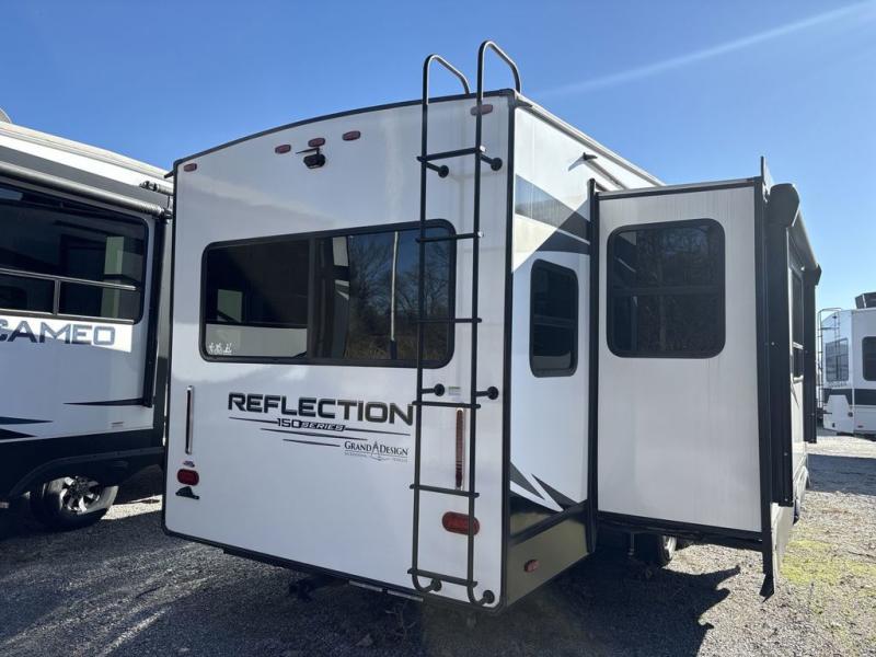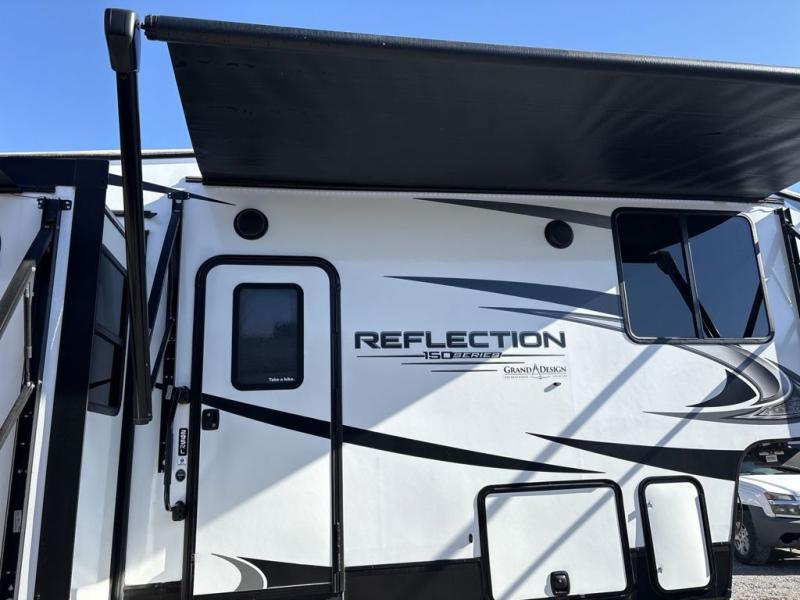 With any Reflection 150 Series fifth wheel by Grand Design, there is more available payload capacity and a broader range of half-ton trucks capable of towing this fifth wheel, and no slider hitch is needed thanks to the 90-degree turning radius which makes them short bed friendly and easier to tow. The mandatory Ultimate Power package provides a "One-Touch" automatic leveling system and a detachable power cord with LED light for easy setup, plus motion sensor pass-through lighting and entry lighting, and the Tire Linc TPMS will help you stay safe on the road. The interior offers residential luxury from the cabinetry and gunstock hardware plus the booth dinette to the residential-style window treatment. Make your refined decision today!