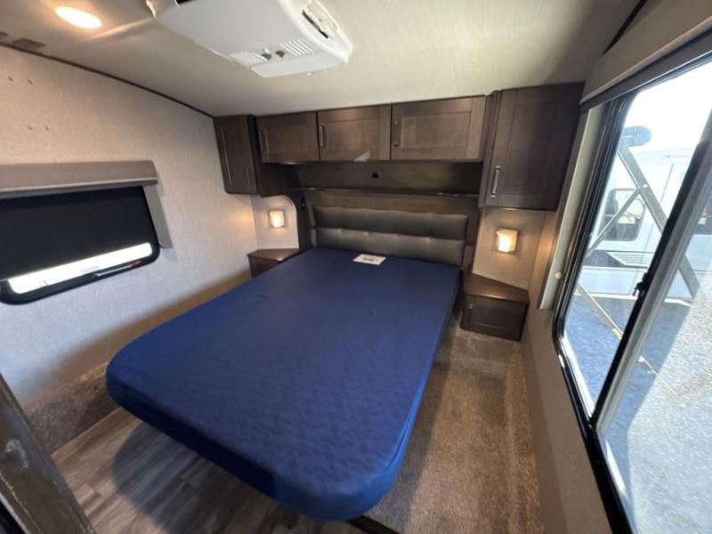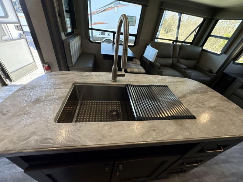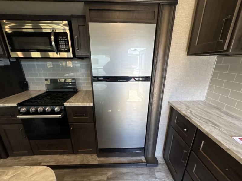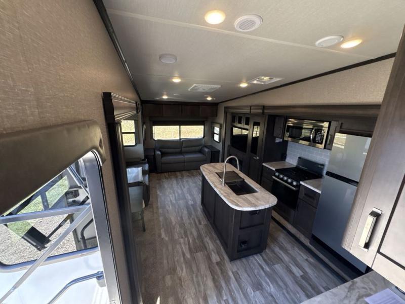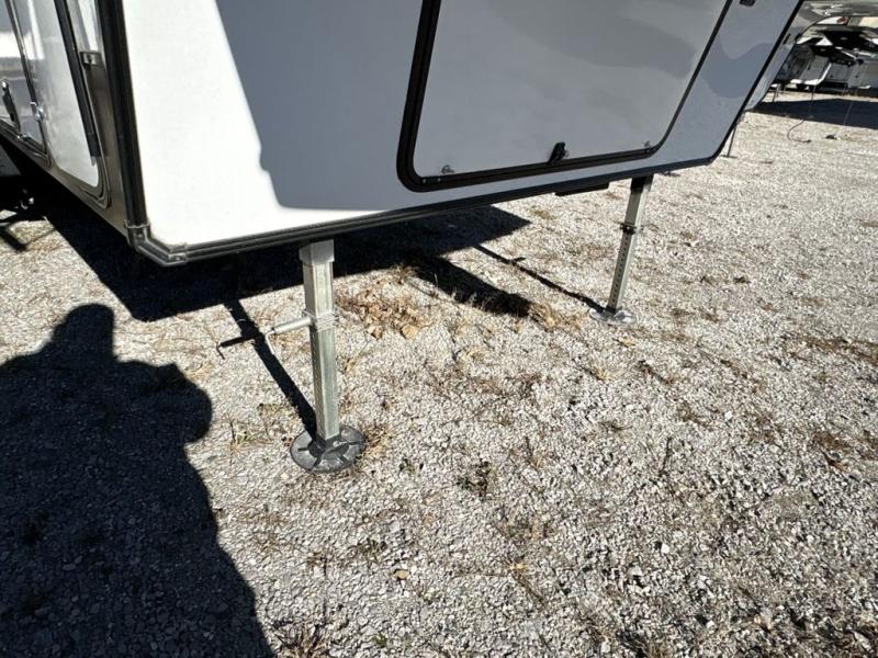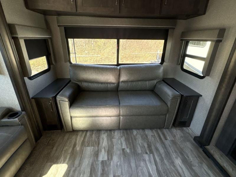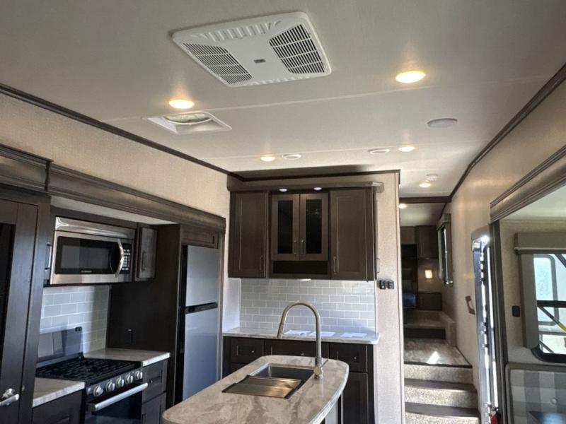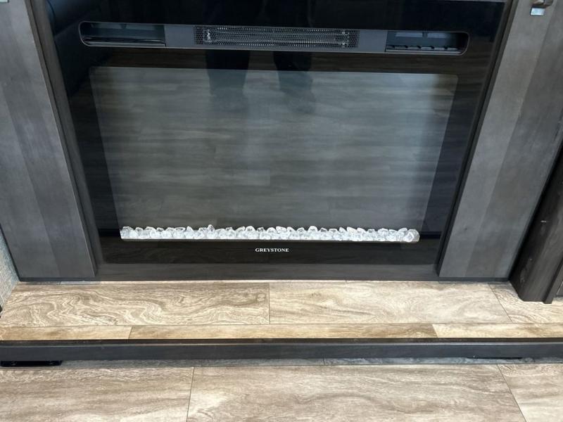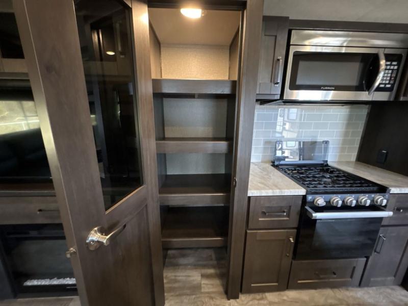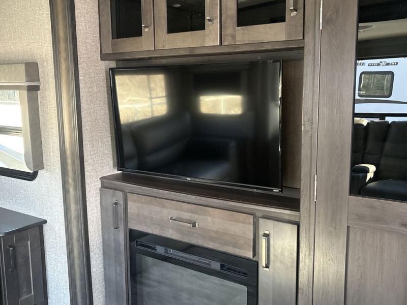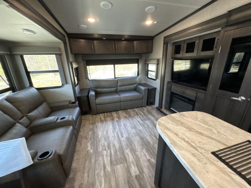 Get ready to enjoy everything the campgrounds and surrounding area has to offer when you are setup to camp in this fifth wheel! The two electric awnings offer protected areas creating outdoor living spaces, just grab your camping chairs from the unobstructed pass-through storage. And the interior offers a spacious living area and kitchen combination with two slide outs. You can sit on the tri-fold sofa or the dinette with an option for a free standing dinette. The hutch and kitchen island offer counter space to prepare and serve meals, and there is a large pantry for goodies. The 40" LED HDTV with fireplace below provides entertainment before bedtime or on a rainy day. And the front bedroom offers privacy, a walk-around queen bed, storage, and it is next to the full bathroom which is just a few steps down the hallway.