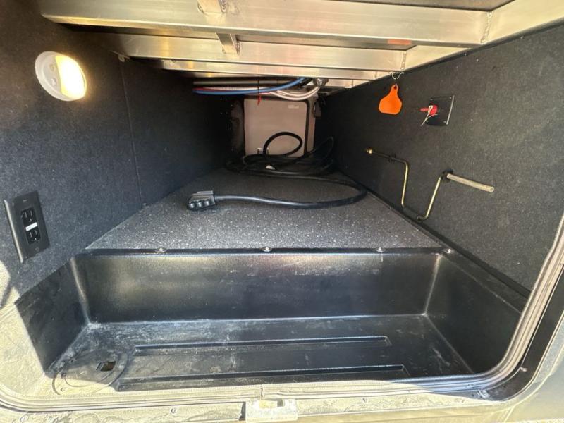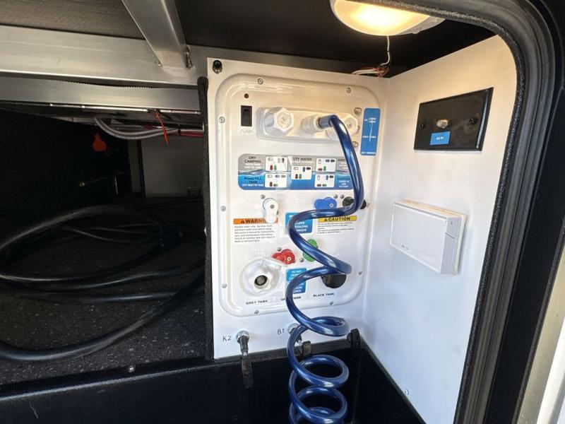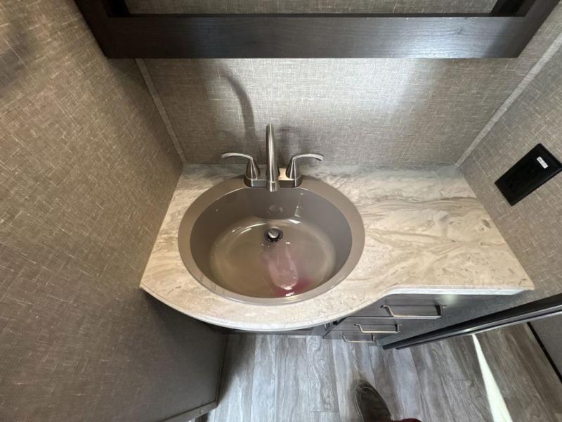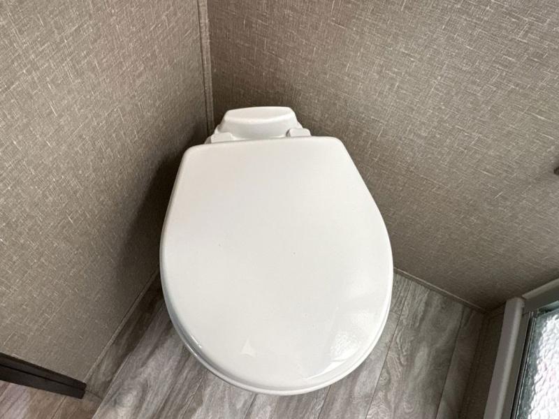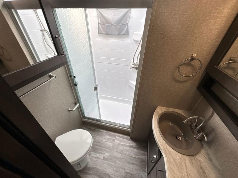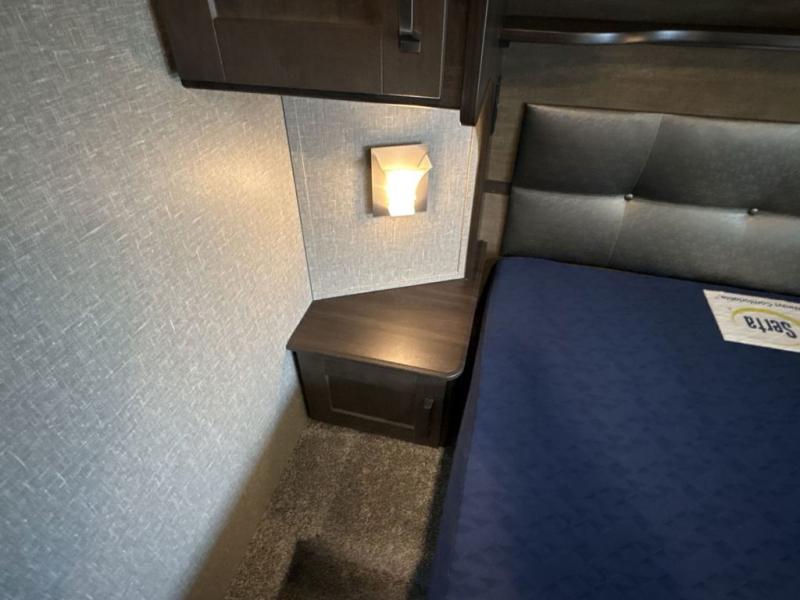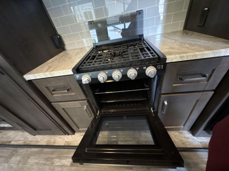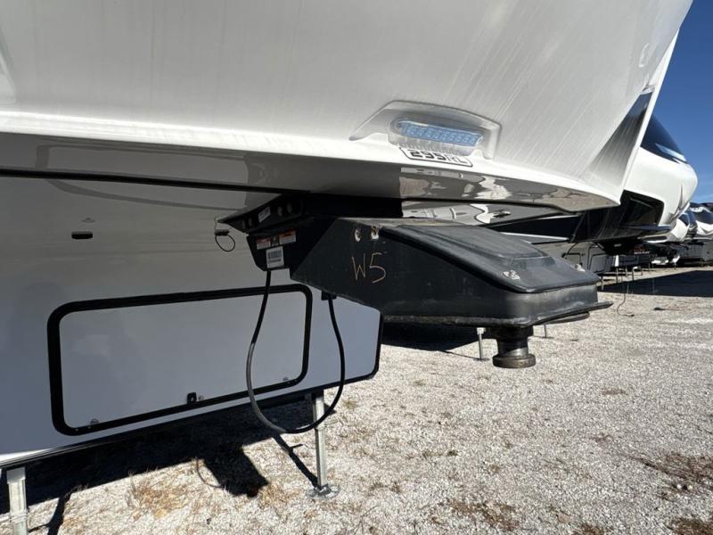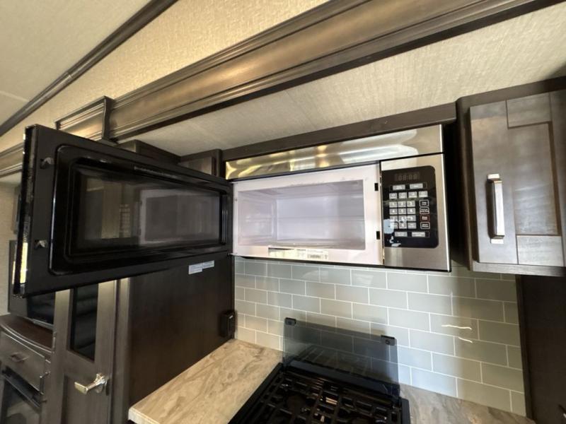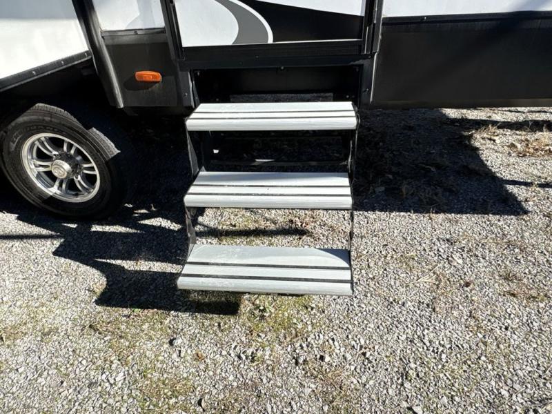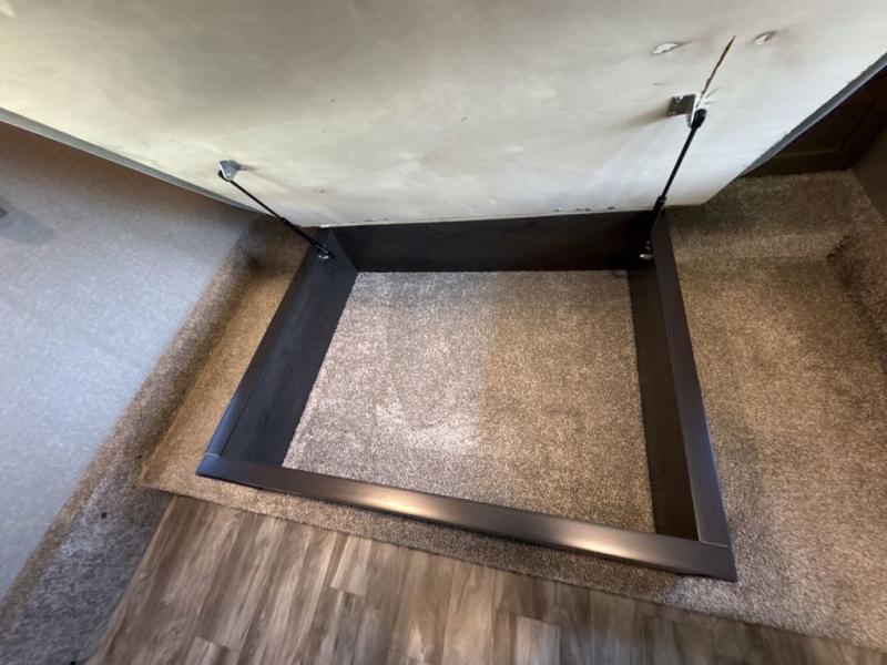 Get ready to enjoy everything the campgrounds and surrounding area has to offer when you are setup to camp in this fifth wheel! The two electric awnings offer protected areas creating outdoor living spaces, just grab your camping chairs from the unobstructed pass-through storage. And the interior offers a spacious living area and kitchen combination with two slide outs. You can sit on the tri-fold sofa or the dinette with an option for a free standing dinette. The hutch and kitchen island offer counter space to prepare and serve meals, and there is a large pantry for goodies. The 40" LED HDTV with fireplace below provides entertainment before bedtime or on a rainy day. And the front bedroom offers privacy, a walk-around queen bed, storage, and it is next to the full bathroom which is just a few steps down the hallway.