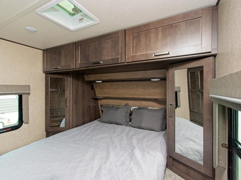 The front private bedroom includes a walk-around queen bed, dual wardrobes, and an additional wardrobe with drawers. Plus, it's washer/dryer prepped, making long-term stays even more convenient.