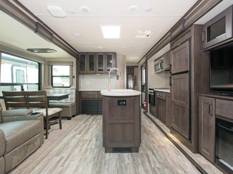 Unwind in the rear living area featuring a tri-fold sofa, theater seating with cupholders, and a booth or optional free-standing dinette—perfect for movie nights by the fireplace and 40" LED HDTV. The hutch with overhead cabinets adds extra storage and style to your kitchen space.