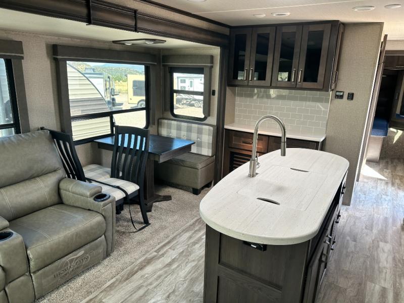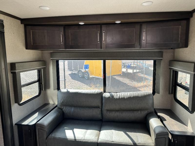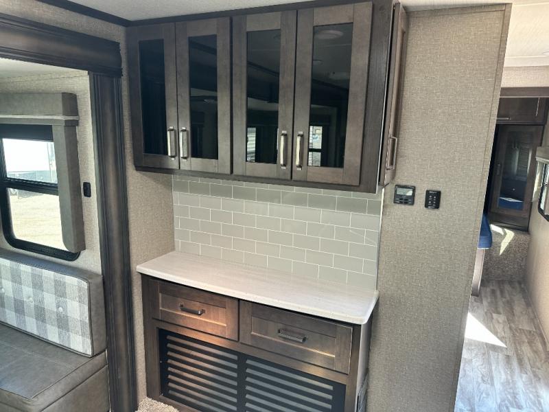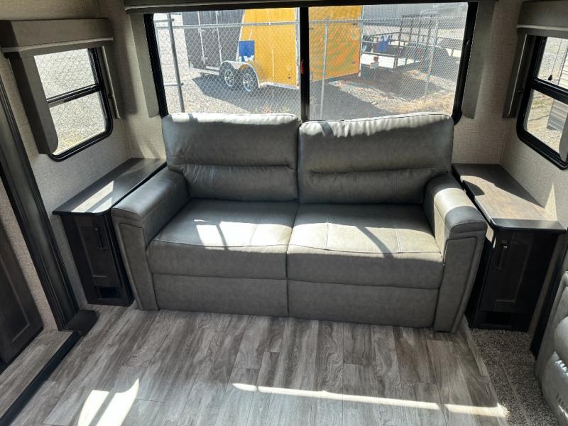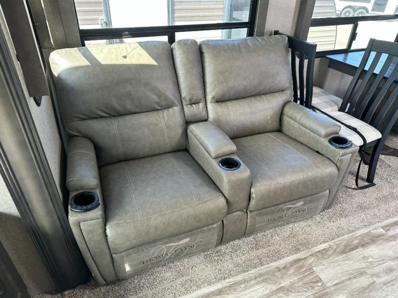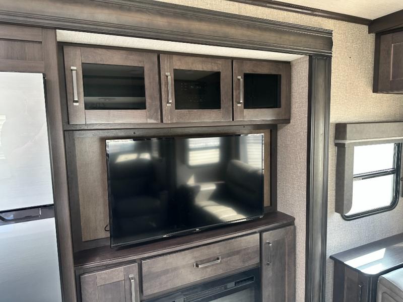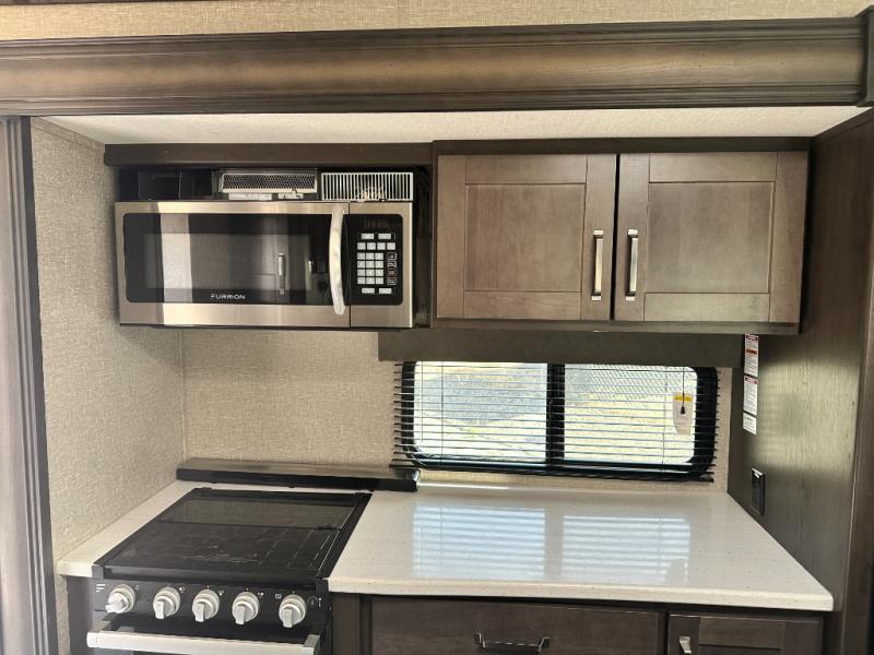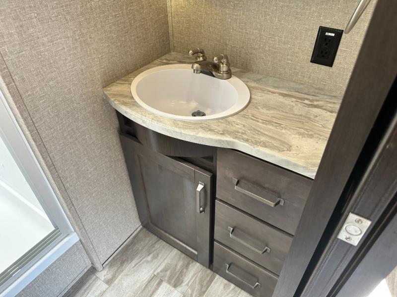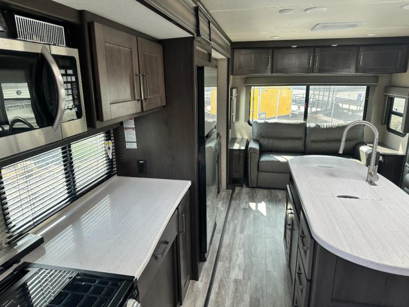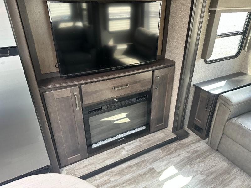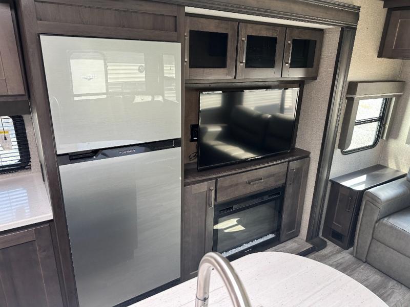 Whether you travel to explore or relax, this trailer will give you the choice depending where you park it! The outside kitchen provides another place to make meals when you want to be in the outdoors, and the inside kitchen amenities offer a gourmet kitchen including a 10 cu. ft. refrigerator, an island, and a hutch. You and your guests will find theatre seating with cupholders, a booth dinette or choose a free standing dinette option, and a tri-fold sofa to sit on and visit while you watch the 40" LED HDTV with fireplace below. The full bathroom includes a space savings sliding door and linen storage, and the bedroom gives you a front walk-around queen bed with storage for your clothes on each side, plus there is an additional wardrobe with drawers and the option to add a washer/dryer to the prepped space.