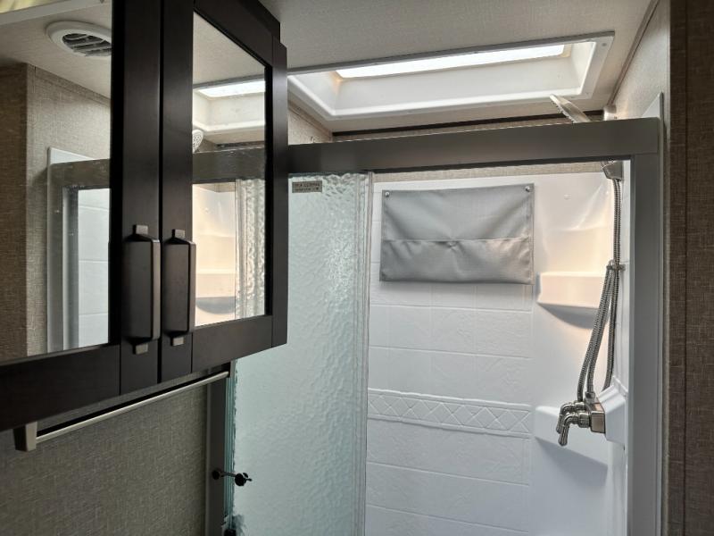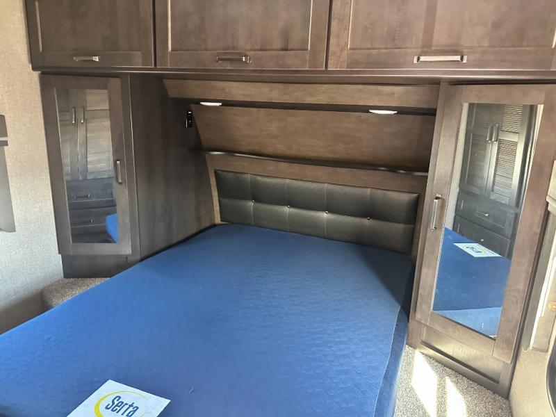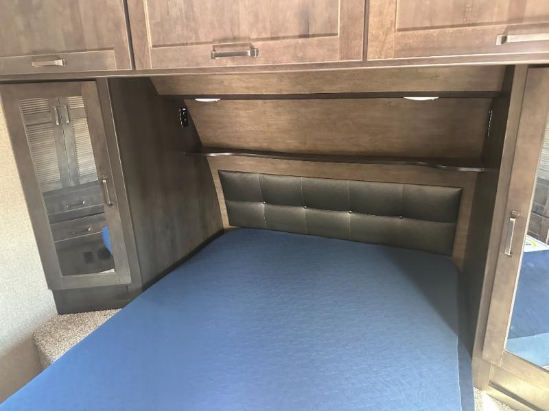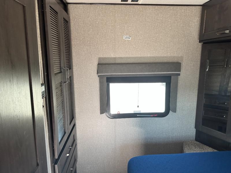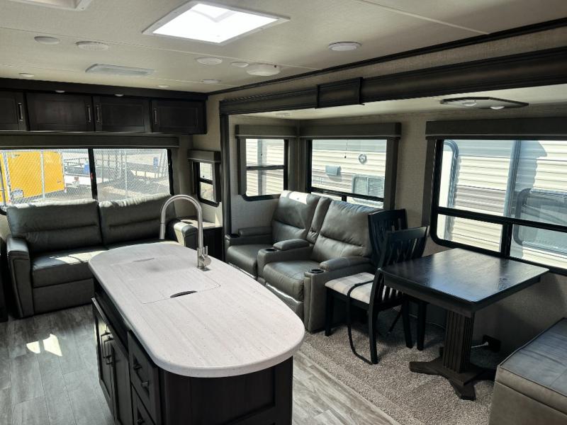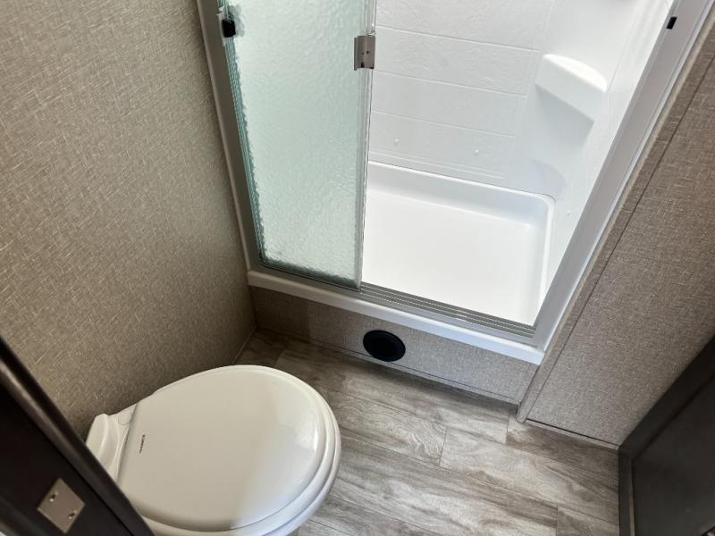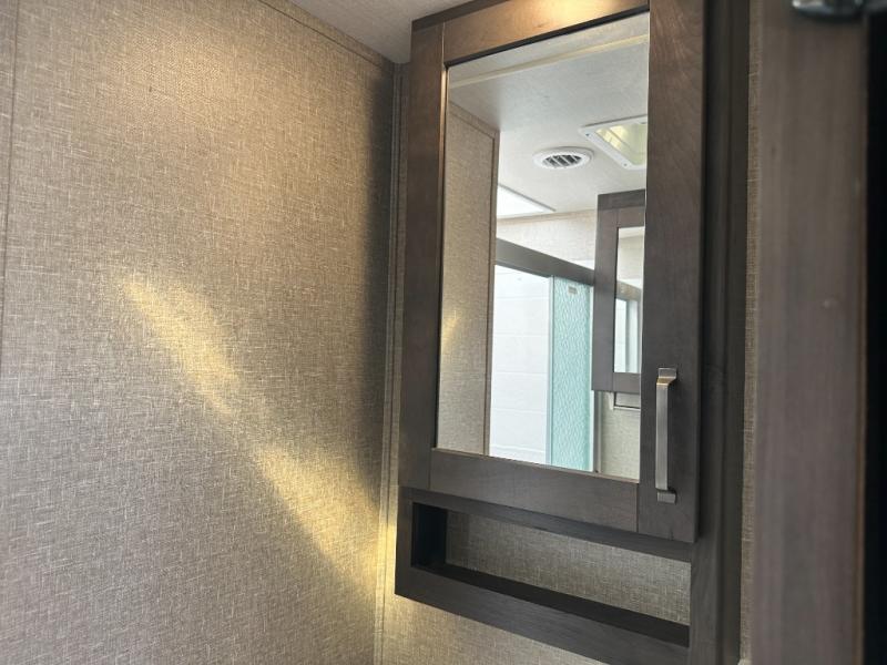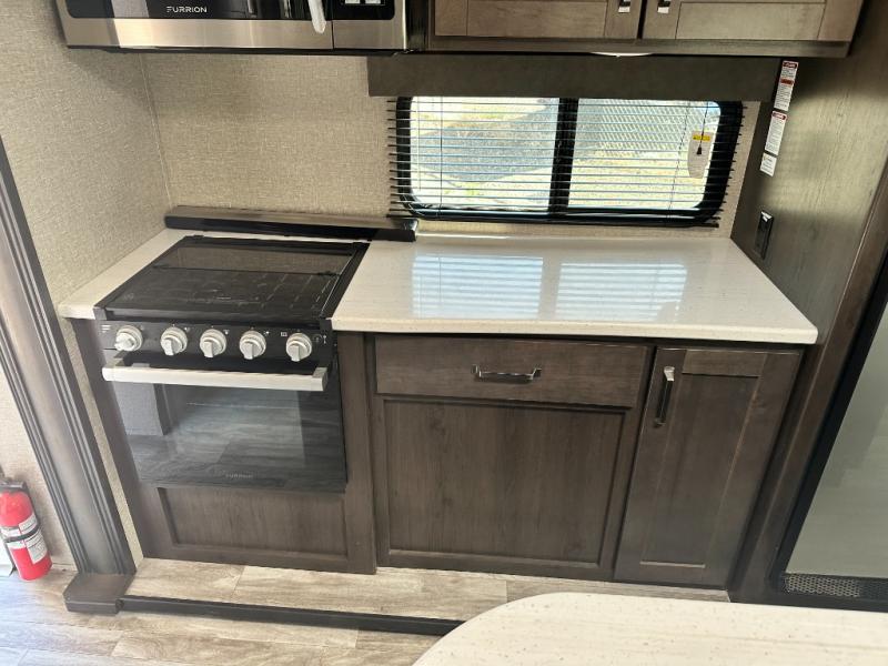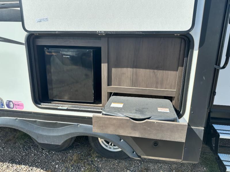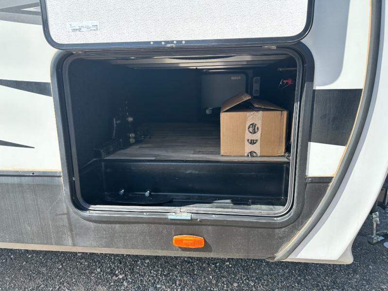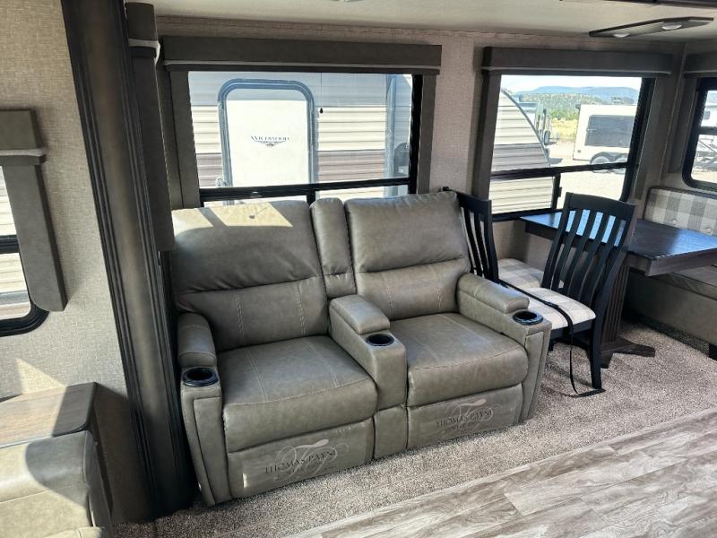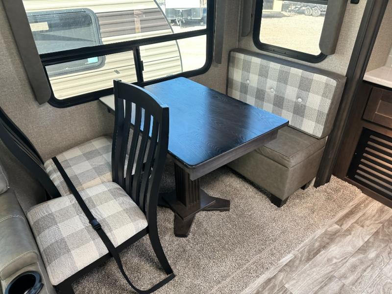 Whether you travel to explore or relax, this trailer will give you the choice depending where you park it! The outside kitchen provides another place to make meals when you want to be in the outdoors, and the inside kitchen amenities offer a gourmet kitchen including a 10 cu. ft. refrigerator, an island, and a hutch. You and your guests will find theatre seating with cupholders, a booth dinette or choose a free standing dinette option, and a tri-fold sofa to sit on and visit while you watch the 40" LED HDTV with fireplace below. The full bathroom includes a space savings sliding door and linen storage, and the bedroom gives you a front walk-around queen bed with storage for your clothes on each side, plus there is an additional wardrobe with drawers and the option to add a washer/dryer to the prepped space.