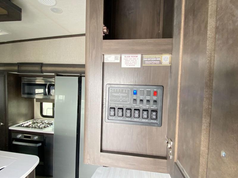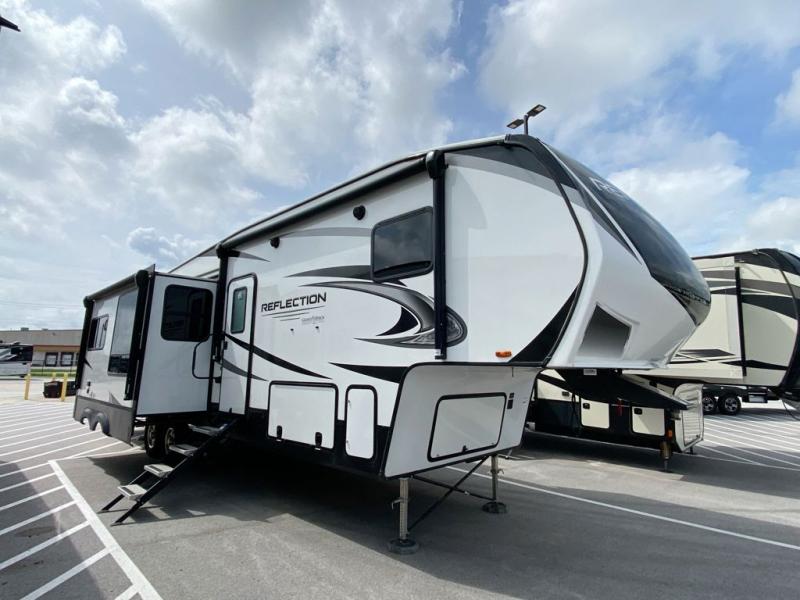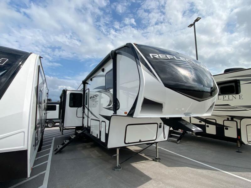 With any Reflection fifth wheels by Grand Design, you will have a 165W solar panel for off-grid camping and a 50 Amp charge controller and inverter prep, a Max Turn radius front cap for easy towing around town and into your campsite, a Universal All-In-One Docking Station, unobstructed pass-through storage, and Goodyear E-rated tires. Some other top features include a chef's kitchen with a 30" stainless steel microwave and residential cooktop, a USB charging station, and the ductless "Evenflow" heating system with no vents in the floor to collect debris. Each is constructed of high gloss gel coat exterior sidewalls, residential 5" truss rafters, walk-on roof decking, a fiberglass and radiant foil roof and front cap insulation plus laminated aluminum framed side walls, rear wall, roof and end walls in slide rooms. Choose luxury, value and towability over all the others, take home a Reflection of your good taste!
