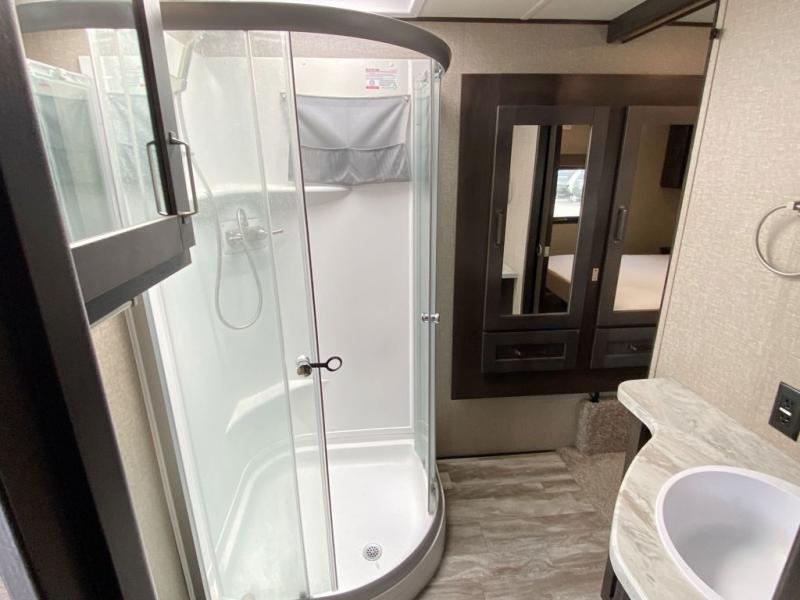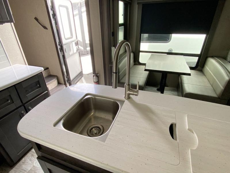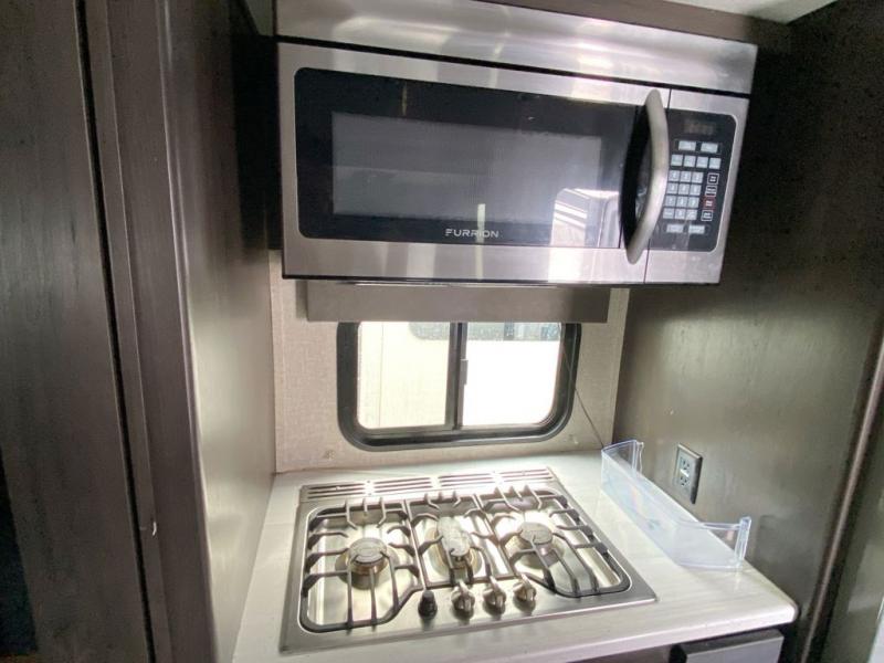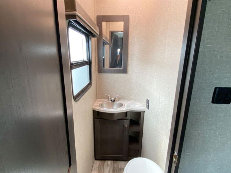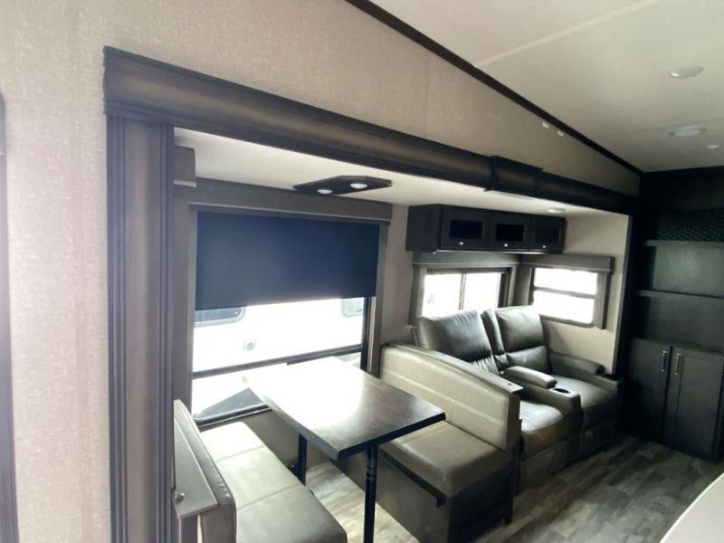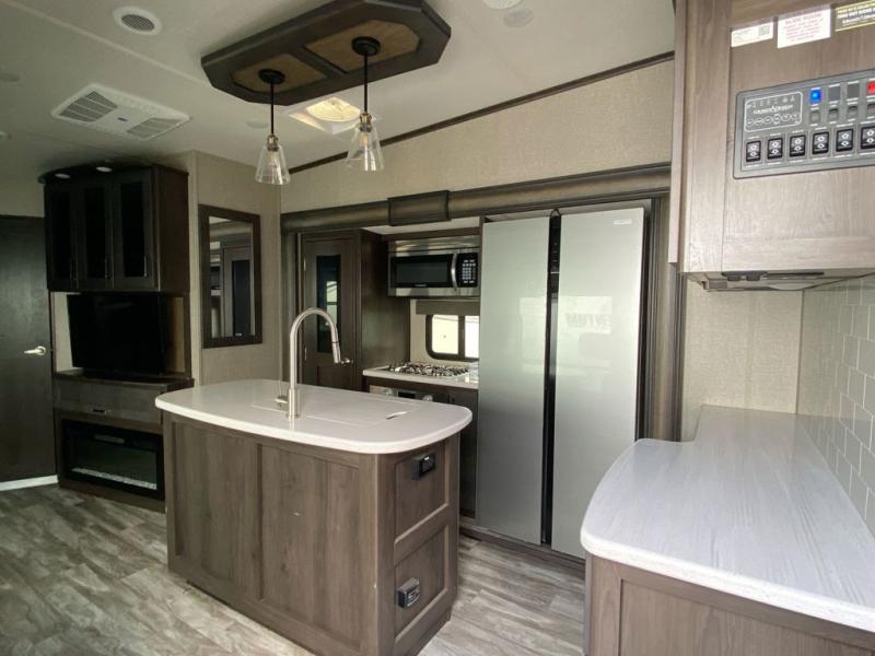 Looking to travel with your family and friends and would like enough space for everyone to be comfortable both during the day and night? Well, step inside using the AXIStep, to find a private bunkhouse in the rear of this fifth wheel which offers a slide out flip bunk above a tri-fold sofa, a bunk bed and storage on the opposite side, its very own private half bathroom, and a large rear window for great views. The theater seating or choose the tri-fold sofa option is a great place to unwind at night in front of the entertainment center with a 40" LED HDTV and fireplace below it. There is a booth dinette or choose a free standing dinette option to dine at, and the kitchen island has a deep, seated stainless steel sink with a high rise faucet with a pull down sprayer to make clean up a breeze too. You will find full amenities including a 16 cu. ft. refrigerator and a hutch. Up the interior steps, you will have a double entry bathroom with a radius shower with a skylight, and you can wake up refreshed each morning after sleeping on your own queen bed.