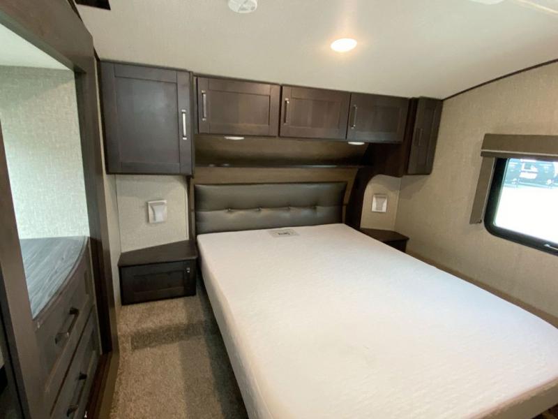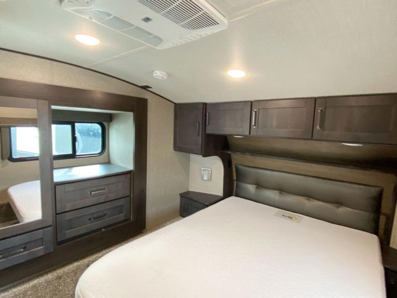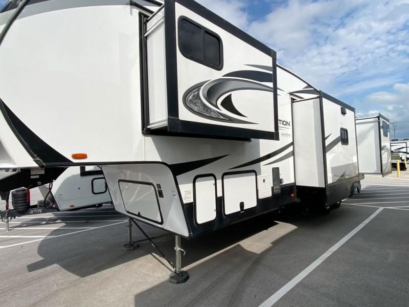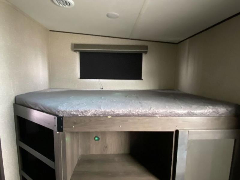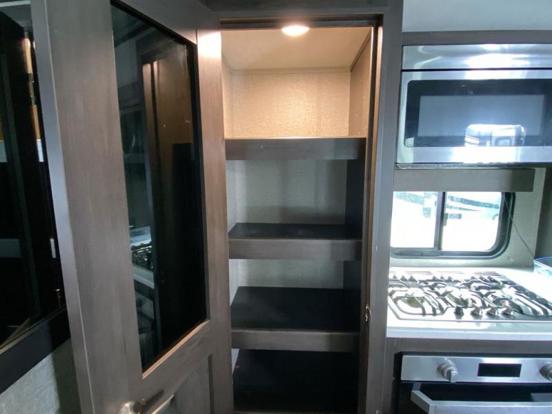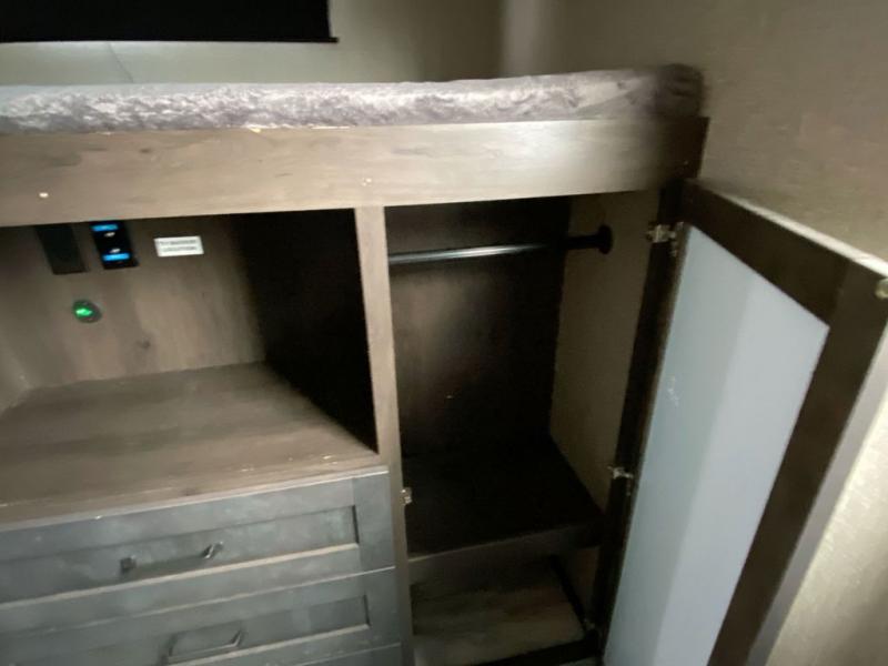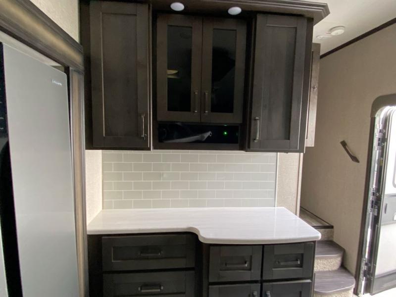 Looking to travel with your family and friends and would like enough space for everyone to be comfortable both during the day and night? Well, step inside using the AXIStep, to find a private bunkhouse in the rear of this fifth wheel which offers a slide out flip bunk above a tri-fold sofa, a bunk bed and storage on the opposite side, its very own private half bathroom, and a large rear window for great views. The theater seating or choose the tri-fold sofa option is a great place to unwind at night in front of the entertainment center with a 40" LED HDTV and fireplace below it. There is a booth dinette or choose a free standing dinette option to dine at, and the kitchen island has a deep, seated stainless steel sink with a high rise faucet with a pull down sprayer to make clean up a breeze too. You will find full amenities including a 16 cu. ft. refrigerator and a hutch. Up the interior steps, you will have a double entry bathroom with a radius shower with a skylight, and you can wake up refreshed each morning after sleeping on your own queen bed.