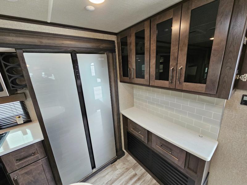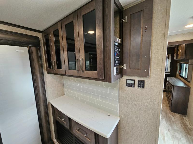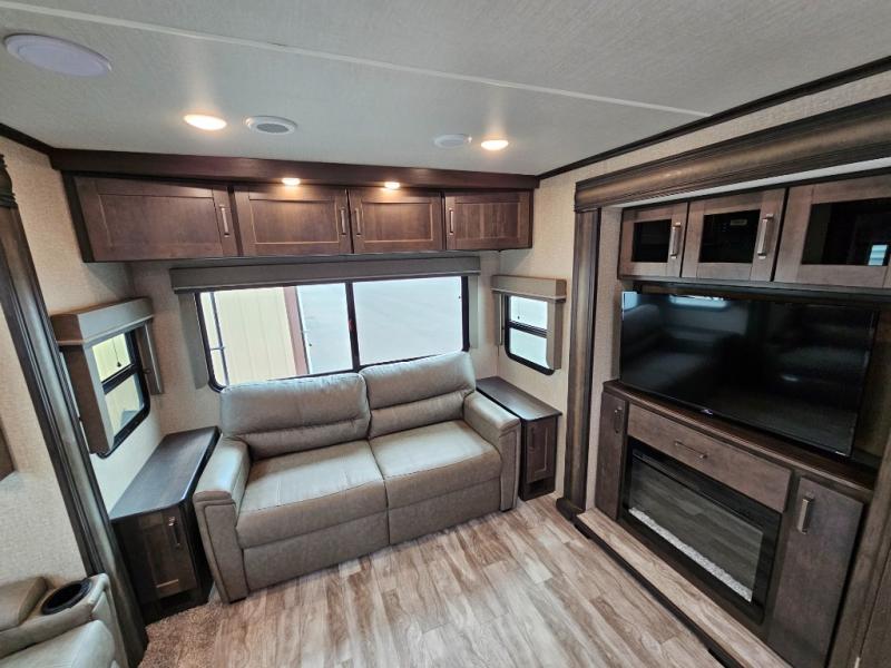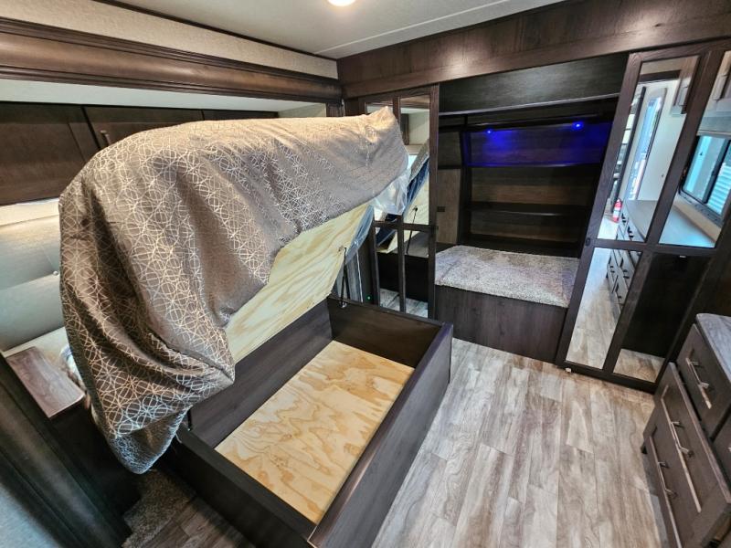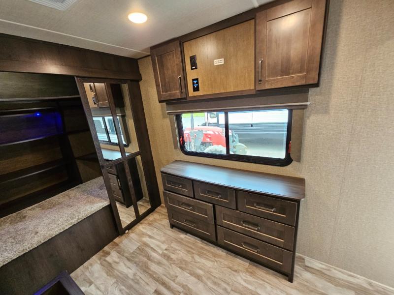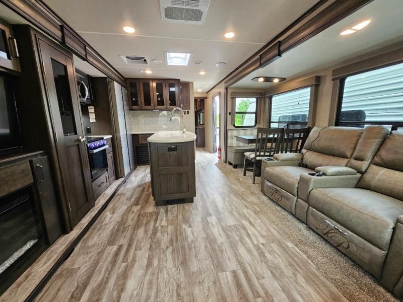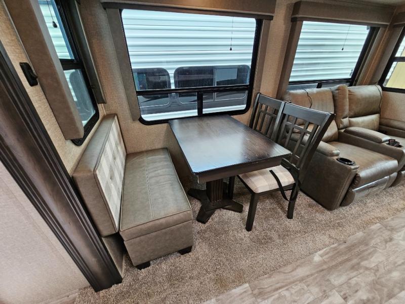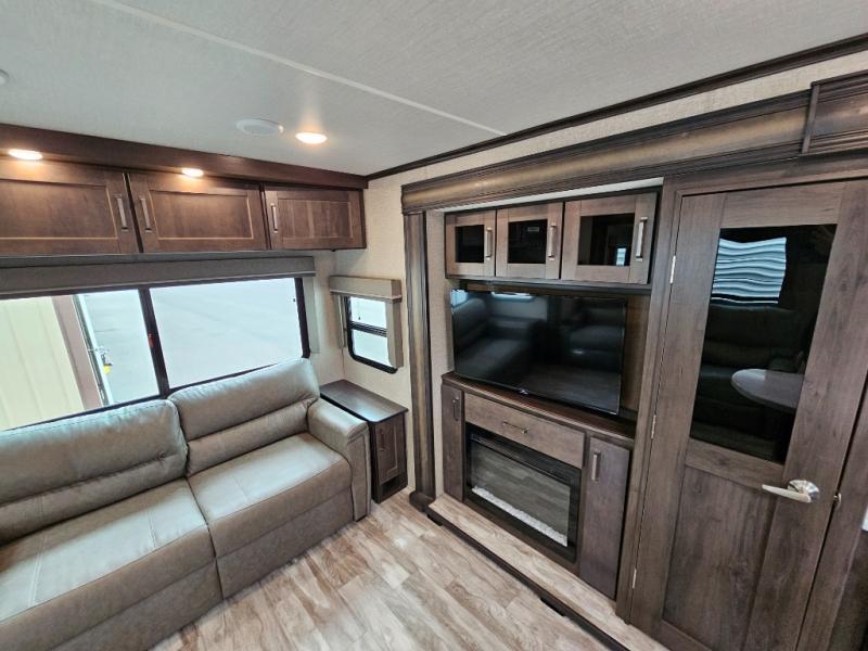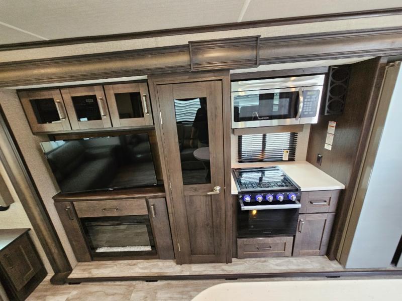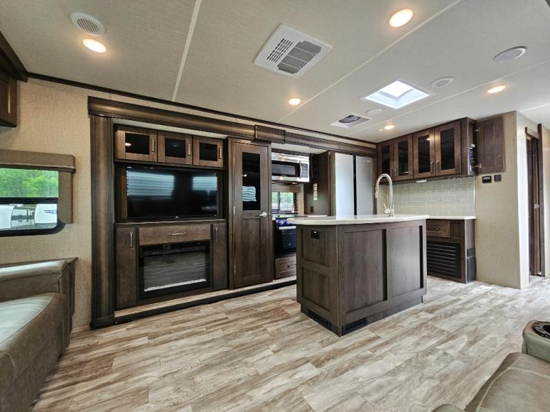 The chef of the group will love the gourmet kitchen including the 16 cu. ft. refrigerator that will hold lots of cold ingredients, beverages and leftovers, the center island when preparing and serving meals, and the hutch with overhead cabinets to display decor and store dishes and such. This area also includes two slide outs for more floor space and furniture to relax on including theatre seating with cupholders for your drinks, a booth dinette to dine at and work from or choose a free standing dinette option, and a rear tri-fold sofa that offers sleeping space for two at night. There is a 40" LED HDTV with fireplace below to enjoy while inside, plus there are two awnings outdoors to relax under. When you are ready to call it a night, get cleaned up in the full bathroom, and retire to your front bedroom with a slide out queen bed or choose a king option, a front full-wall wardrobe with washer/dryer prep, a dresser and an additional wardrobe with drawers.