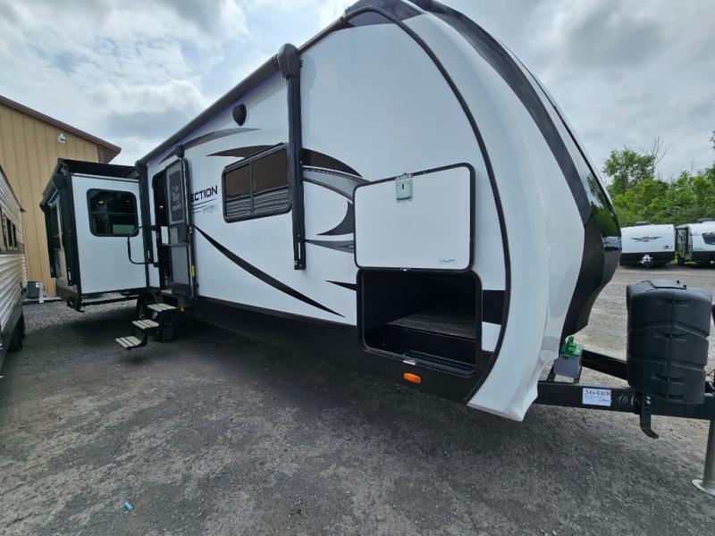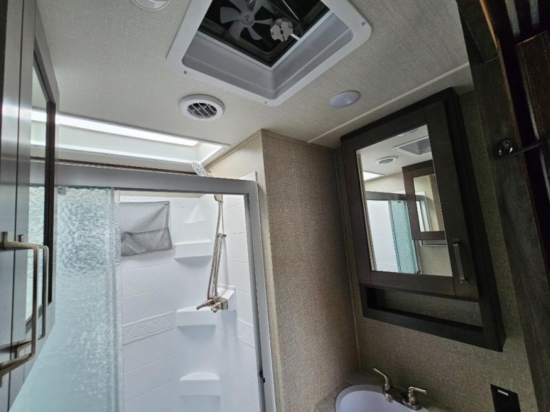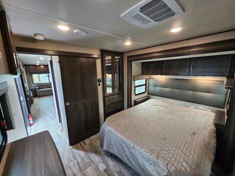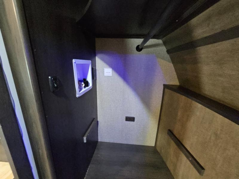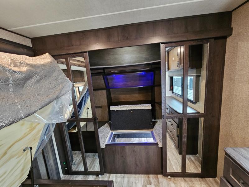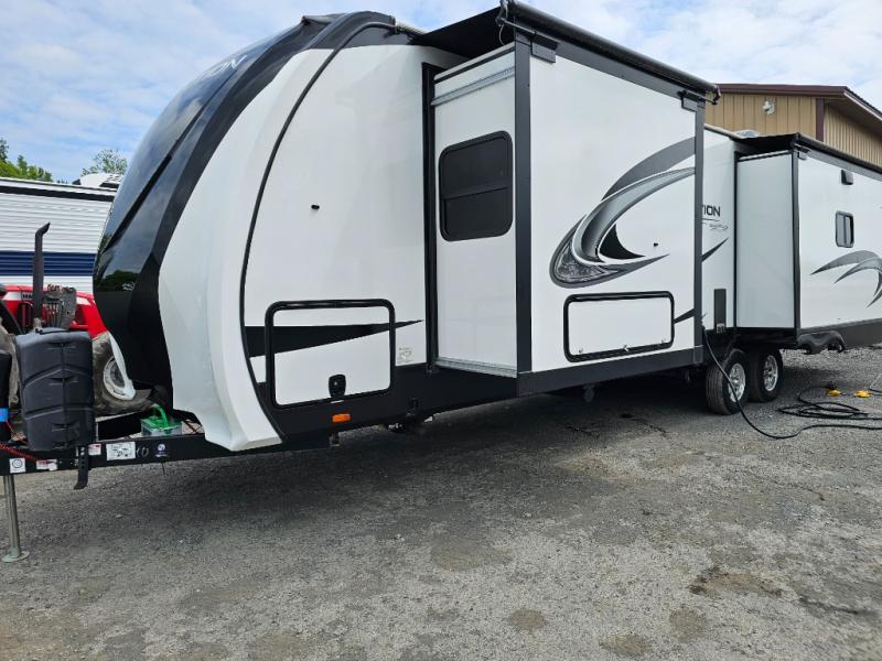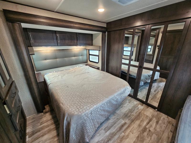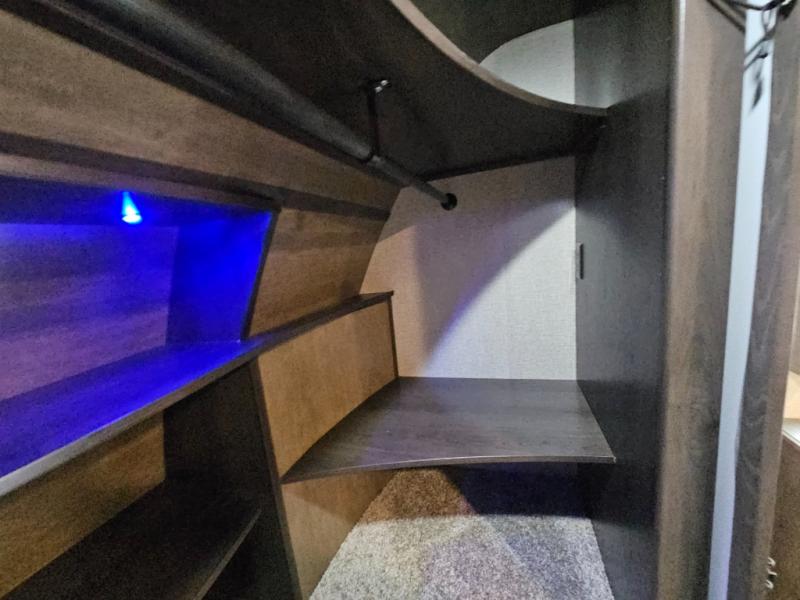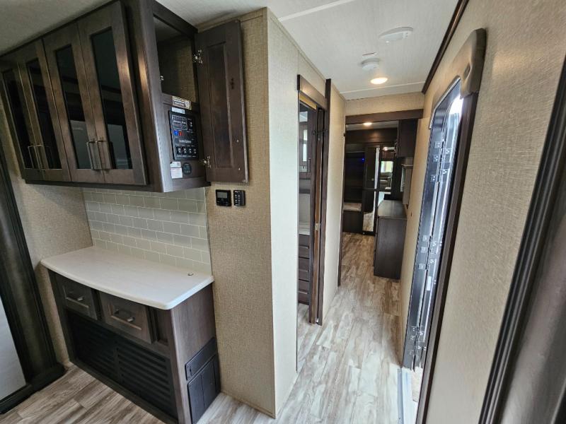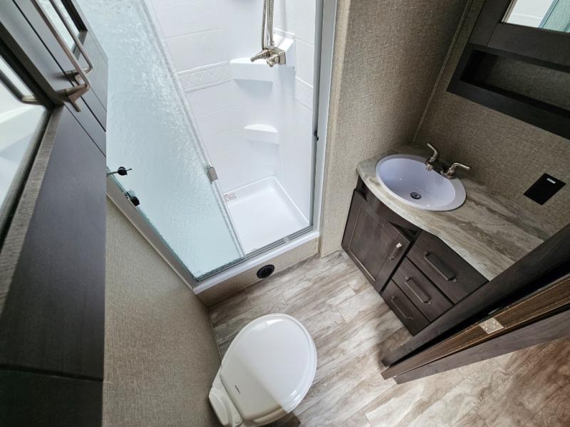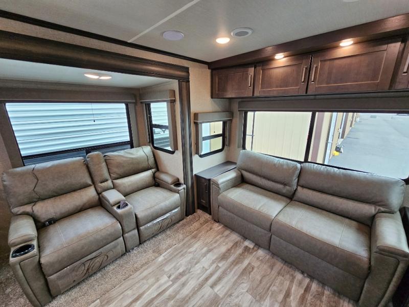 The chef of the group will love the gourmet kitchen including the 16 cu. ft. refrigerator that will hold lots of cold ingredients, beverages and leftovers, the center island when preparing and serving meals, and the hutch with overhead cabinets to display decor and store dishes and such. This area also includes two slide outs for more floor space and furniture to relax on including theatre seating with cupholders for your drinks, a booth dinette to dine at and work from or choose a free standing dinette option, and a rear tri-fold sofa that offers sleeping space for two at night. There is a 40" LED HDTV with fireplace below to enjoy while inside, plus there are two awnings outdoors to relax under. When you are ready to call it a night, get cleaned up in the full bathroom, and retire to your front bedroom with a slide out queen bed or choose a king option, a front full-wall wardrobe with washer/dryer prep, a dresser and an additional wardrobe with drawers.