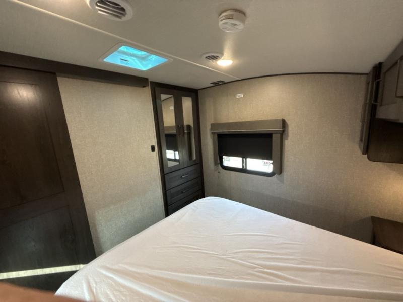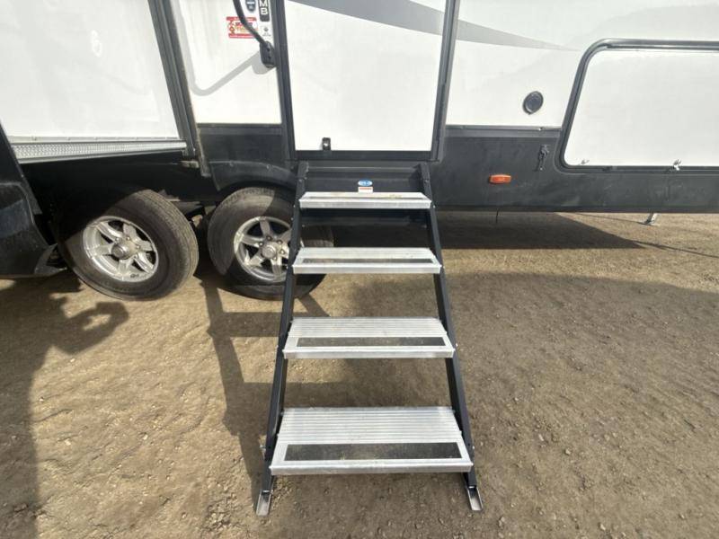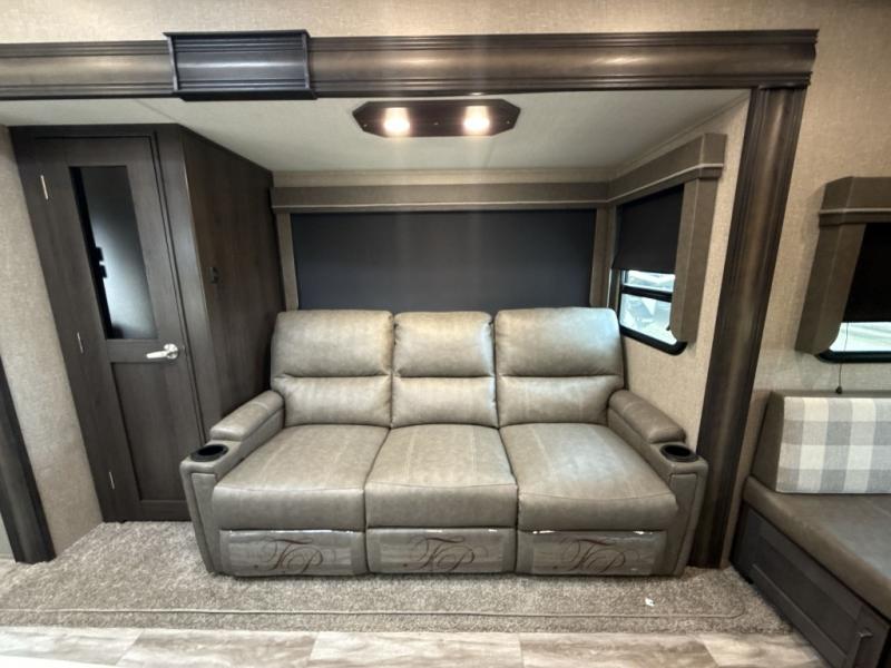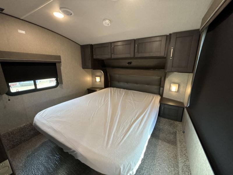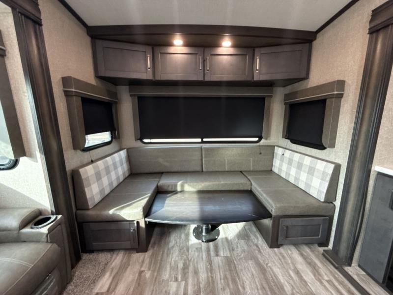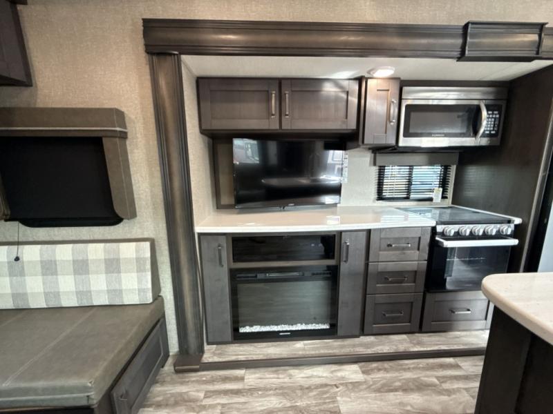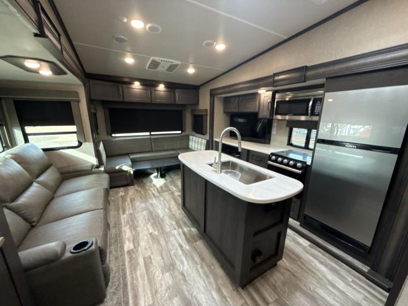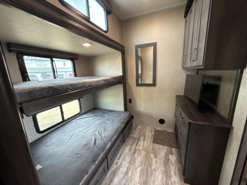 Get ready to enjoy the great outdoors with your family and friends with this fifth wheel at your favorite campsite! The middle bunkhouse with two bunk beds and drawer storage below within a slide and the dresser make this a popular space for guests. Everyone can share the full bathroom which offers linen storage and a space savings door, and you will have your own front bedroom with a queen bed and clothing storage. The main living and kitchen area offers dual slides for maximum floor space, a three person theatre seating, a U-shaped lounge with table to dine at, and an island that the cook will love. You will also find a gourmet kitchen and a 10 cu. ft. refrigerator, plus a pantry for all the goodies. And outside you can stow some beverages in the 1.6 cu. ft. refrigerator and relax under the 18' electric awning.