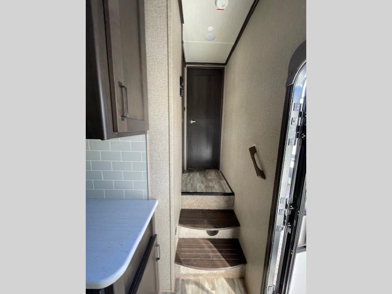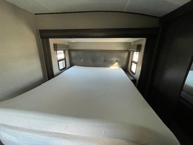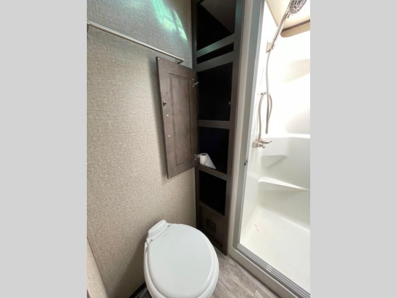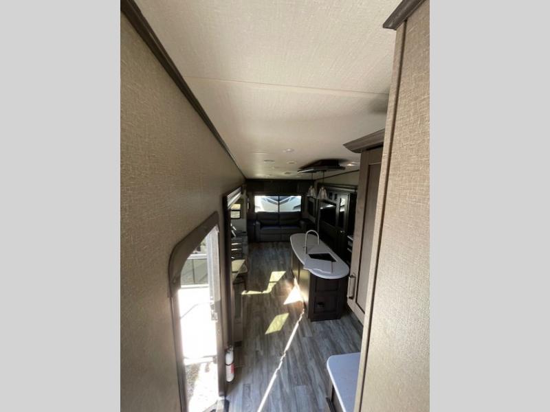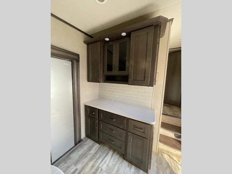 You can enjoy a spacious rear living area in this RV with dual opposing slides offering you entertainment, kitchen amenities, seating and windows for great views! The rear tri-fold sofa also converts into extra sleeping space for an extra guest or two, just like the booth dinette does. Yet you might like to add the free standing dinette option. There are theatre seats to enjoy while you place your drinks in the cupholders and watch the entertainment center with a 40" LED HDTV and fireplace. The pantry is big enough to store your favorite snacks, and the kitchen island will make meal prepping easier, plus there is a 16 cu. ft. refrigerator to store any leftovers. The full bathroom has a 30" x 48" fiberglass shower with a skylight above for natural lighting as you get ready and a linen closet to store your towels. The front private bedroom has a comfortable queen bed slide that can be switched out for the optional king bed, a dresser with overhead cabinets, and a full wall wardrobe that is prepped to add the optional washer and dryer so that you can extend your camping trip with clean clothes!