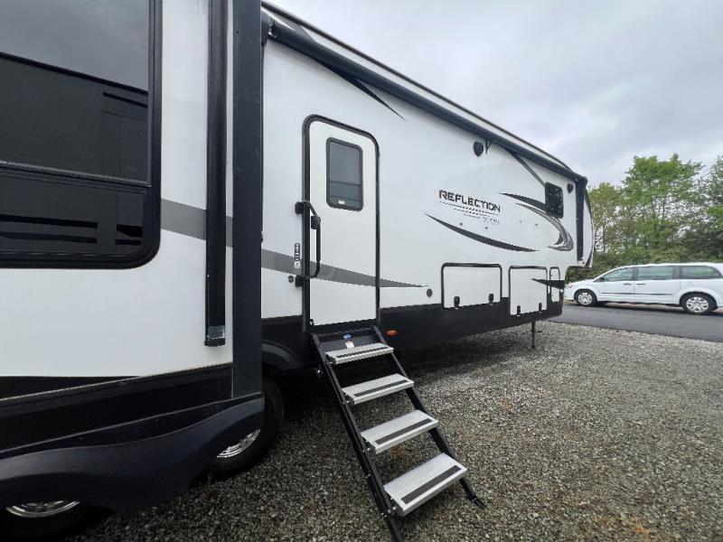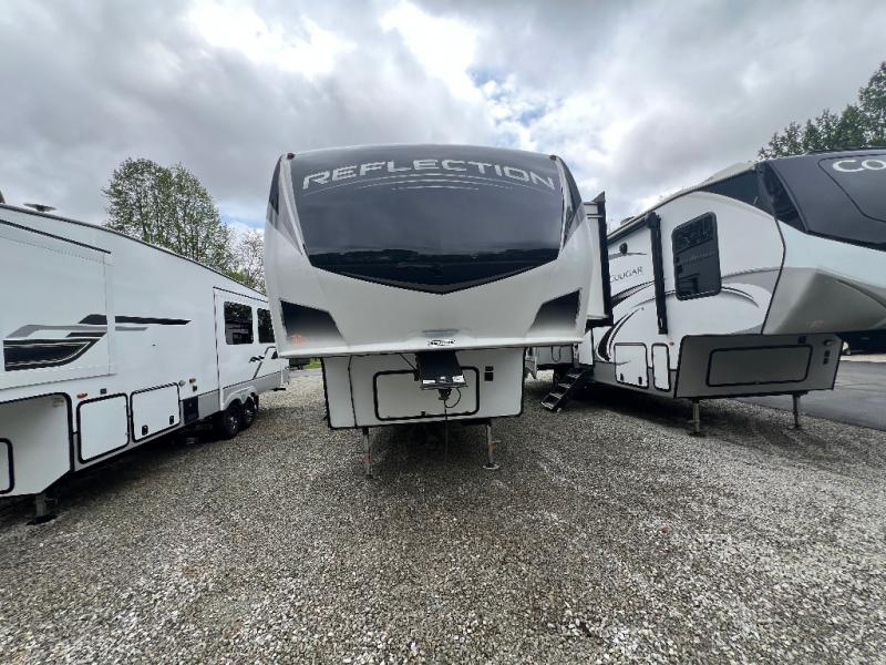 With any Reflection fifth wheels by Grand Design, you will have a 165W solar panel for off-grid camping and a 50 Amp charge controller and inverter prep, a Max Turn radius front cap for easy towing around town and into your campsite, a Universal All-In-One Docking Station, unobstructed pass-through storage, and Goodyear E-rated tires. Some other top features include a chef's kitchen with a 30" stainless steel microwave and residential cooktop, a USB charging station, and the ductless "Evenflow" heating system with no vents in the floor to collect debris. Each is constructed of high gloss gel coat exterior sidewalls, residential 5" truss rafters, walk-on roof decking, a fiberglass and radiant foil roof and front cap insulation plus laminated aluminum framed side walls, rear wall, roof and end walls in slide rooms. Choose luxury, value and towability over all the others, take home a Reflection of your good taste!
