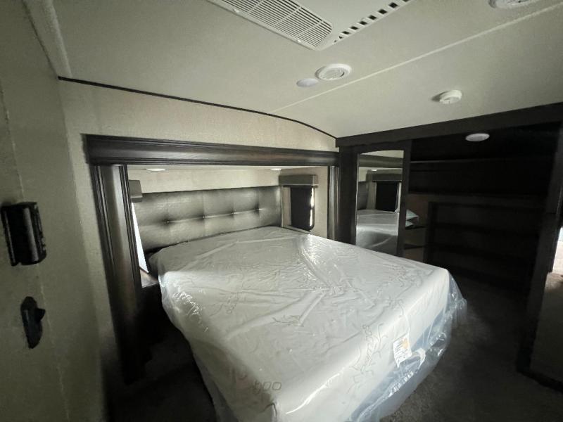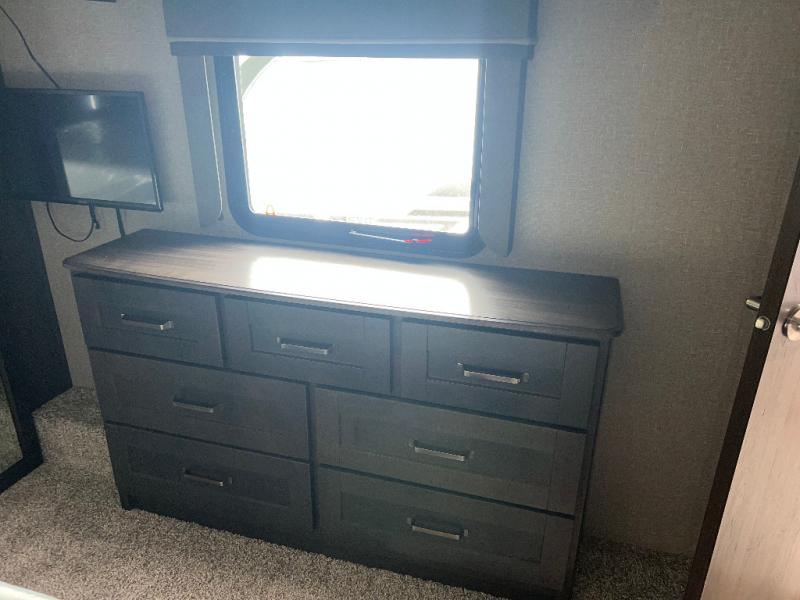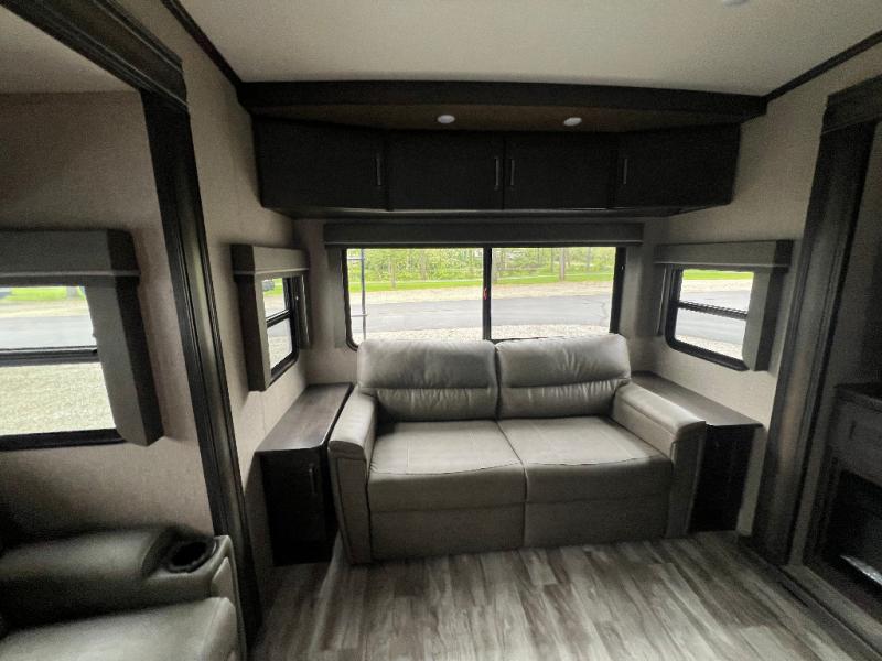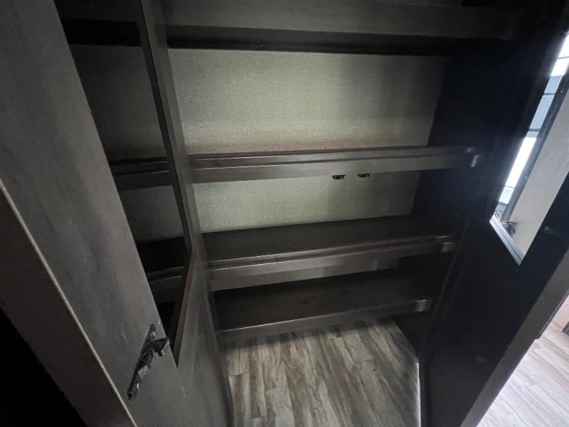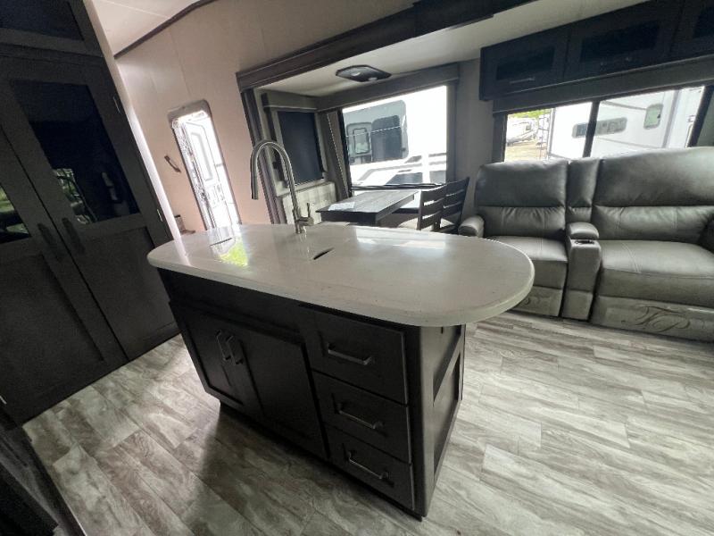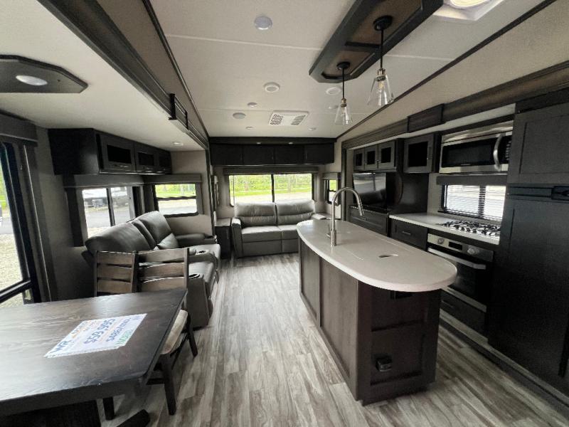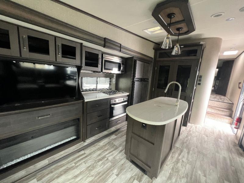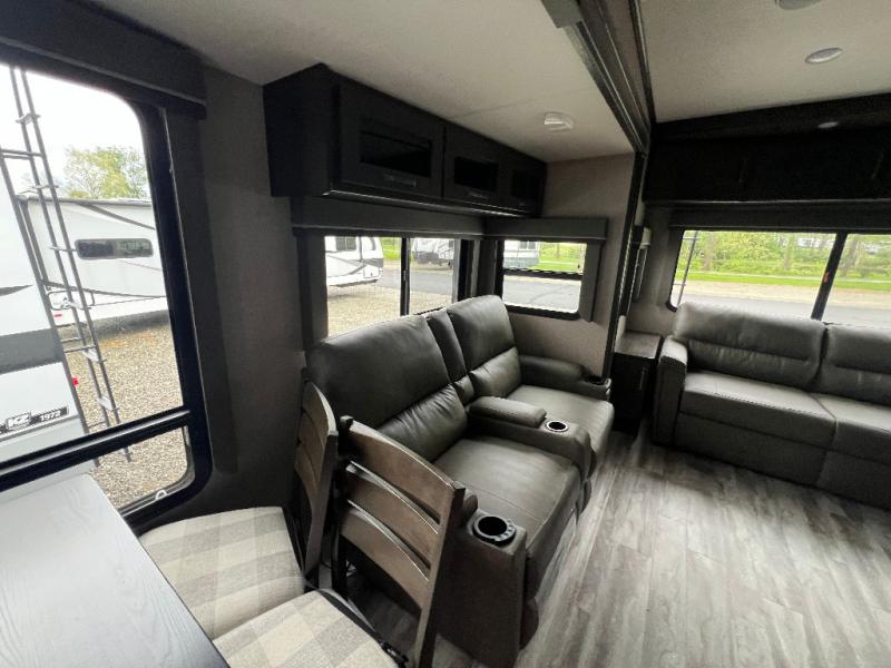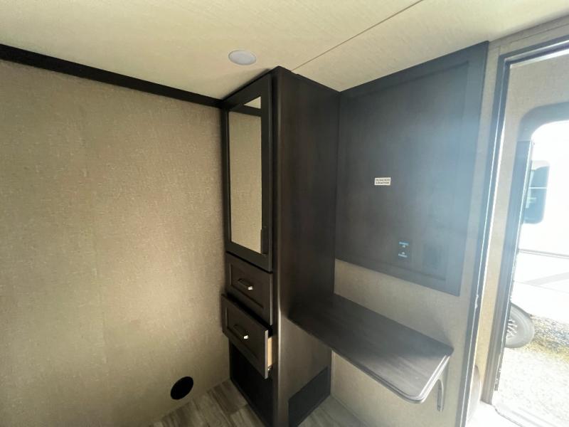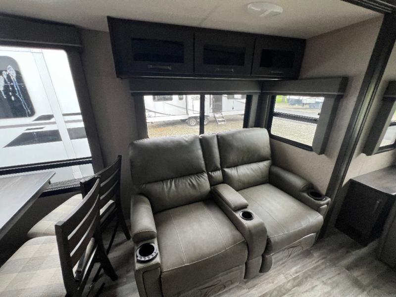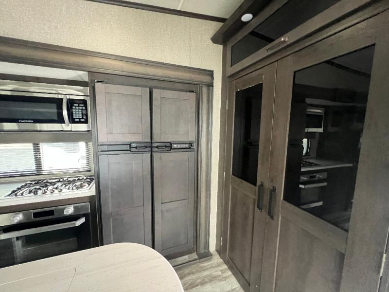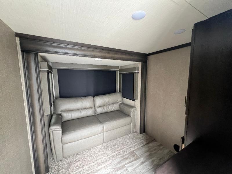 Travel to see new state parks, RV resorts or your family in other states as you tow this fifth wheel to each destination to enjoy comfort and convenience, plus a place to work and be able to offer extra sleeping space for friends and family when they visit! The middle extra room provides a tri-fold sofa slide, a desk, a wardrobe, plus a 64" x 88" upper bed loft area with access from the hallway, which provides two different places to accommodate overnight guests. The full bathroom will keep everyone refreshed, and the front bedroom allows you to sleep on a queen bed slide or choose the king option. And you will love the front wardrobe, the dresser, and the option to add a washer/dryer. The main living and kitchen area provides plenty of seating from the rear tri-fold sofa, the booth dinette or choose the free standing dinette option, and the theatre seats with cupholders. And the kitchen island, the appliances, and the large pantry allow you to take everything you need with you.