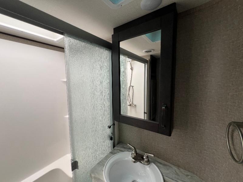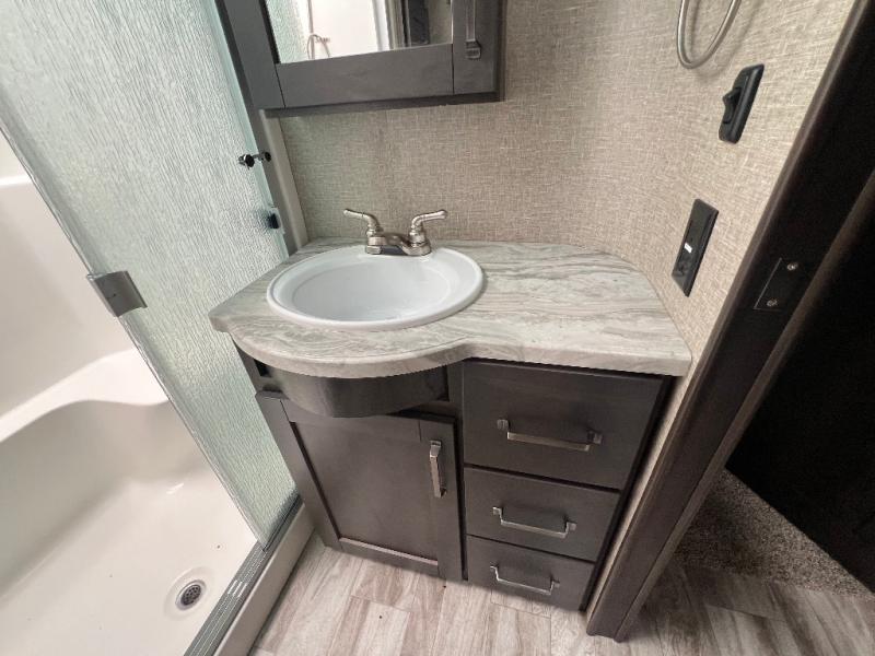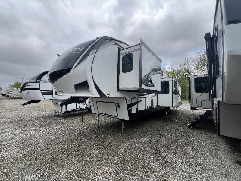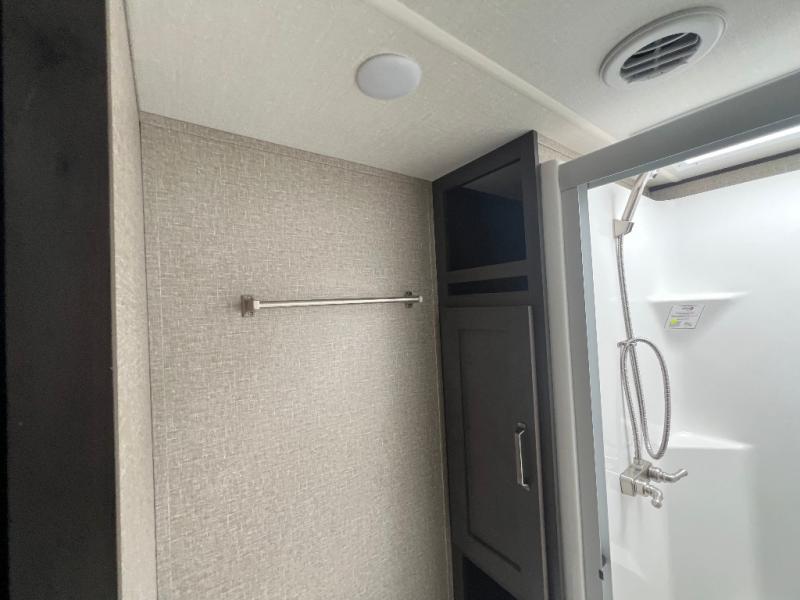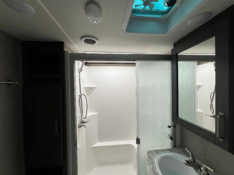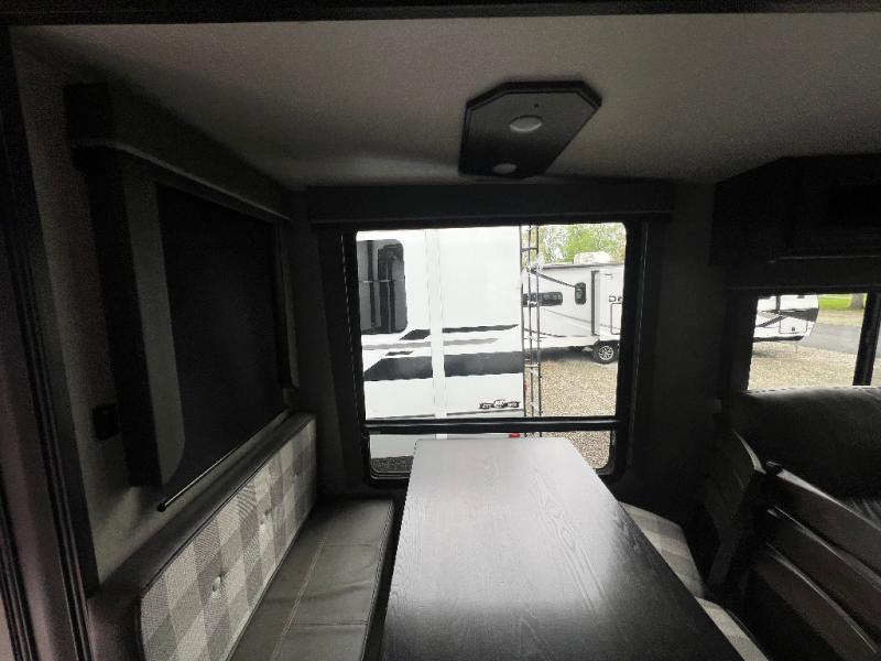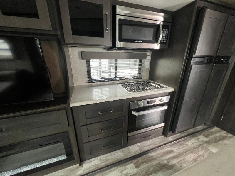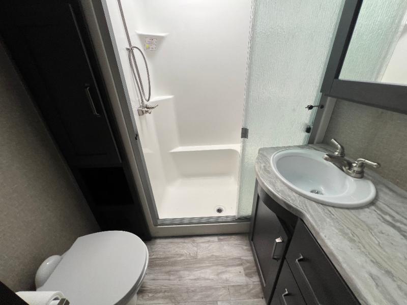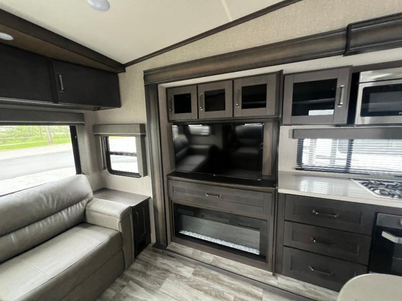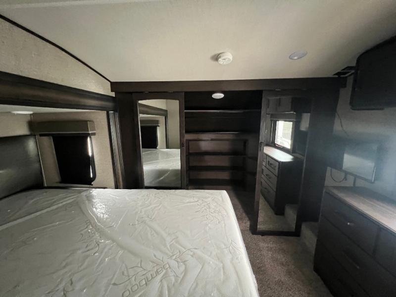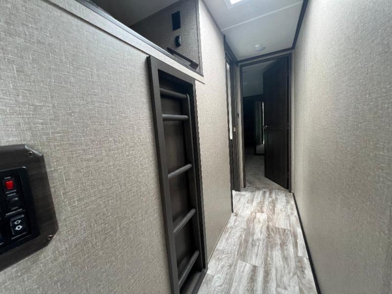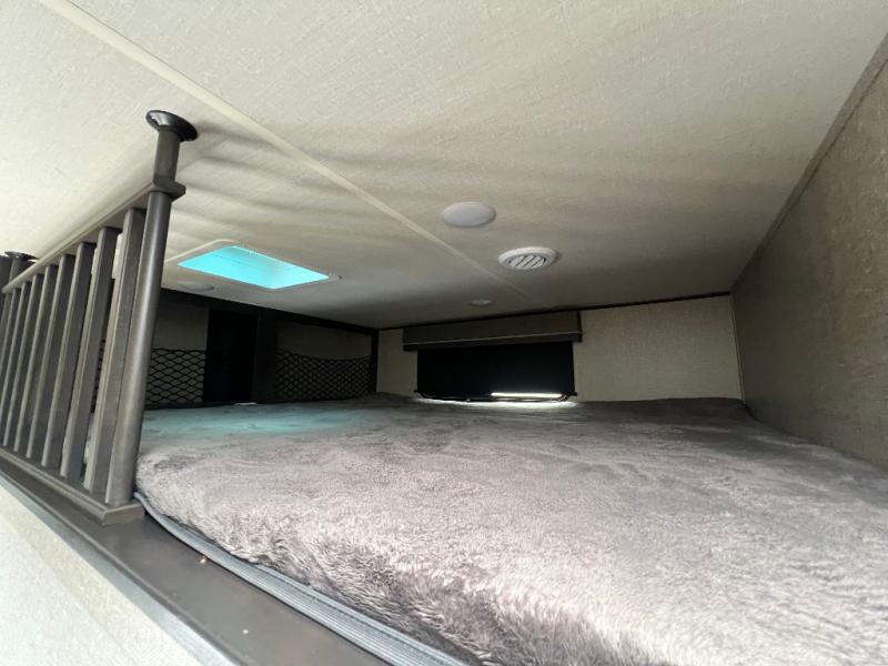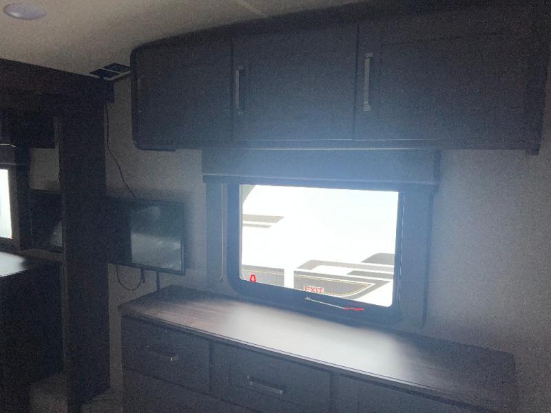 Travel to see new state parks, RV resorts or your family in other states as you tow this fifth wheel to each destination to enjoy comfort and convenience, plus a place to work and be able to offer extra sleeping space for friends and family when they visit! The middle extra room provides a tri-fold sofa slide, a desk, a wardrobe, plus a 64" x 88" upper bed loft area with access from the hallway, which provides two different places to accommodate overnight guests. The full bathroom will keep everyone refreshed, and the front bedroom allows you to sleep on a queen bed slide or choose the king option. And you will love the front wardrobe, the dresser, and the option to add a washer/dryer. The main living and kitchen area provides plenty of seating from the rear tri-fold sofa, the booth dinette or choose the free standing dinette option, and the theatre seats with cupholders. And the kitchen island, the appliances, and the large pantry allow you to take everything you need with you.