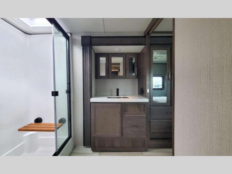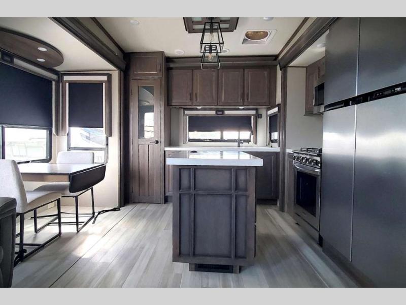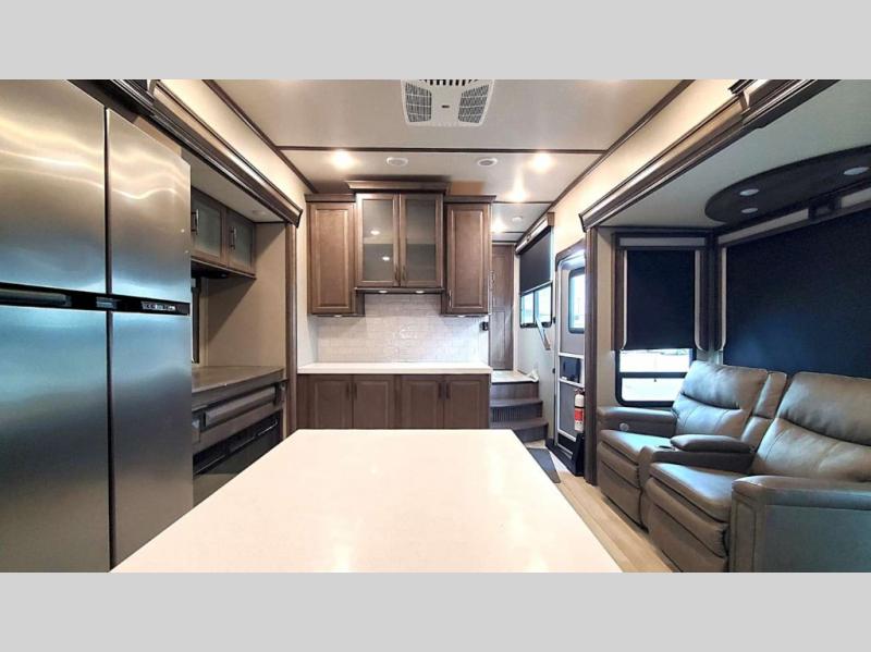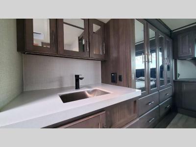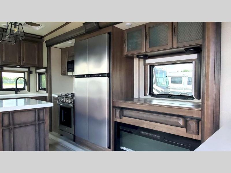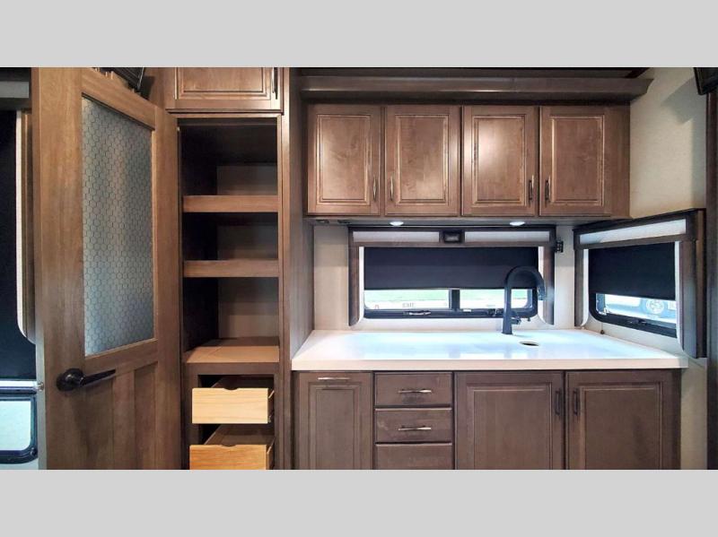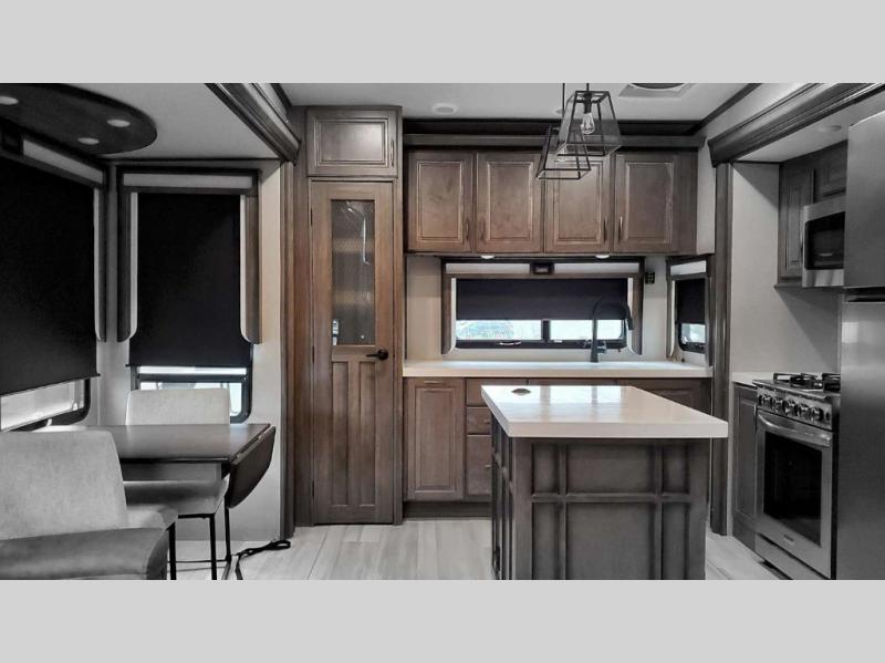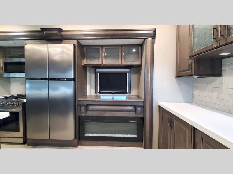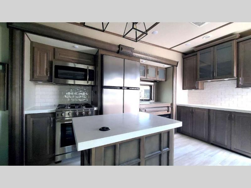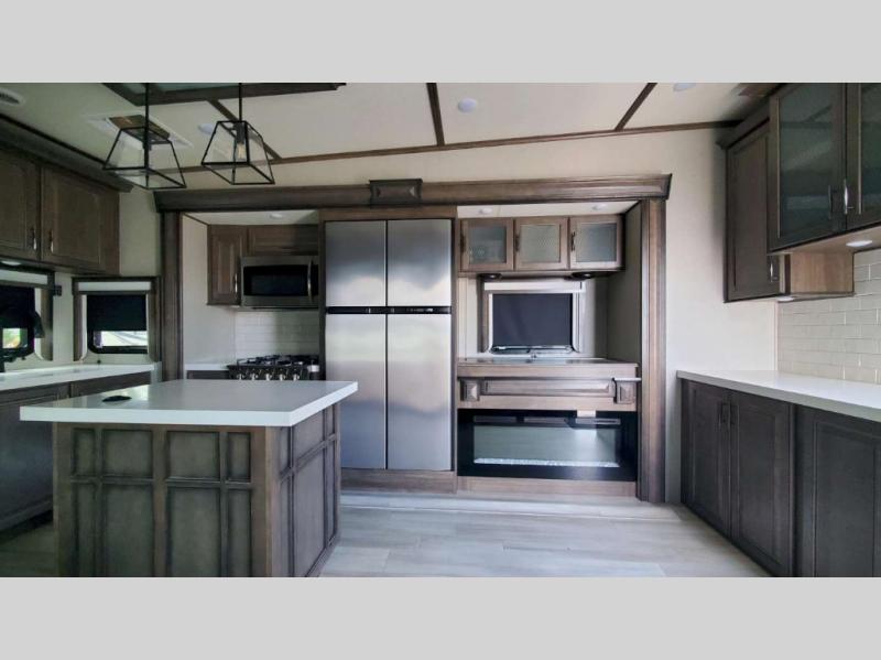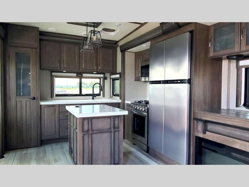 This fifth wheel offers a rear kitchen for the chef in the family to enjoy cooking while away from home! There is extra counter space along the rear wall and an oversized pantry to hold lots of goodies, plus one of the slides in this main living and kitchen area offers a professional-grade stainless steel cooktop with built-in oven, a microwave, a stainless steel 18 cu. ft. four-door refrigerator and a center island with a space to add a dishwasher option. The hutch/buffet give you even more counter and storage space, plus you might like to add a washer/dryer option to keep everything clean. The coat closet is near the entry for quick storage once inside, and the bathroom/bedroom slide provides more storage and the bath sink, plus more floor space in each room. You will sleep like a queen or choose the king option, and be able to watch the 32" LED TV before bedtime.