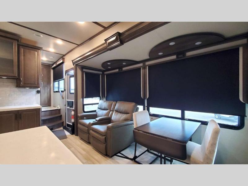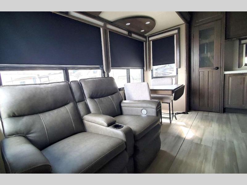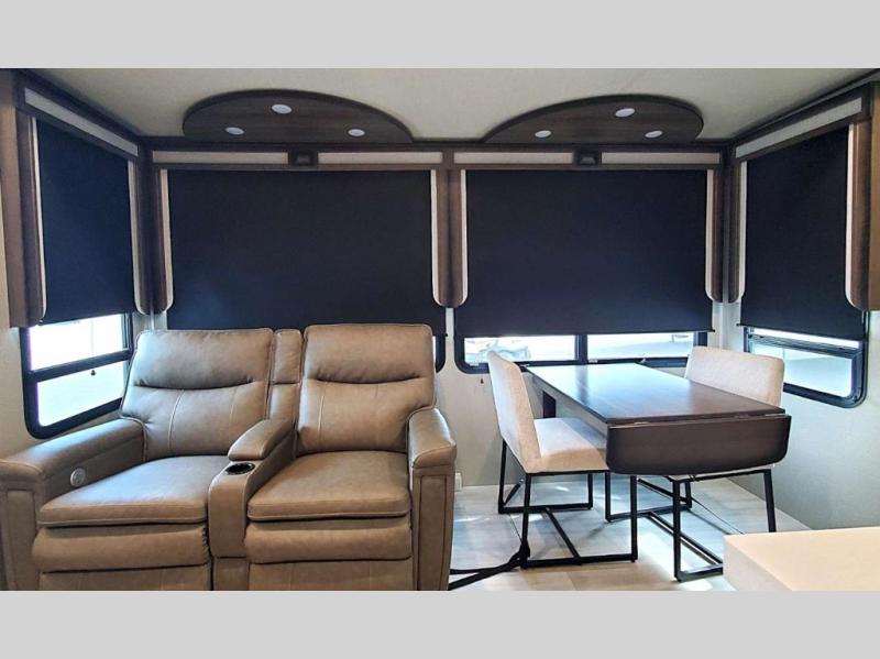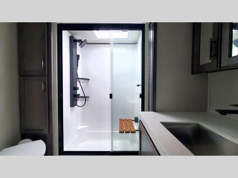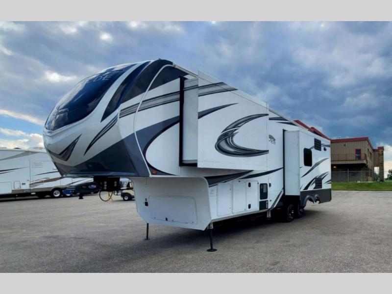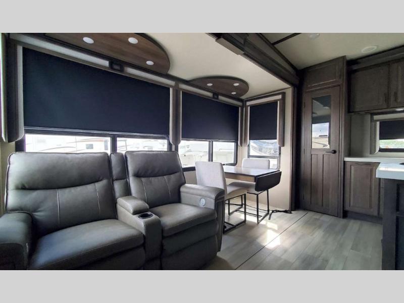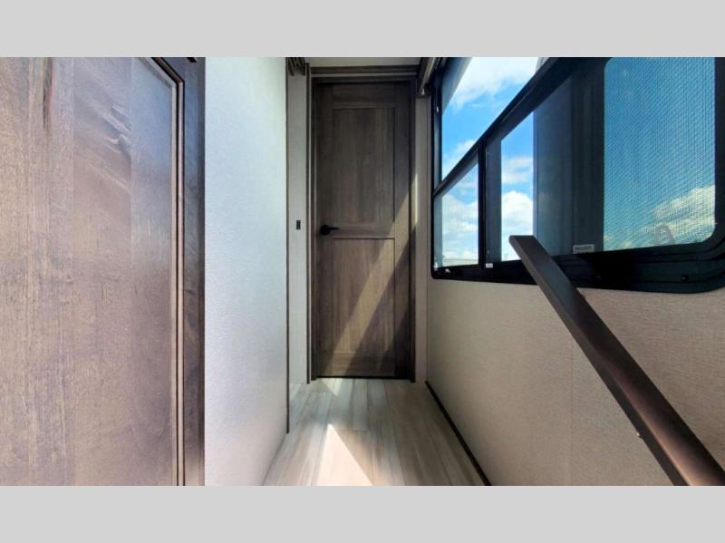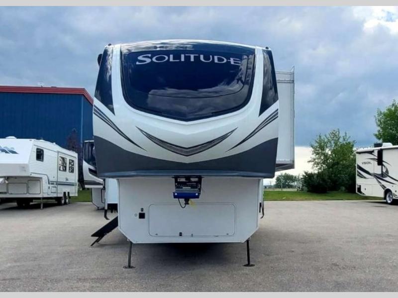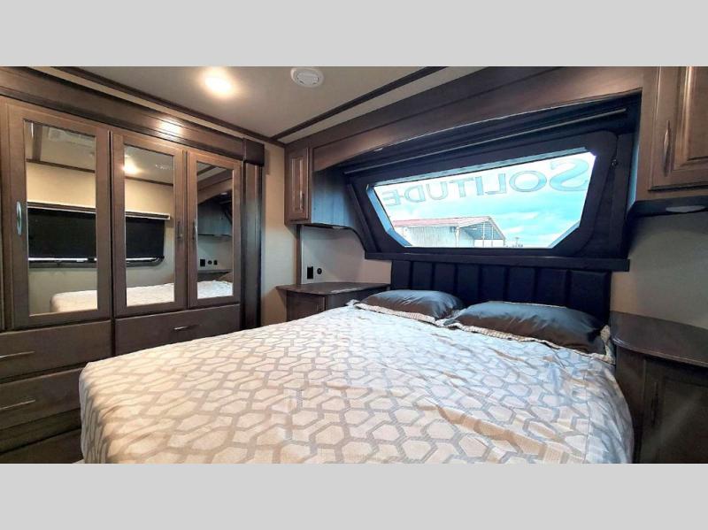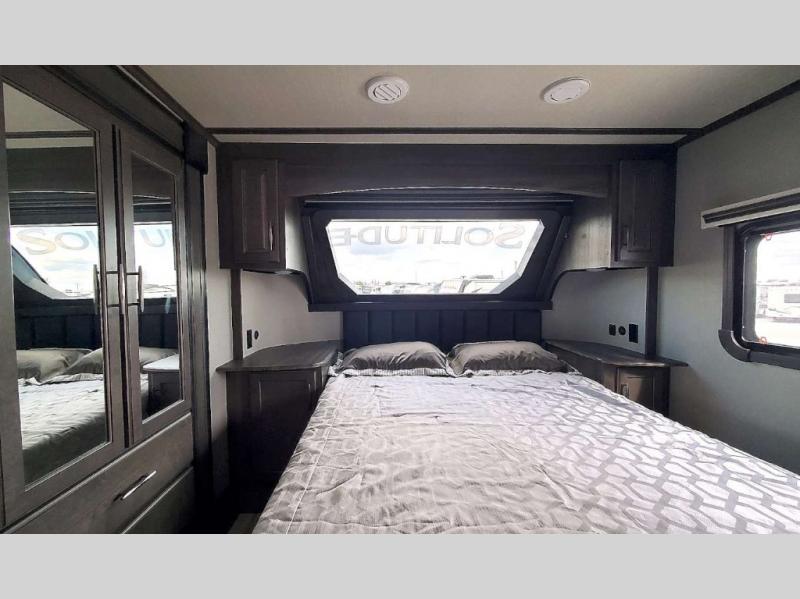 With any Solitude fifth wheel by Grand Design, you will get maximum insulation from the thermal roof design, the exclusive fully laminated walls, the triple insulated main floor, the Rail-Tite underbelly seal, the insulated gooseneck and the insulated baggage doors. The MORryde rubber pin box system utilizes a unique rubber shear spring to positively deal with rough towing and road shock, the Tire Linc TPMS system monitors pressure and temperature, and the 6-point hydraulic system allows you to setup easily. And the upgraded shower system, the hardwood window valances, the oversized kitchen pantry, the window above the master bed headboard, and the Rockford Fosgate stereo entertainment system with HDMI and App controls are a few more reasons you will love these extended-stay fifth wheels!