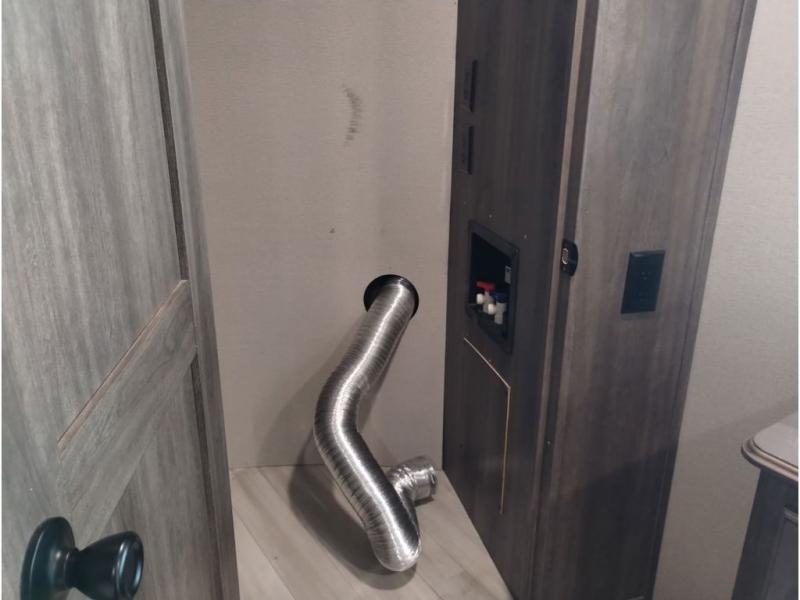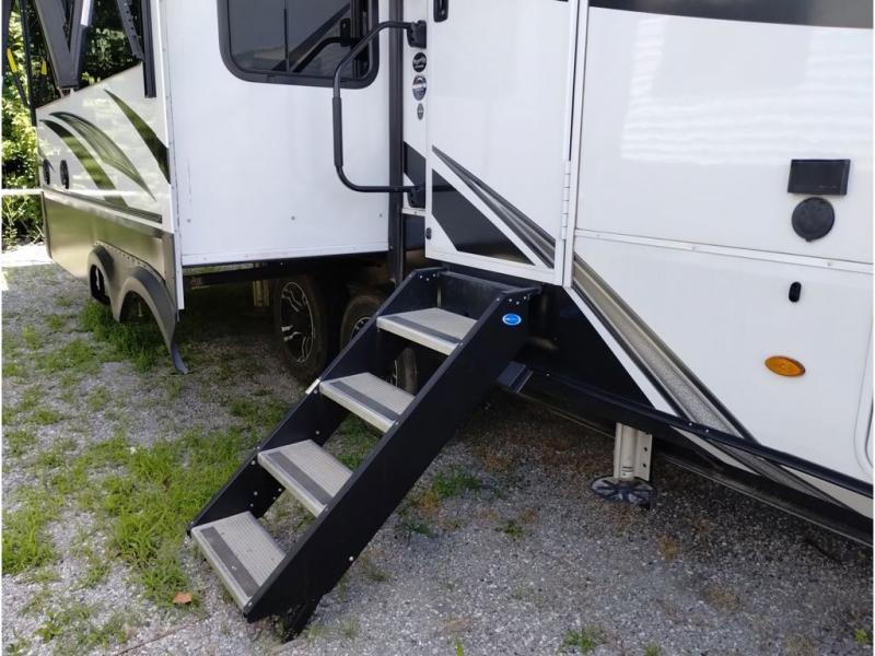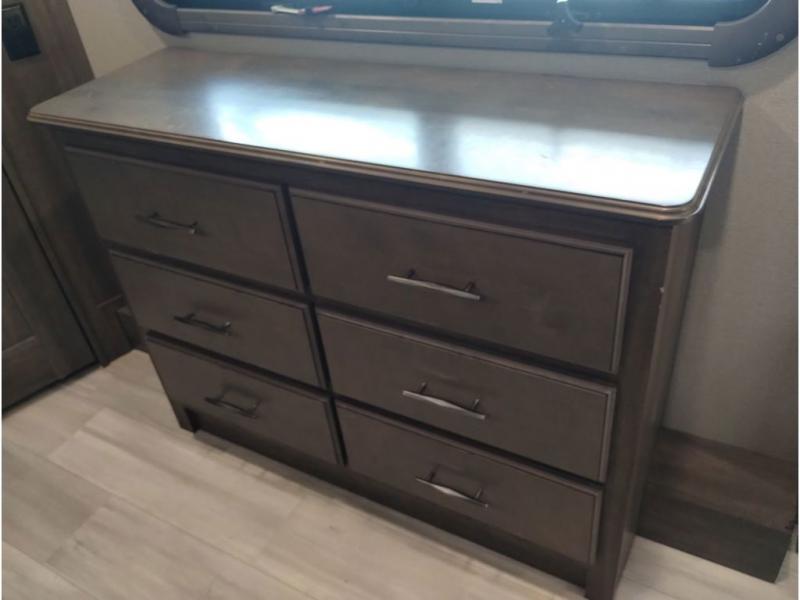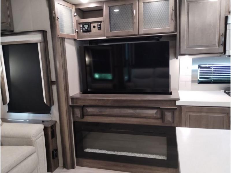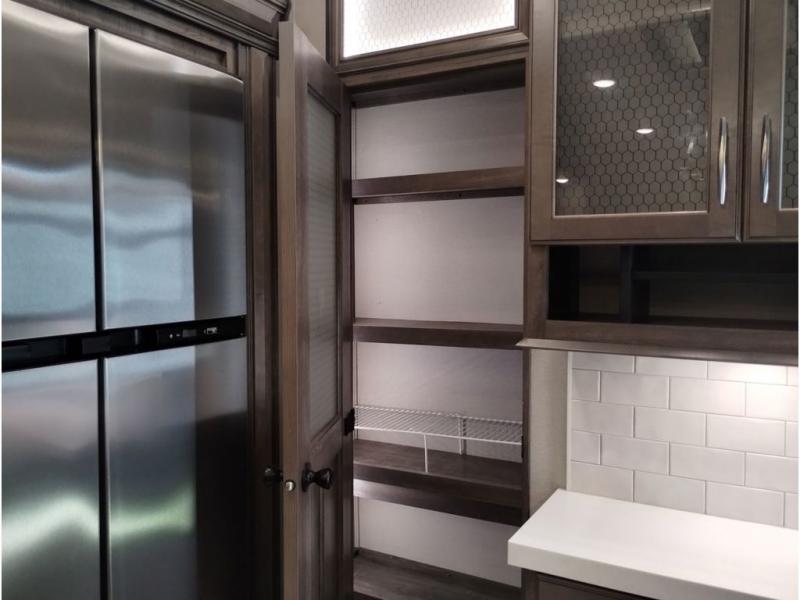 Traveling for long periods at a time is made easy with this kitchen that can feed a group a holiday meal! The professional-grade stainless steel cooktop with built-in oven, the microwave, the stainless steel 18 cu. ft. four-door refrigerator and the kitchen island offer everything you will need to enjoy cooking. Yet you might like to add the French door refrigerator option instead. You will find storage throughout including in the hutch, under the interior steps, and in the front master bedroom. There is a queen bed or choose a king, a pull-out ottoman, a closet prepped for a washer/dryer option, a larger wardrobe, plus a flip-top dresser with LED TV above. And the bathroom includes a shower with a seat and skylight. Plus you can add the exterior pull-out kitchen option to enjoy while relaxing under one of the two power awnings.