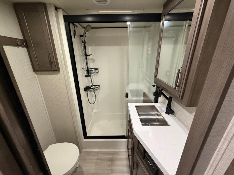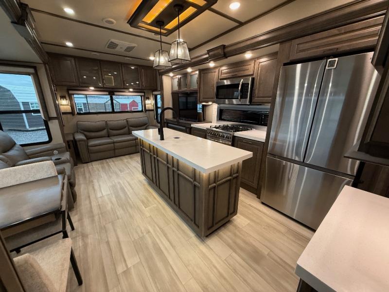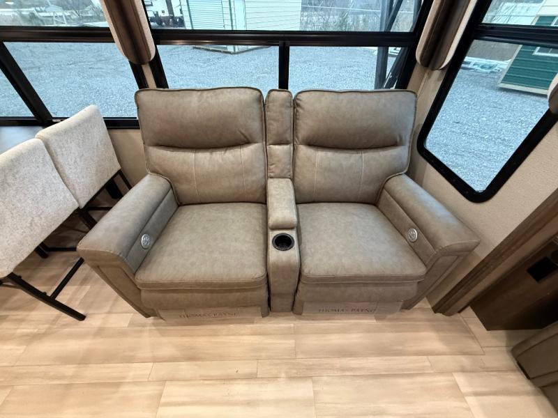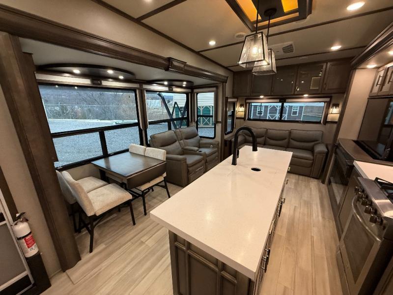 With any Solitude fifth wheel by Grand Design, you will get maximum insulation from the thermal roof design, the exclusive fully laminated walls, the triple insulated main floor, the Rail-Tite underbelly seal, the insulated gooseneck and the insulated baggage doors. The MORryde rubber pin box system utilizes a unique rubber shear spring to positively deal with rough towing and road shock, the Tire Linc TPMS system monitors pressure and temperature, and the 6-point hydraulic system allows you to setup easily. And the upgraded shower system, the hardwood window valances, the oversized kitchen pantry, the window above the master bed headboard, and the Rockford Fosgate stereo entertainment system with HDMI and App controls are a few more reasons you will love these extended-stay fifth wheels!