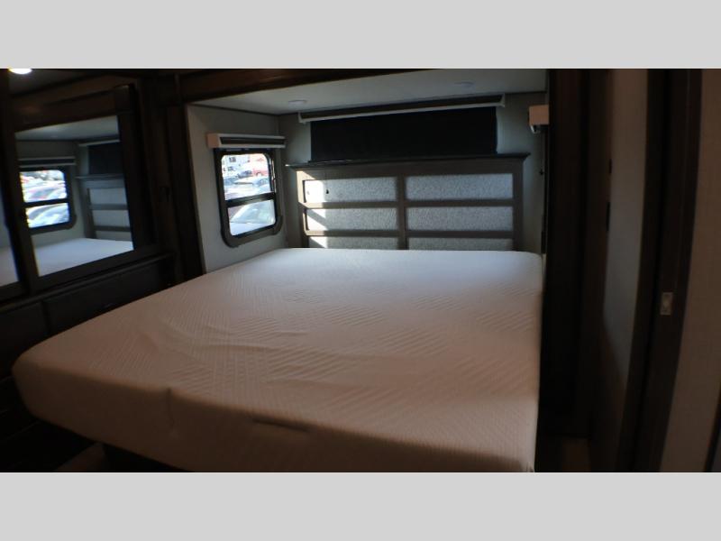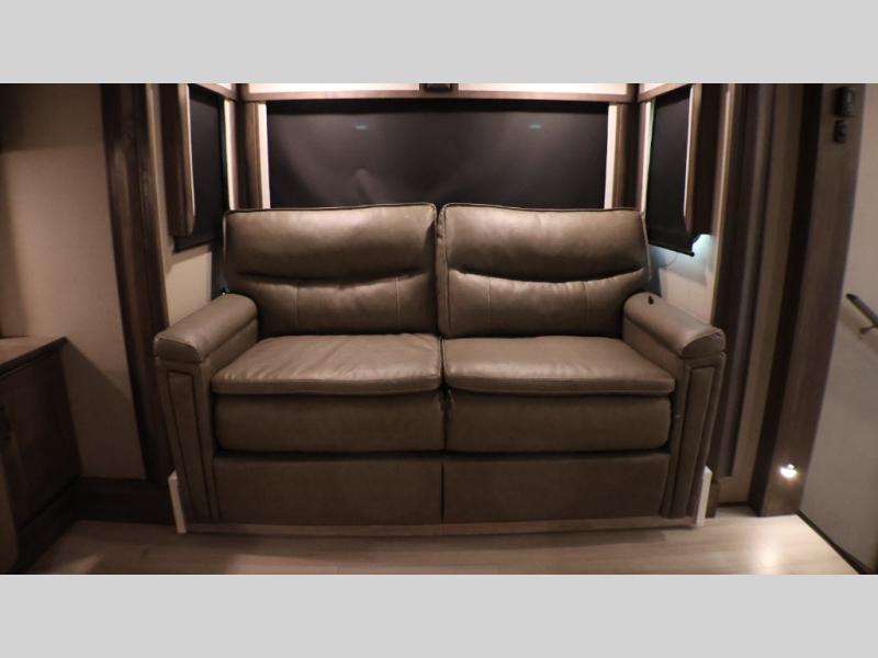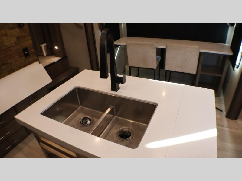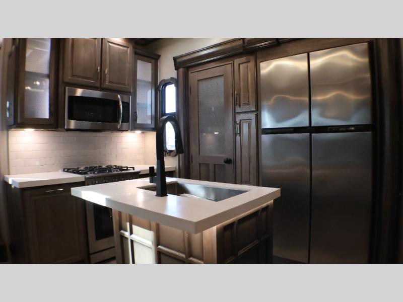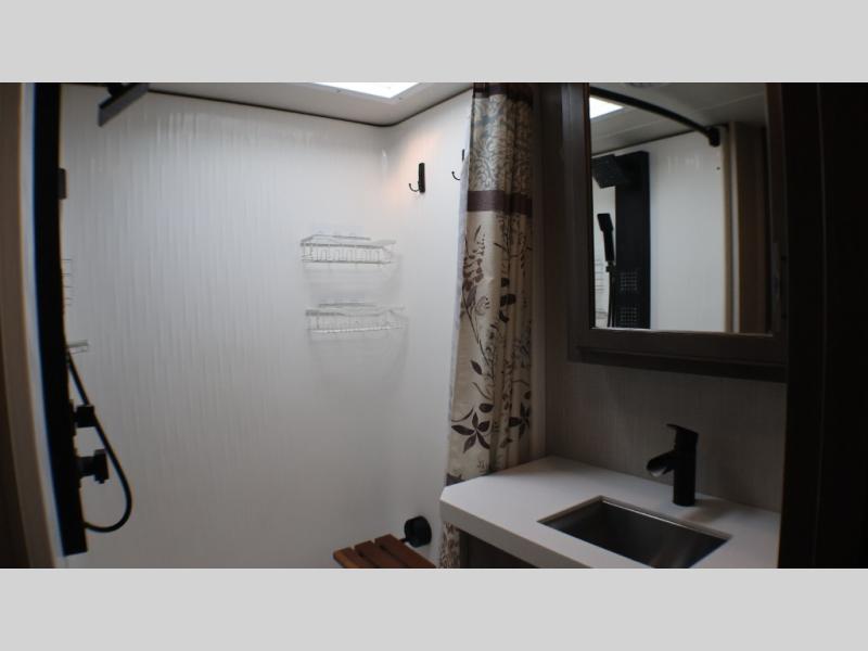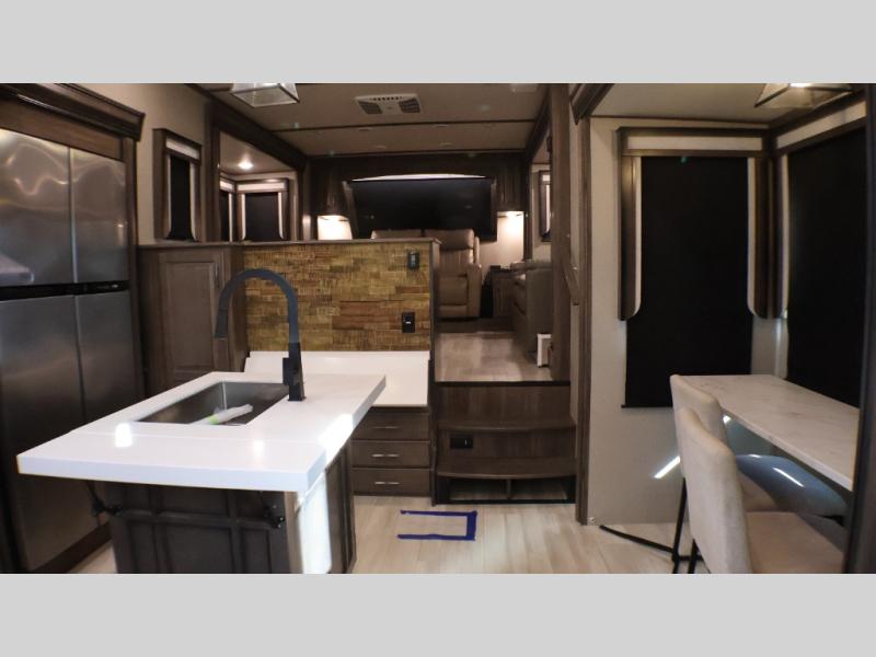 With any Solitude fifth wheel by Grand Design, you will get maximum insulation from the thermal roof design, the exclusive fully laminated walls, the triple insulated main floor, the Rail-Tite underbelly seal, the insulated gooseneck and the insulated baggage doors. The MORryde rubber pin box system utilizes a unique rubber shear spring to positively deal with rough towing and road shock, the Tire Linc TPMS system monitors pressure and temperature, and the 6-point hydraulic system allows you to setup easily. And the upgraded shower system, the hardwood window valances, the oversized kitchen pantry, the window above the master bed headboard, and the Rockford Fosgate stereo entertainment system with HDMI and App controls are a few more reasons you will love these extended-stay fifth wheels!