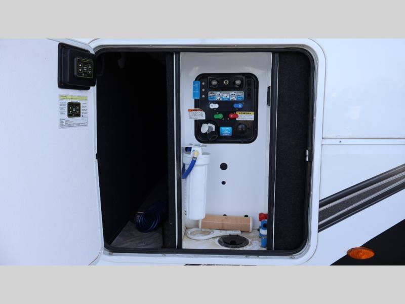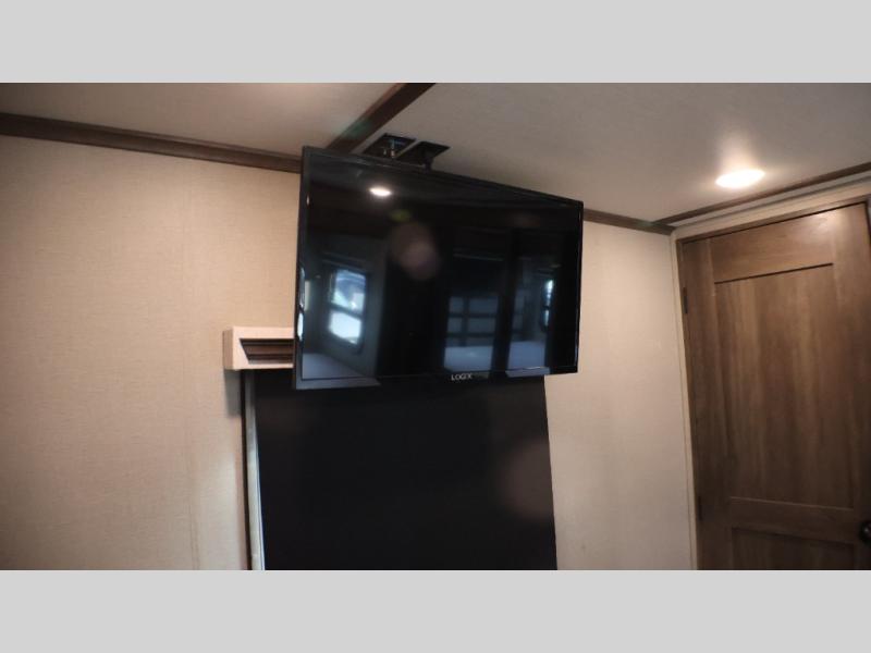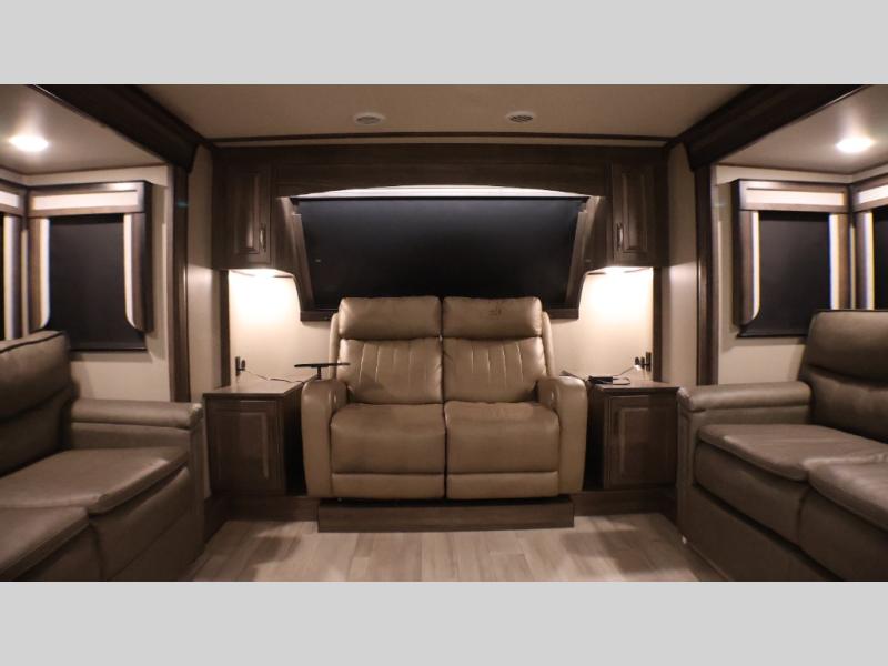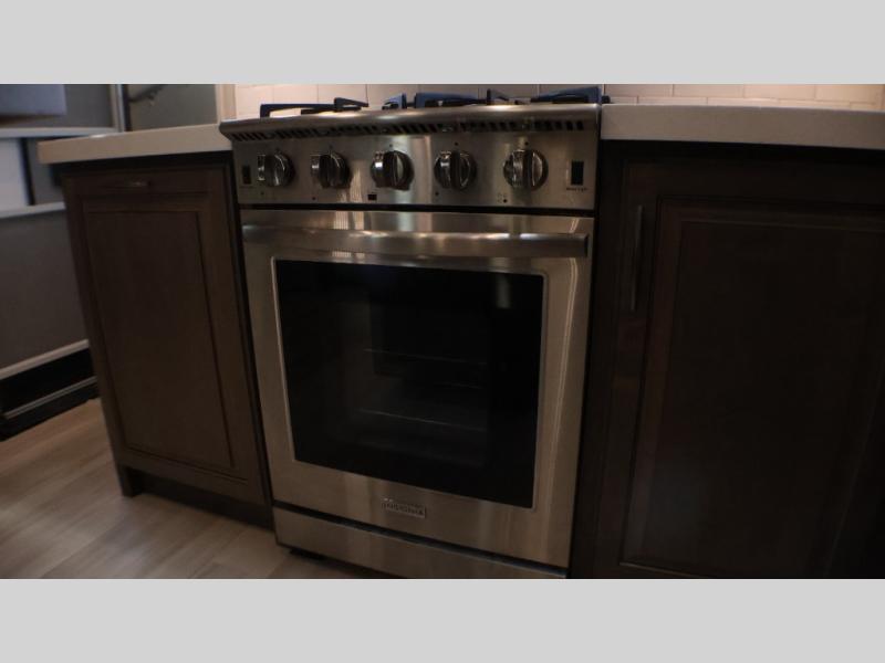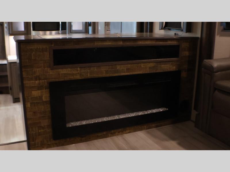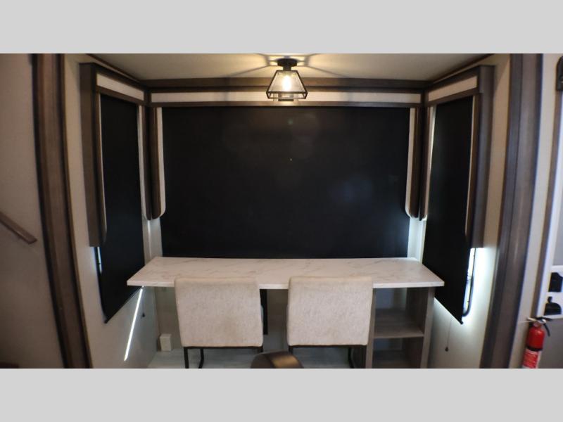 This fifth wheel offers a unique rear exterior storage bay with tray giving you extra space to carry larger items like outdoor camping equipment such as tables and chairs, golf clubs or even your seasonal items if you plan to live in this Solitude. Another popular feature is the separate living area up front giving you manual theater seats, dual opposing tri-fold sofa slides that offer sleeping space for family and friends, and an LED TV with a fireplace below to enjoy. The separate kitchen area is a another great place to gather at the free-standing table with four chairs or around the kitchen island. The cook will appreciate the flip-up countertop, and all the appliances plus the pull-out trash and the oversized pantry with shelves. At night you can retire to the master bedroom to your own queen bed within a slide out or choose the king option, and the pull-out ottoman will come in handy. You might like to add a washer/dryer option to the prepped closet space, and the wardrobe can keep your clothing wrinkle-free and there are drawers to store more items.