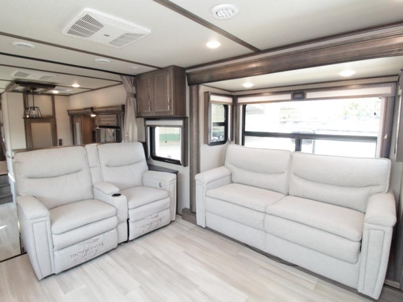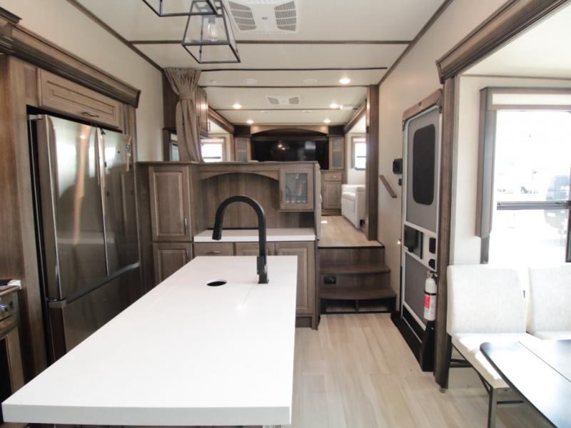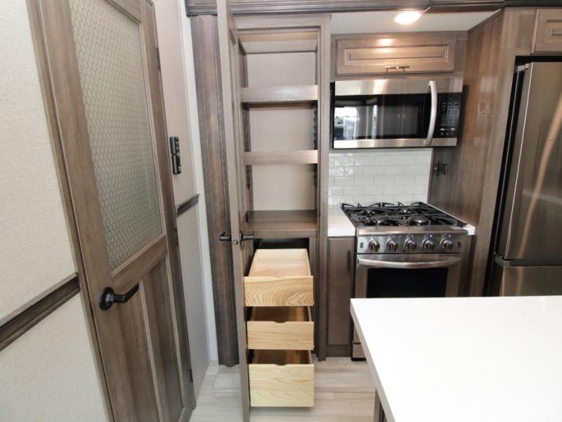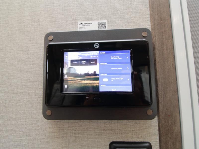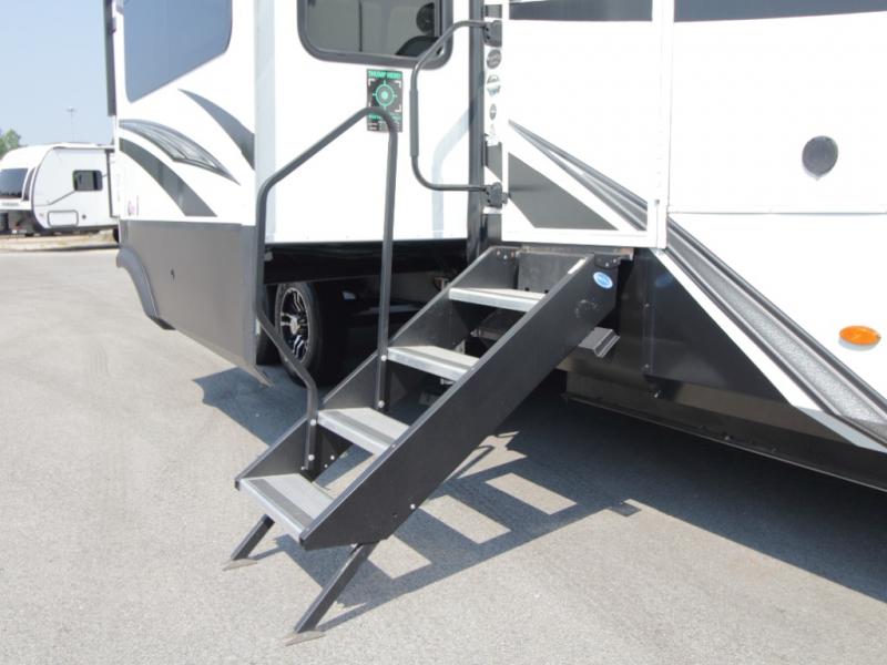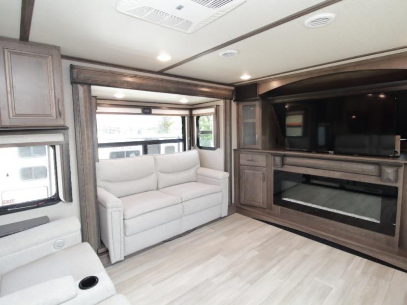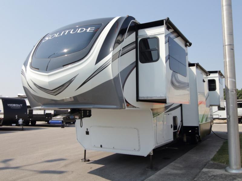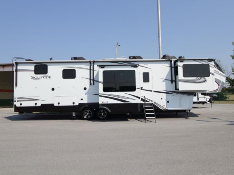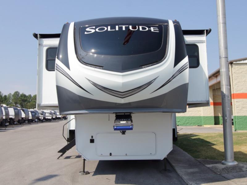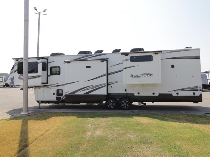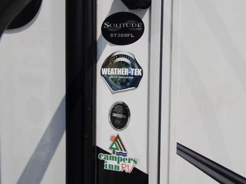 Inside, you’ll appreciate premium details such as hardwood window valances, an upgraded shower system, oversized pantry, Rockford Fosgate stereo with HDMI/App controls, and residential finishes that make the Solitude 380FL feel like home wherever you roam.
