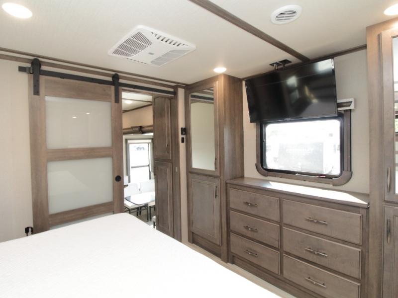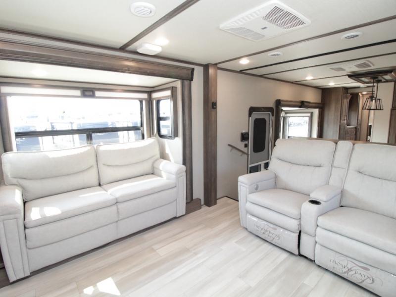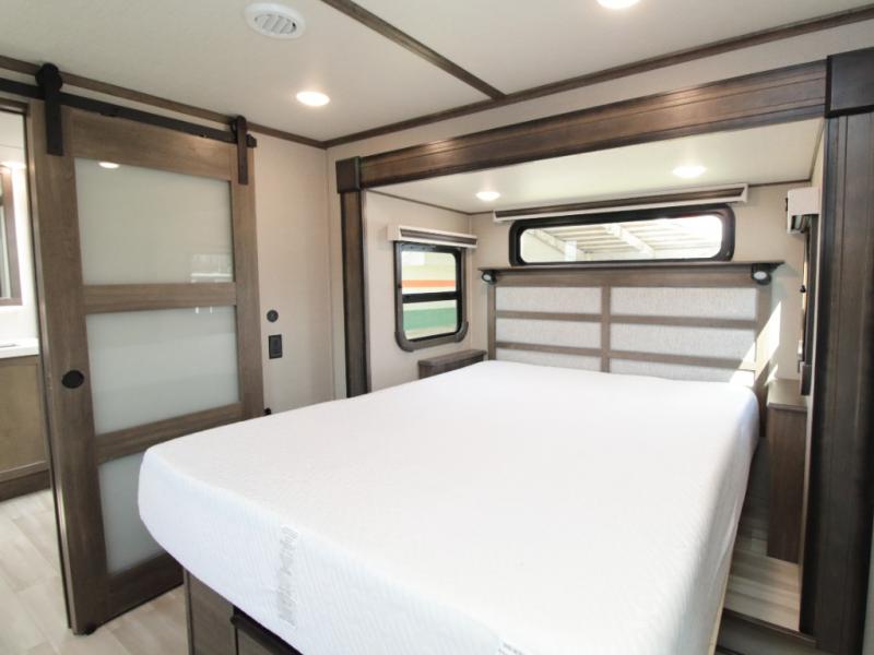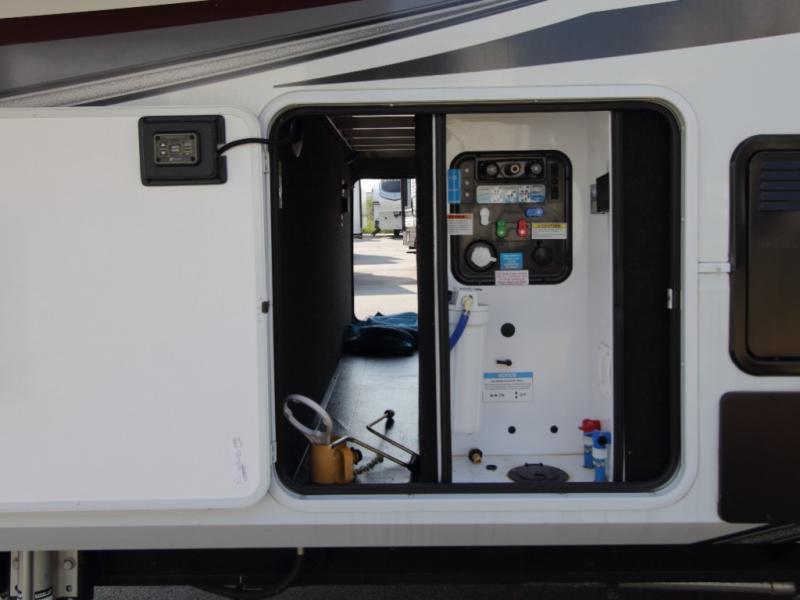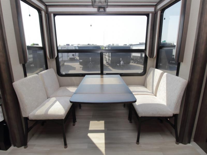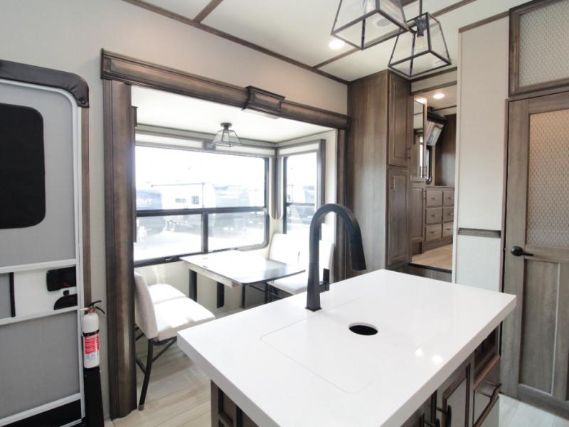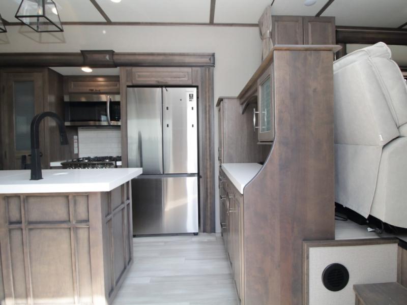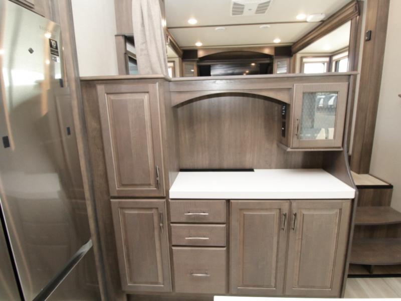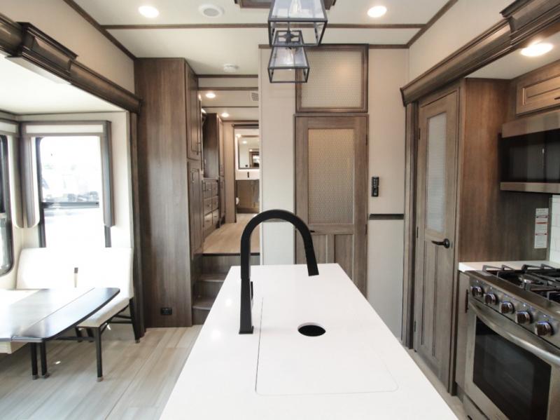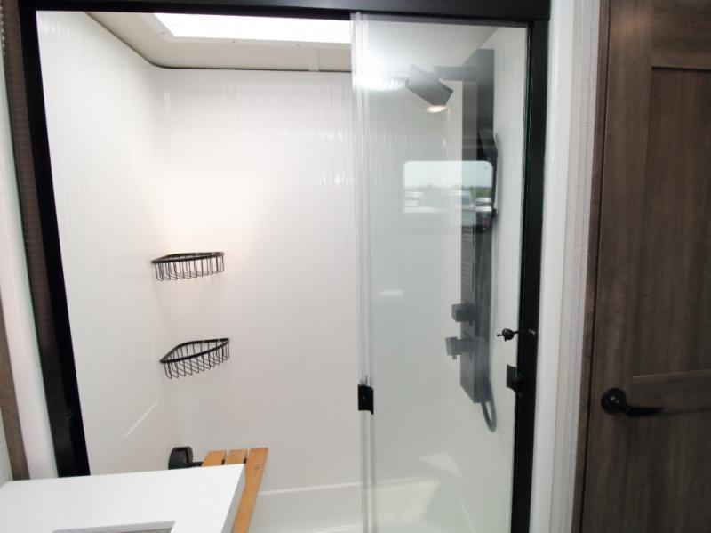 Inside, you’ll appreciate premium details such as hardwood window valances, an upgraded shower system, oversized pantry, Rockford Fosgate stereo with HDMI/App controls, and residential finishes that make the Solitude 380FL feel like home wherever you roam.