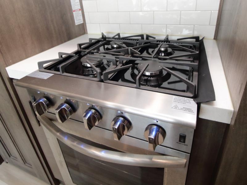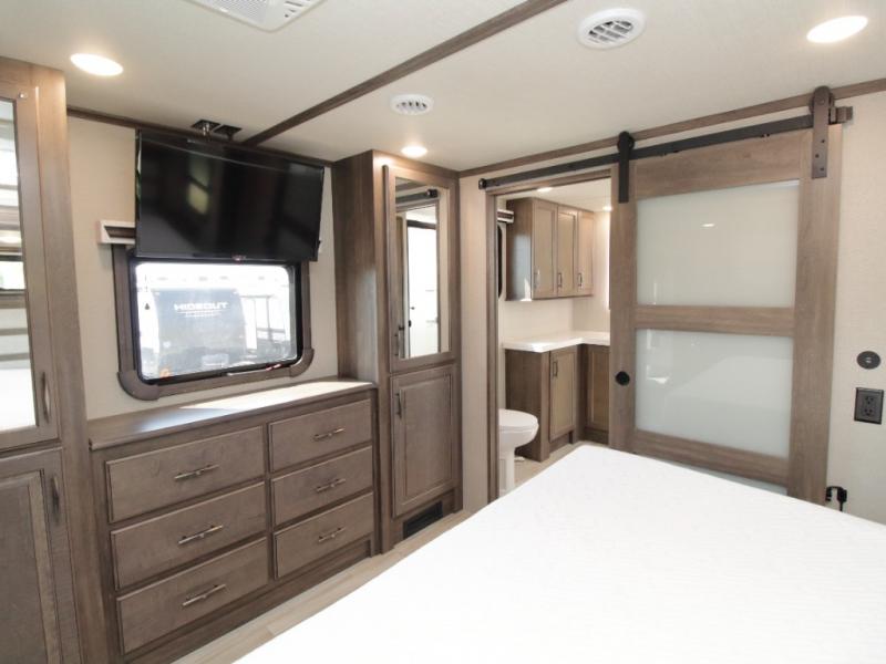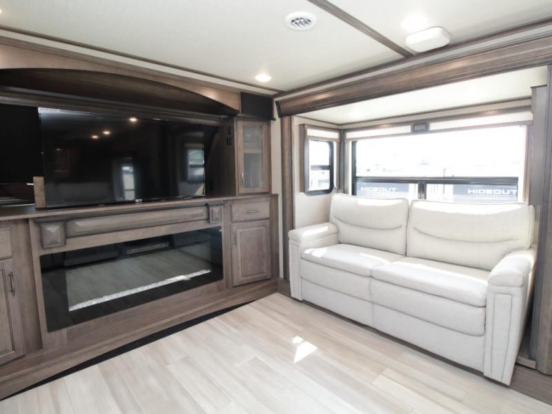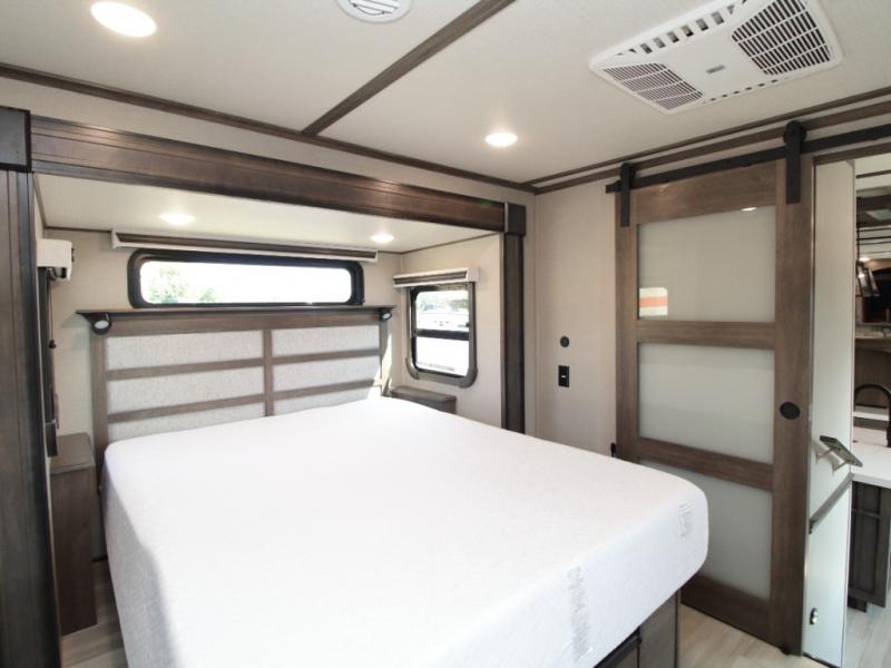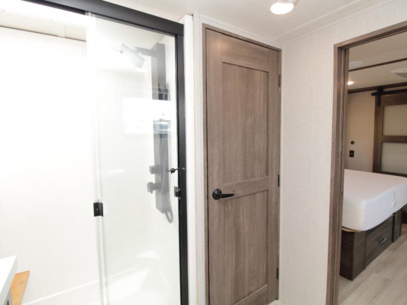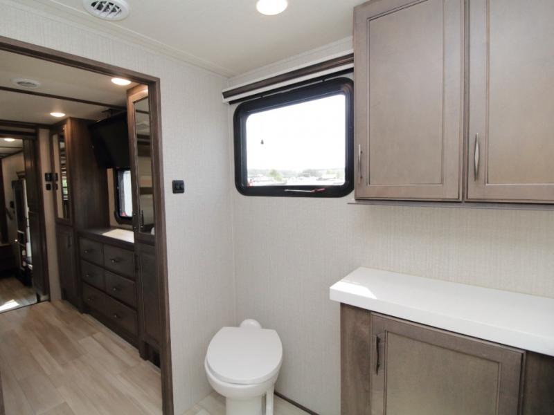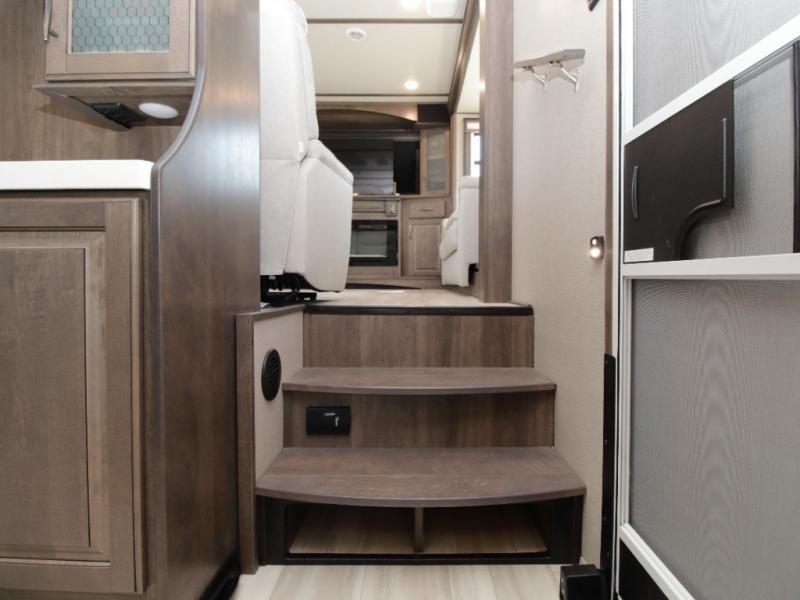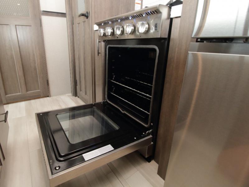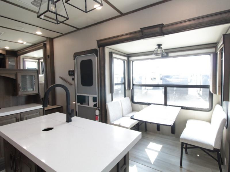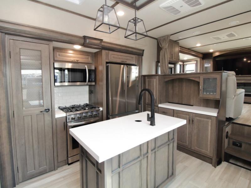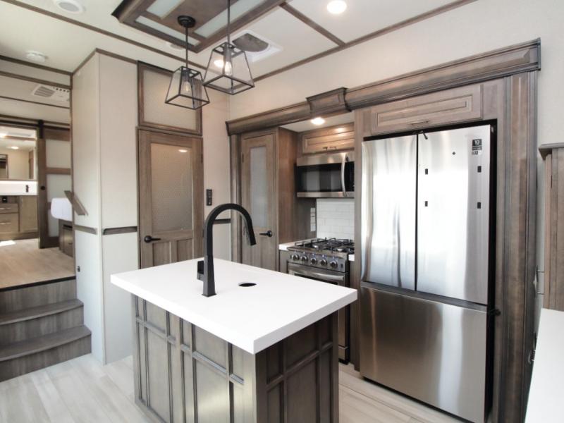 Inside, you’ll appreciate premium details such as hardwood window valances, an upgraded shower system, oversized pantry, Rockford Fosgate stereo with HDMI/App controls, and residential finishes that make the Solitude 380FL feel like home wherever you roam.
