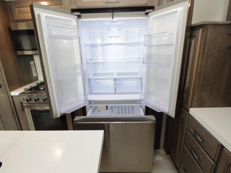 The chef-inspired kitchen offers a 24" residential oven, four-door refrigerator, oversized pantry, hutch with counter space, and a kitchen island for meal prep. Gather around the free-standing dinette for meals with a view, then relax in the front living room with dual tri-fold sofas, theater seating, and an entertainment center with LED Smart TV and fireplace.