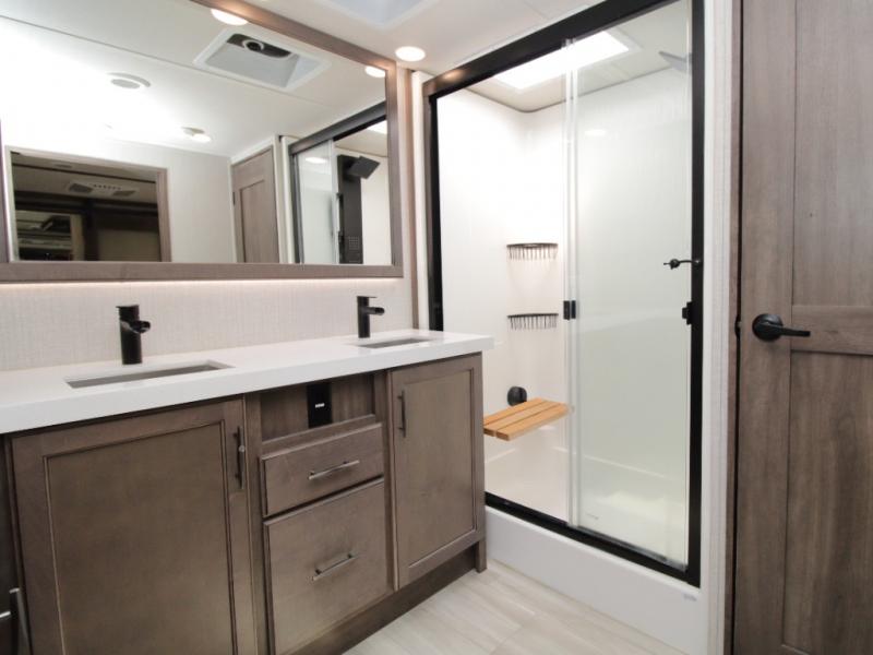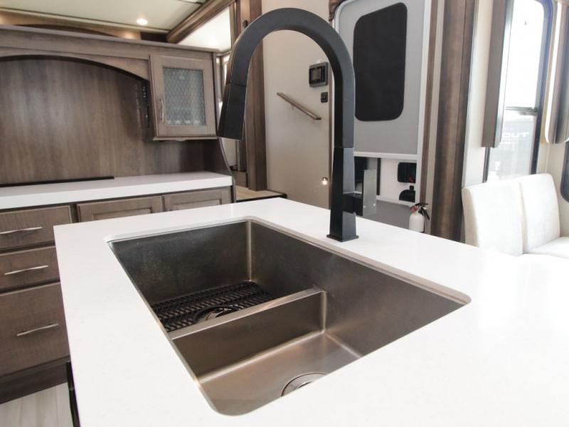 Experience ultimate comfort and convenience with the 2022 Grand Design Solitude 380FL, featuring a luxurious dual-sink vanity and a versatile exterior sliding tray for all your storage needs.