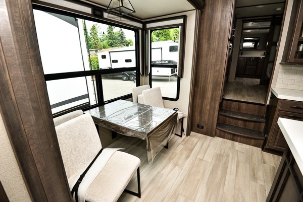 If you enjoy entertaining while camping, you will love this setup from the wine bar with beverage cooler, the kitchen island to set snacks on, and the hutch provides more counter space, plus the stainless steel appliances are nearby if you need to whip up anything. Some people can relax at the free-standing table with four chairs and windows to enjoy the views, or up front in the living and entertainment area. This room is spacious with dual opposing tri-fold sofa slides and theater seats, a front wall with an LED telescoping TV and fireplace below plus storage, and there is a curtain to close for privacy when friends are sleeping on the sofas. You will have your own master bedroom with a queen bed slide, wardrobes, an LED TV, plus sliding doors to get into the rear full bathroom with dual sinks, a seated shower, and a space to add a washer/dryer option if you plan to stay awhile.