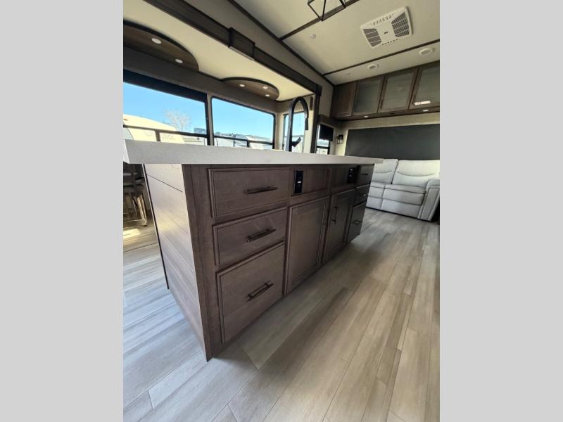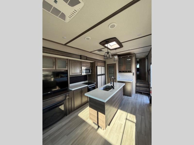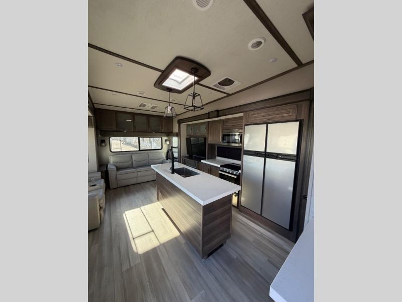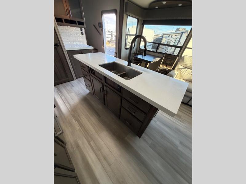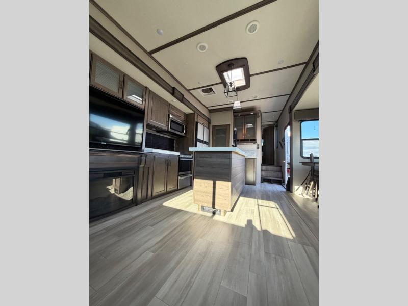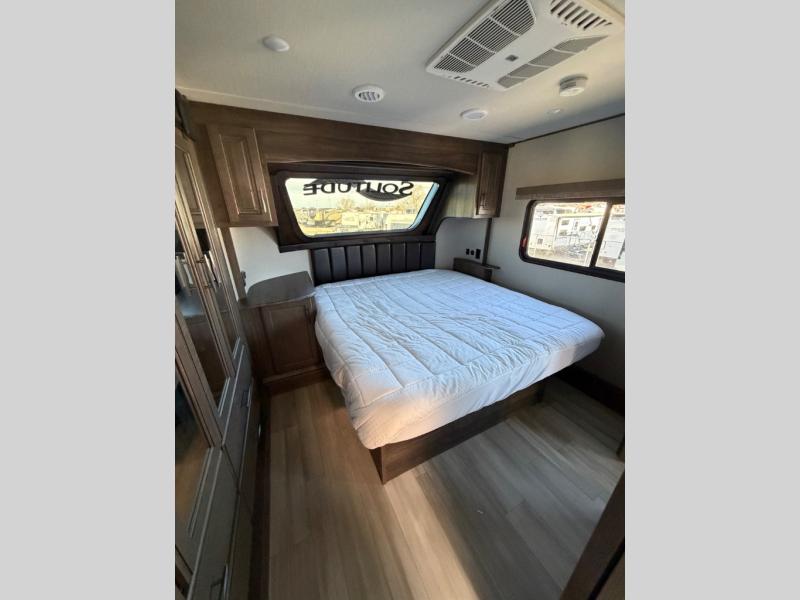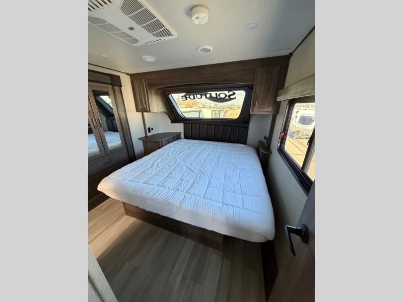 With any Solitude S-Class fifth wheel by Grand Design you will appreciate the Max Built Construction Package that features a 101" wide-body, gel coat exterior sidewalls, heavy-duty 7,000 lb. axles, plus many more durable construction materials. The self-adjusting brakes and the MORryde CRE3000 suspension system will provide a smooth towing experience, and each model includes heavy duty 17.5" H-rated tires with NitroFill. Some of the features you are sure to love are included in the Residential Living Package, like the solid surface countertops and sink covers, the hardwood cabinet doors, the night stands with USB ports, and the Rockford Fosgate stereo entertainment system with HDMI and App controls. These fifth wheels are extended-stay approved thanks to the Weather-Tek Package with a 35,000 BTU high-capacity furnace, the Stealth A/C system, and many high-end residential finishes to make you feel like you taken home with you!