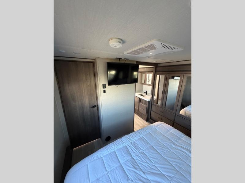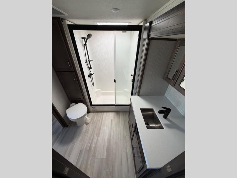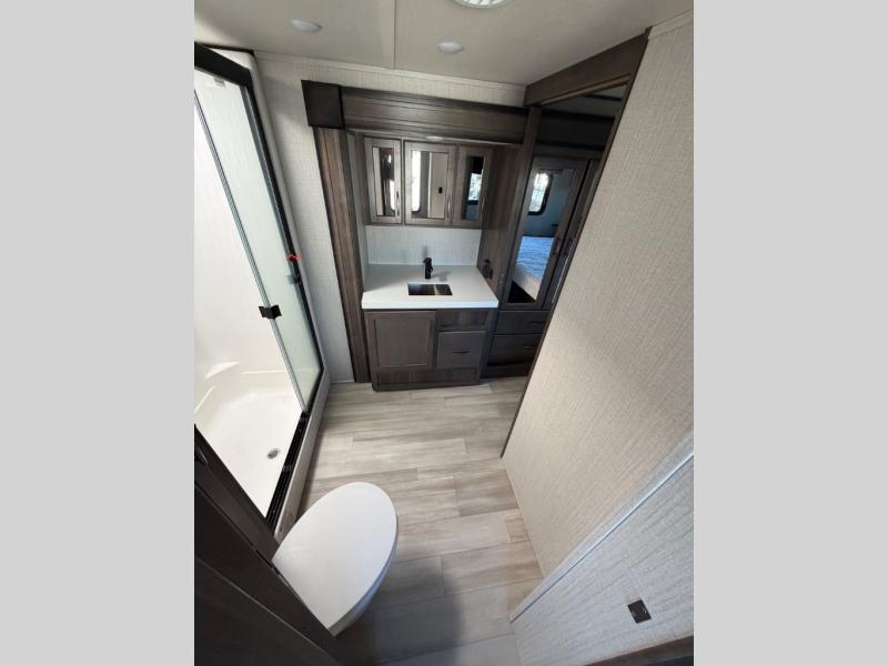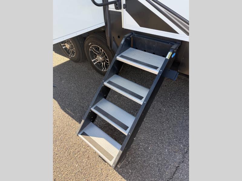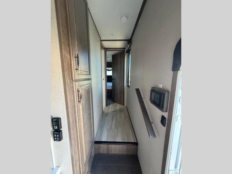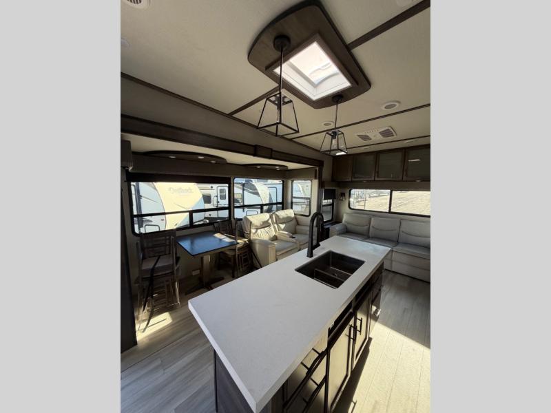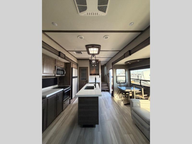 With any Solitude S-Class fifth wheel by Grand Design you will appreciate the Max Built Construction Package that features a 101" wide-body, gel coat exterior sidewalls, heavy-duty 7,000 lb. axles, plus many more durable construction materials. The self-adjusting brakes and the MORryde CRE3000 suspension system will provide a smooth towing experience, and each model includes heavy duty 17.5" H-rated tires with NitroFill. Some of the features you are sure to love are included in the Residential Living Package, like the solid surface countertops and sink covers, the hardwood cabinet doors, the night stands with USB ports, and the Rockford Fosgate stereo entertainment system with HDMI and App controls. These fifth wheels are extended-stay approved thanks to the Weather-Tek Package with a 35,000 BTU high-capacity furnace, the Stealth A/C system, and many high-end residential finishes to make you feel like you taken home with you!