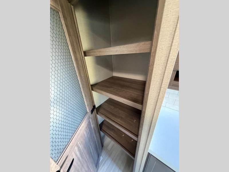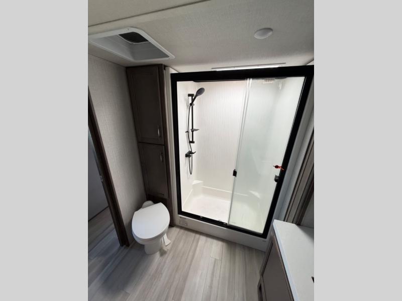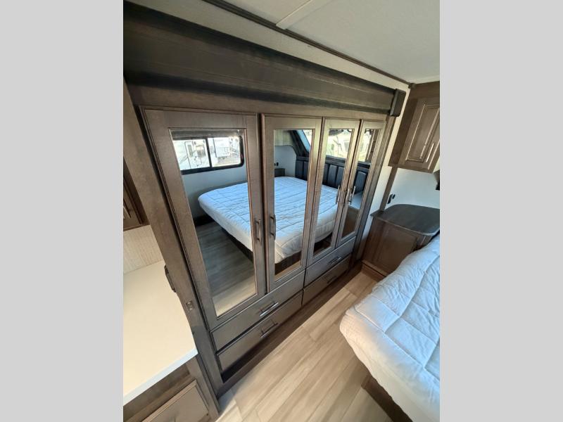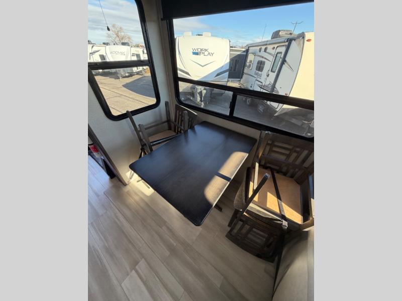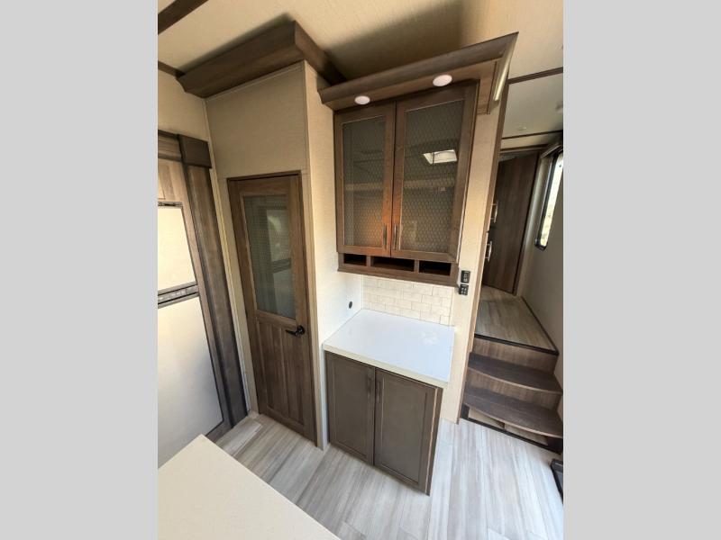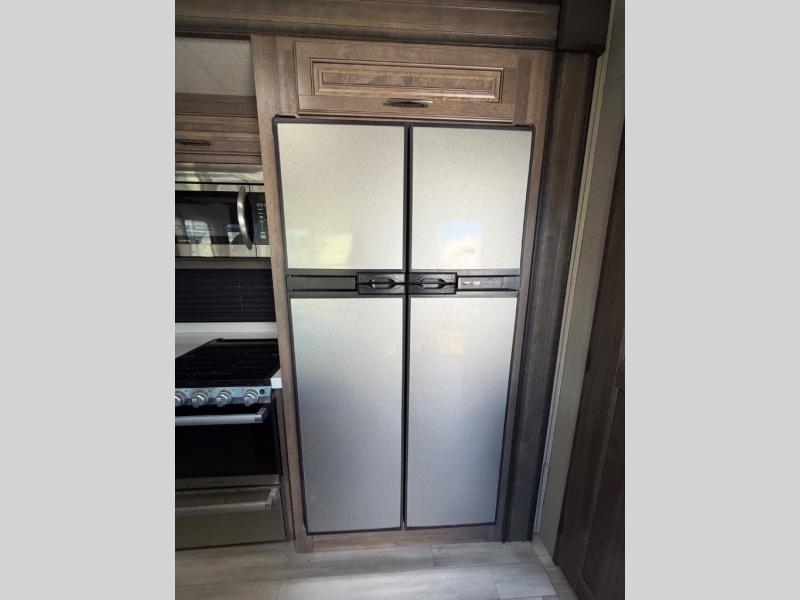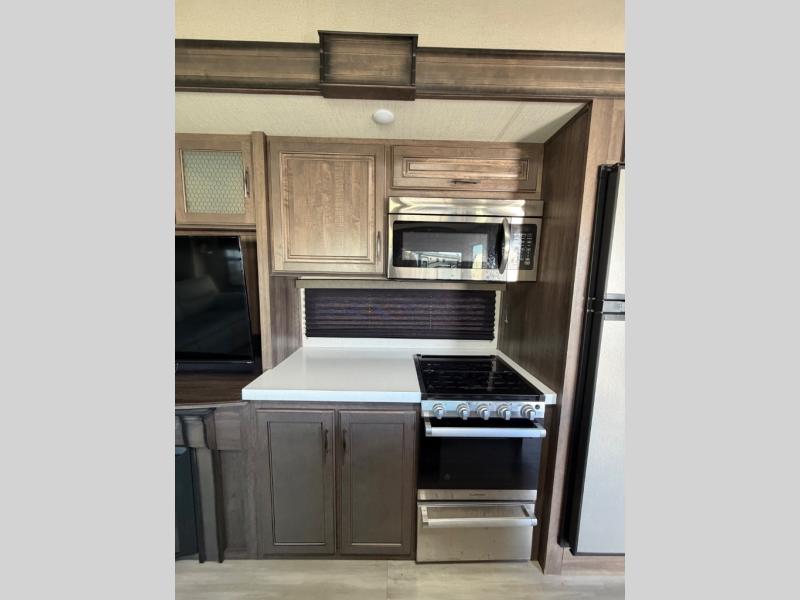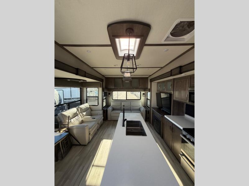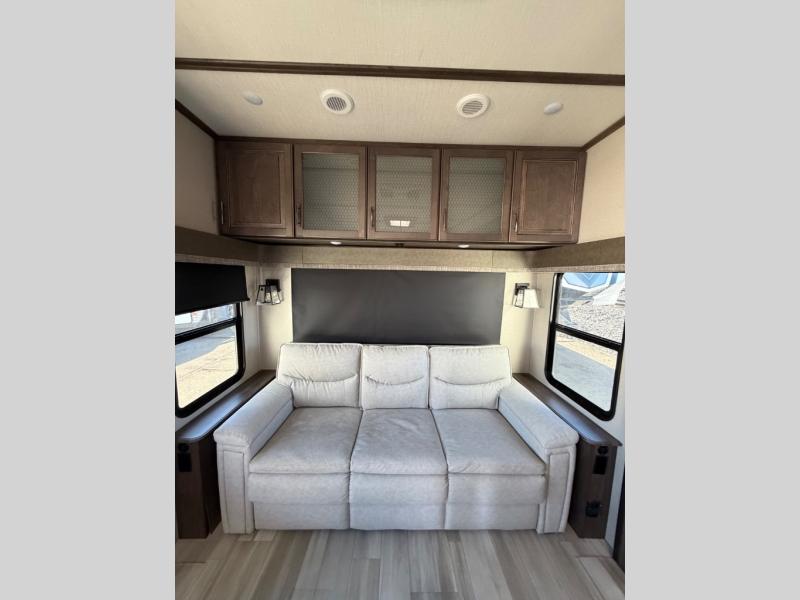 You'll feel right at home in this spacious fifth wheel with triple slides, a front master bedroom, and a kitchen island with extra counter space. The theatre seating is right across from the LED TV and fireplace, and there is a rear tri-fold sofa if you have any guests stay over. This model includes a hutch in the kitchen with cabinets above to store you nice dishes, plus there is a large pantry with washer and dryer prep if you plan to go full-time. Head to the dual entry bath that includes a linen closet and a spacious shower with a skylight, and check out the front master bedroom with its queen bed, slide out wardrobe, and 32" LED TV!