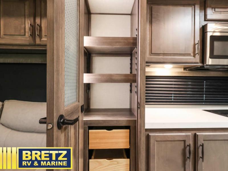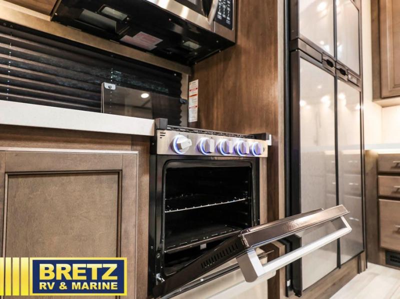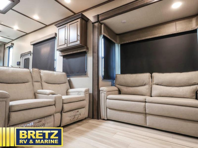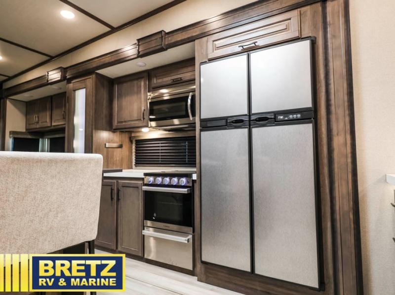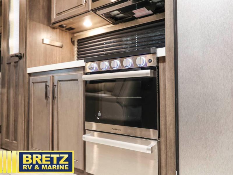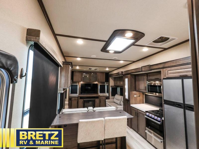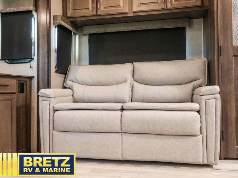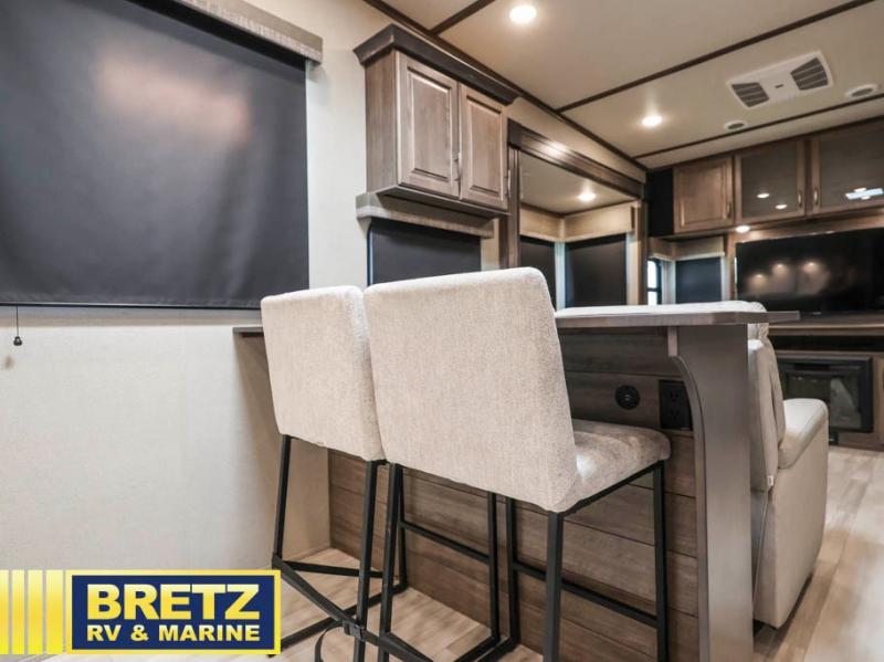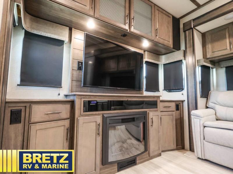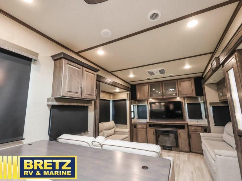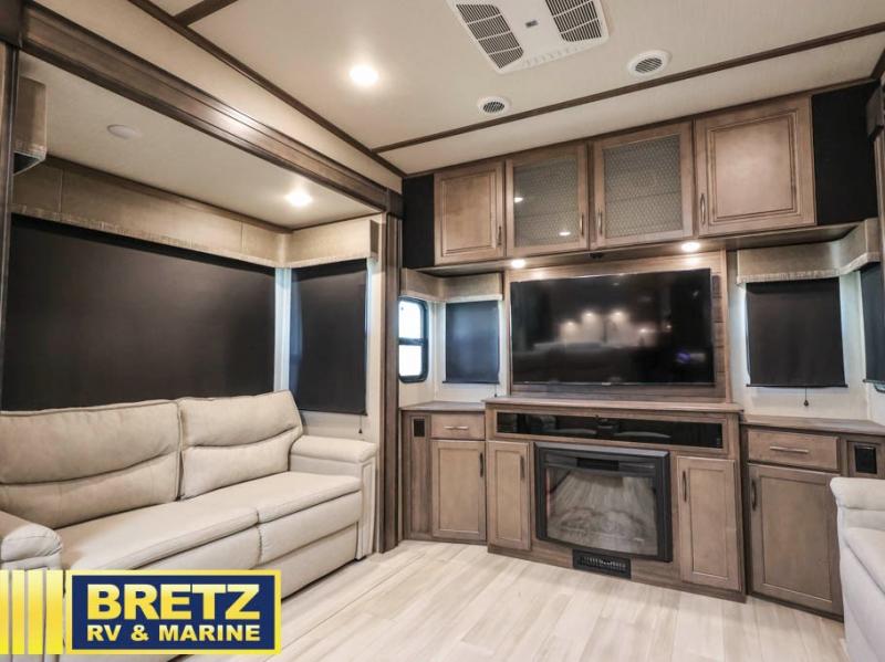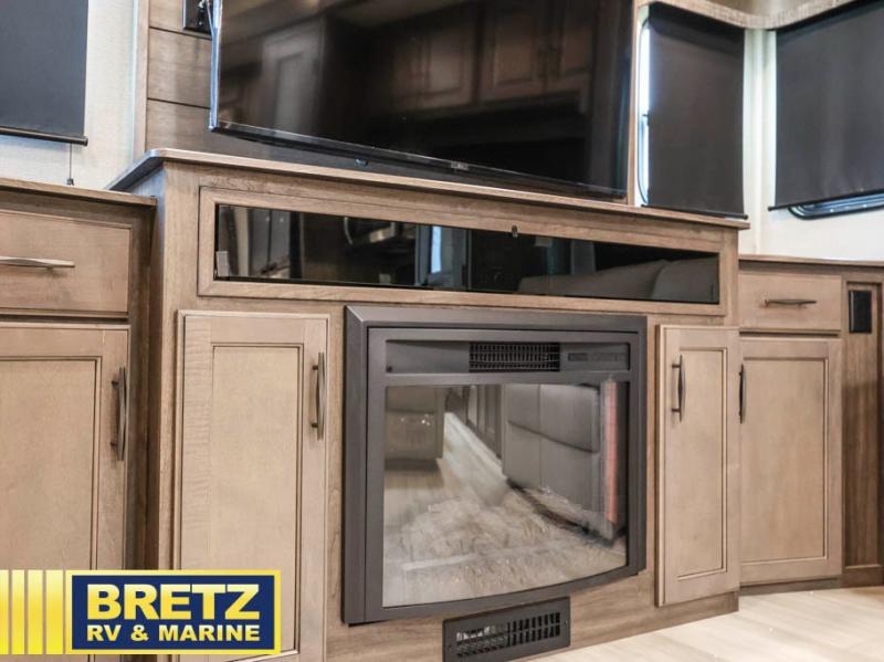 This fifth wheel allows you to enjoy the great outdoors during the day, while coming back to residential comforts in the evening. The rear living area features a 50" LED TV with overhead cabinets to store your movies, plus a fireplace for those cool fall nights. The theater seating is across from the TV for easy viewing, and there are two tri-fold sofas here that can double as your guests bed at night. The chef of your group will love the kitchen with its large pantry and stainless steel cooktop with an oven, and there is a bar with stools here that overlook the living area so the little ones can watch cartoons while they eat breakfast. You will appreciate your own private bedroom up front with a slide out queen bed that can be optioned out for a king bed, plus there is a dresser and a large front closet with washer and dryer prep. Full-time living just got a whole lot sweeter in this fifth wheel!
