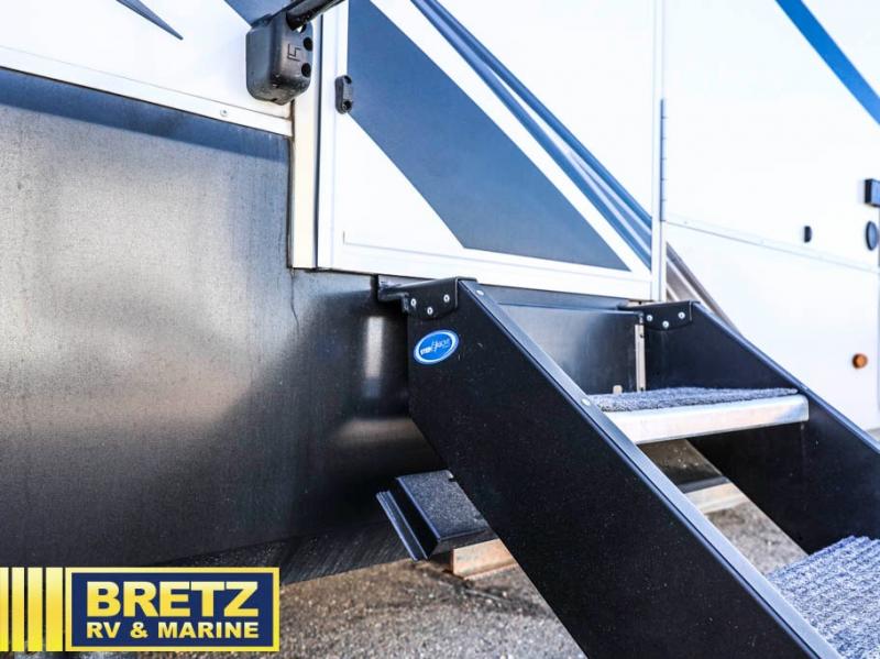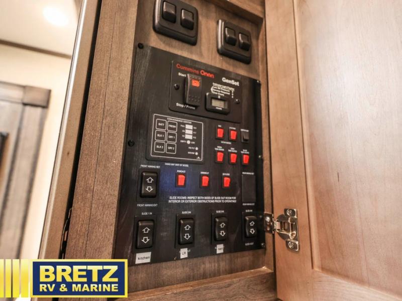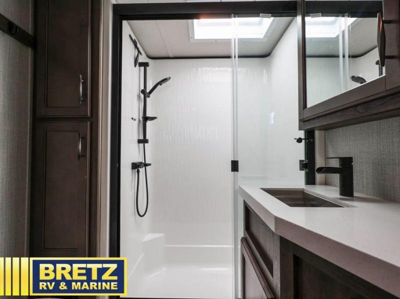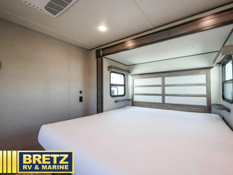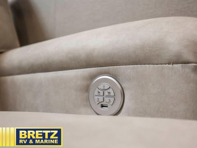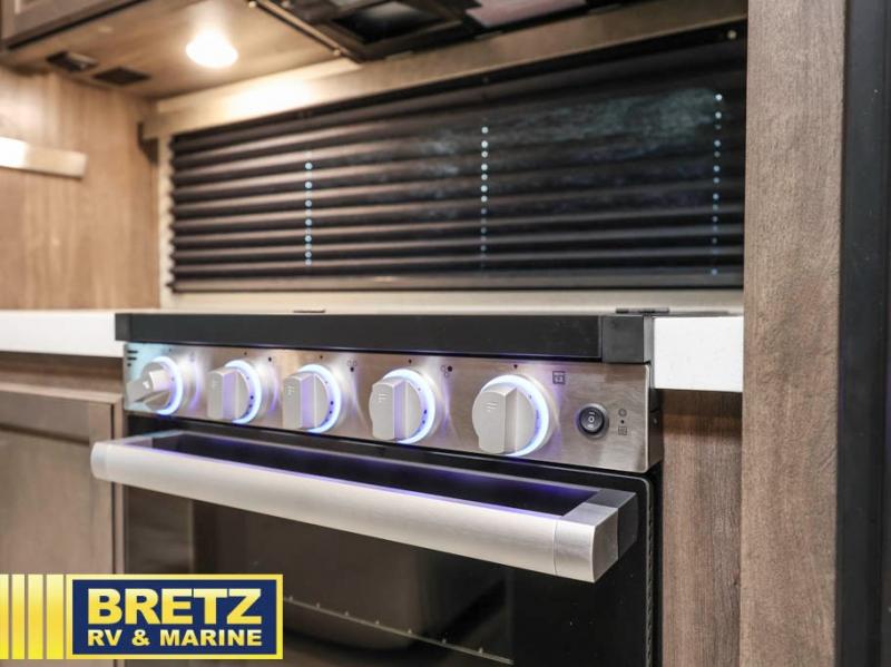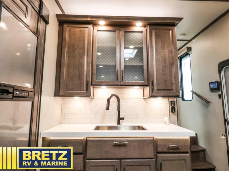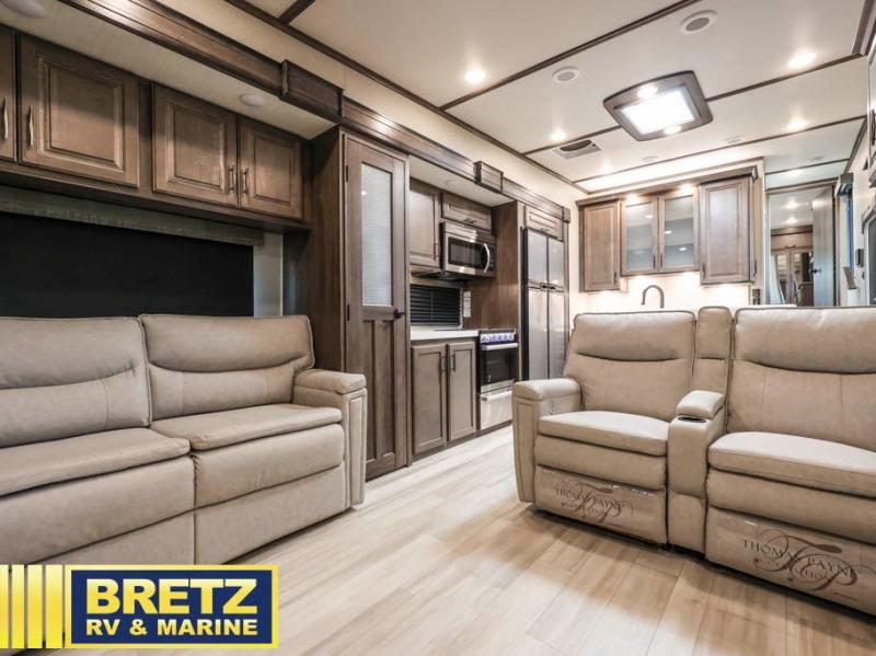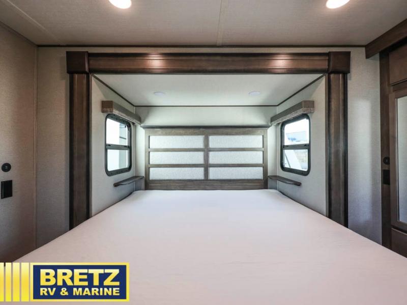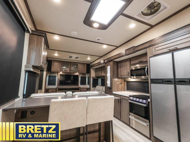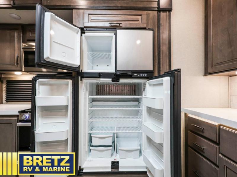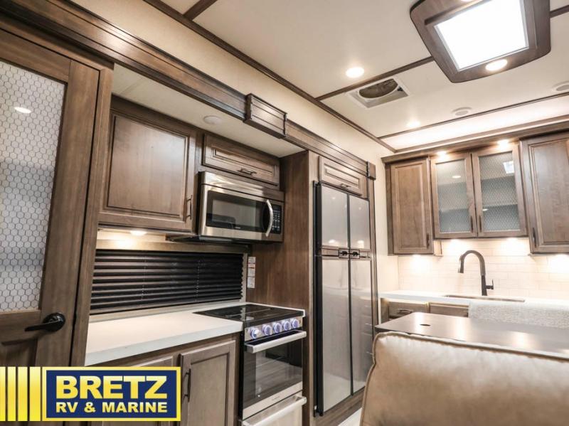 This fifth wheel allows you to enjoy the great outdoors during the day, while coming back to residential comforts in the evening. The rear living area features a 50" LED TV with overhead cabinets to store your movies, plus a fireplace for those cool fall nights. The theater seating is across from the TV for easy viewing, and there are two tri-fold sofas here that can double as your guests bed at night. The chef of your group will love the kitchen with its large pantry and stainless steel cooktop with an oven, and there is a bar with stools here that overlook the living area so the little ones can watch cartoons while they eat breakfast. You will appreciate your own private bedroom up front with a slide out queen bed that can be optioned out for a king bed, plus there is a dresser and a large front closet with washer and dryer prep. Full-time living just got a whole lot sweeter in this fifth wheel!