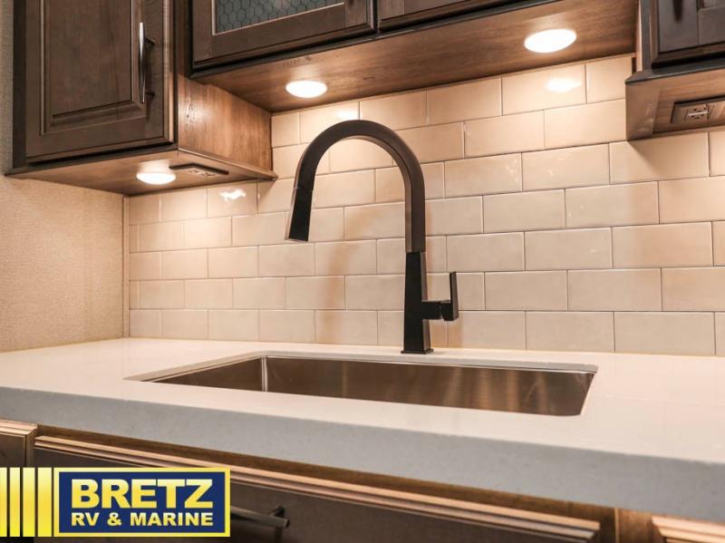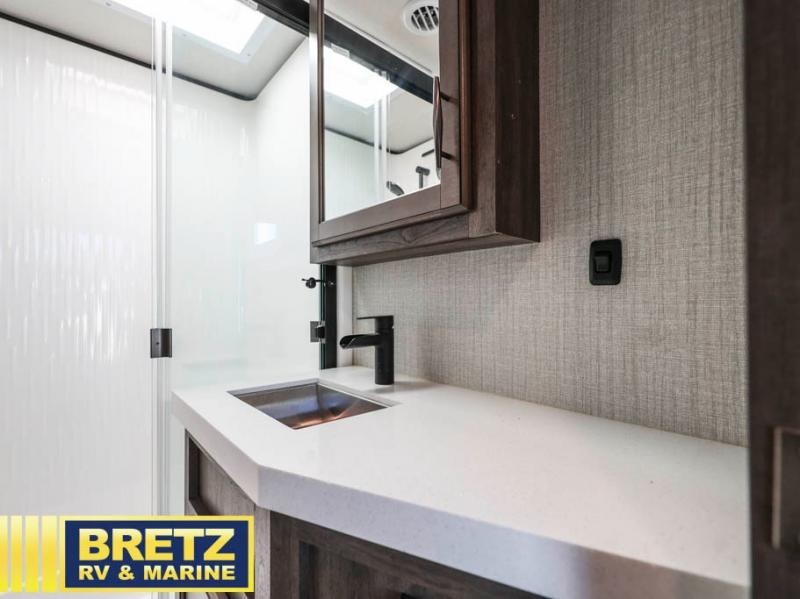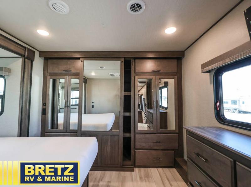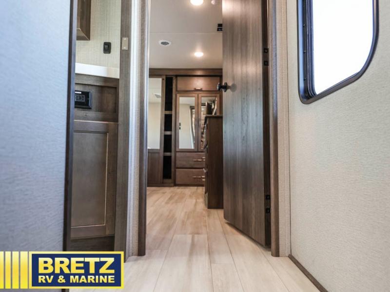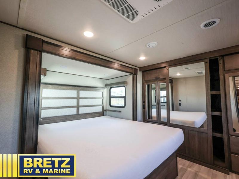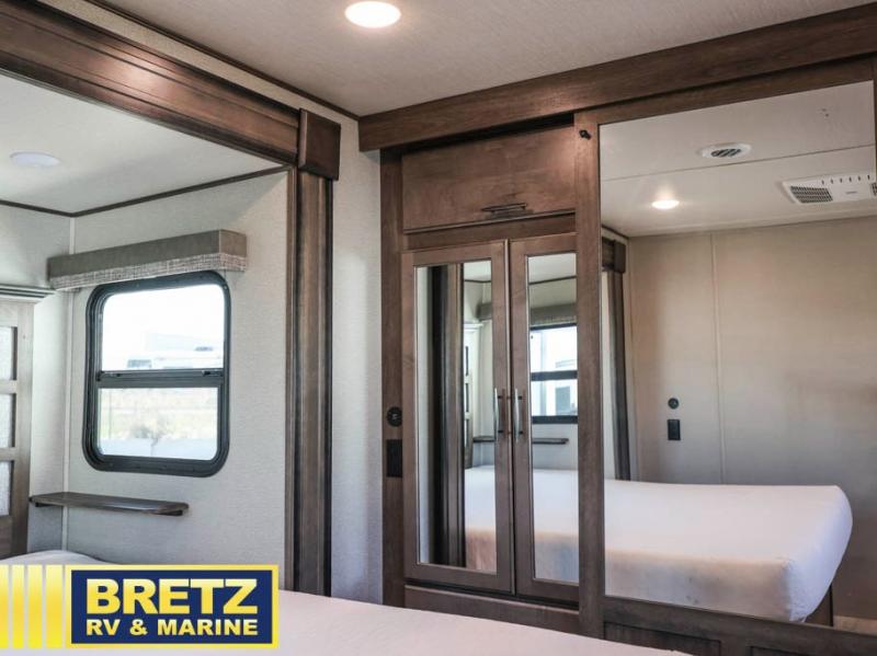 With any Solitude S-Class fifth wheel by Grand Design you will appreciate the Max Built Construction Package that features a 101" wide-body, gel coat exterior sidewalls, heavy-duty 7,000 lb. axles, plus many more durable construction materials. The self-adjusting brakes and the MORryde CRE3000 suspension system will provide a smooth towing experience, and each model includes heavy duty 17.5" H-rated tires with NitroFill. Some of the features you are sure to love are included in the Residential Living Package, like the solid surface countertops and sink covers, the hardwood cabinet doors, the night stands with USB ports, and the Rockford Fosgate stereo entertainment system with HDMI and App controls. These fifth wheels are extended-stay approved thanks to the Weather-Tek Package with a 35,000 BTU high-capacity furnace, the Stealth A/C system, and many high-end residential finishes to make you feel like you taken home with you!