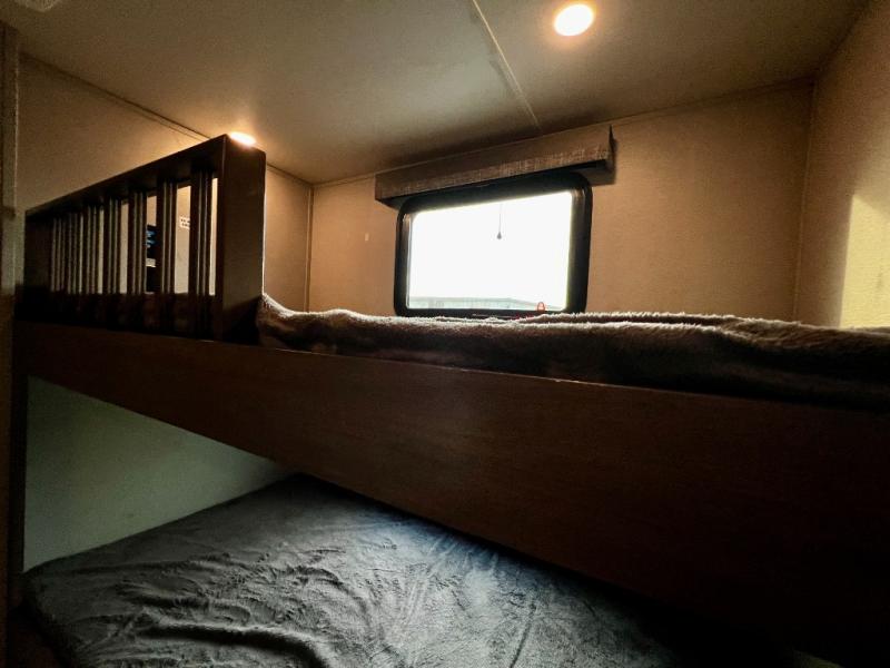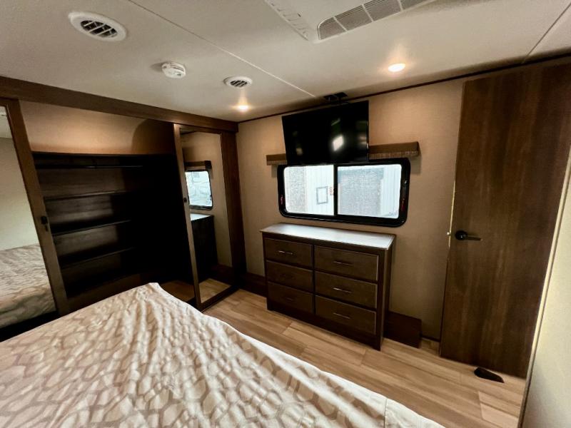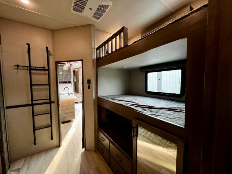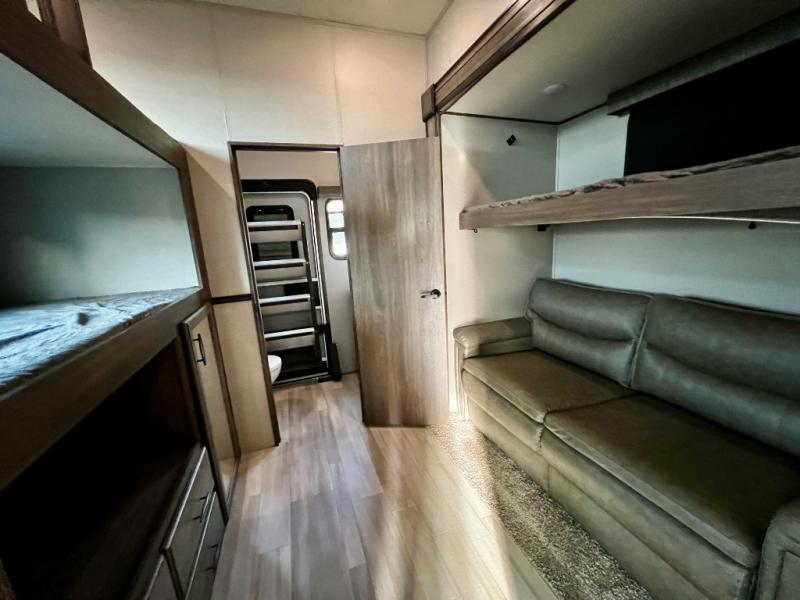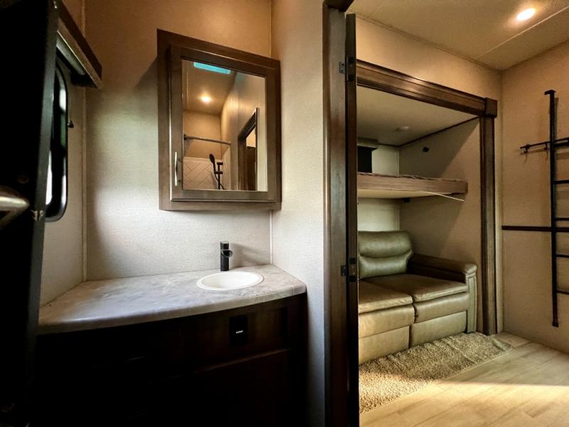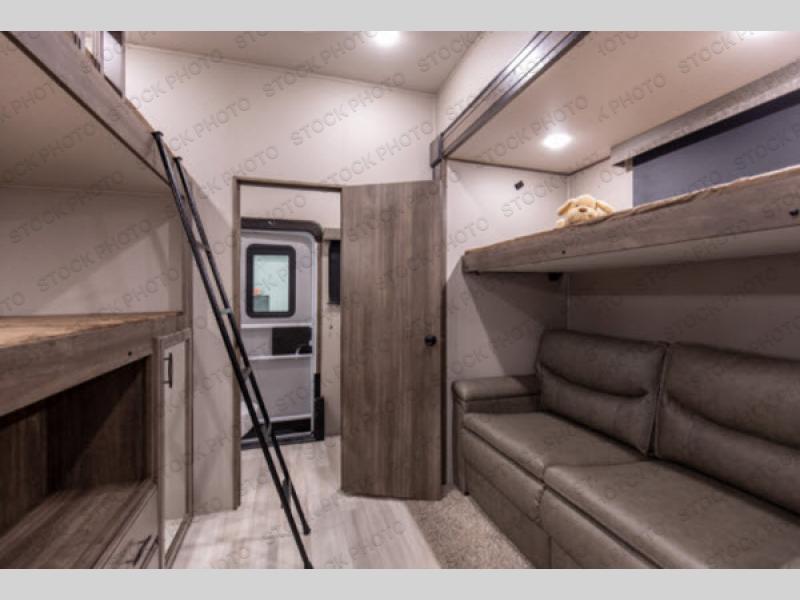 One look at this spacious fifth wheel and you'll be hooked! There are two full baths; one up front by the private bedroom, and one in the private bunkhouse. The rear bath also features a unique rear entry door for convenience. The chef of your group will love the outdoor kitchen that includes a beverage cooler, a sink, and an outdoor griddle for hot dogs and burgers. If the weather is raining on your parade, take the conversations inside to relax on the theatre seating or play a game at the free-standing dinette. There is also an LED TV here and a fireplace. This model includes plenty of storage space, including a large bedroom closet, a pantry in the kitchen, plus an exterior pass-through storage for larger camp gear!