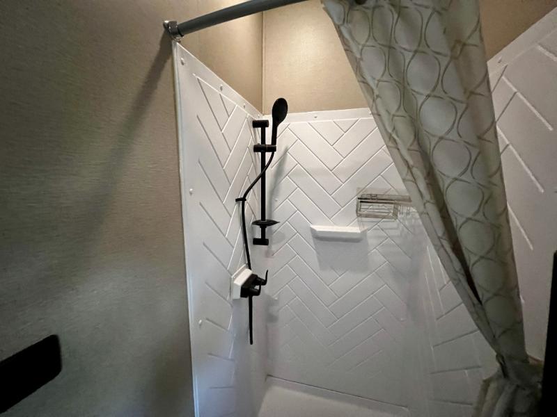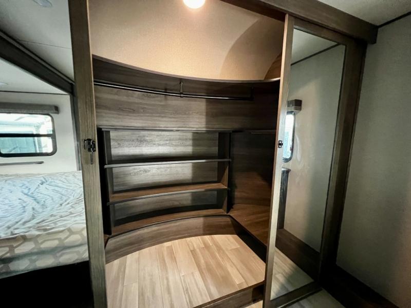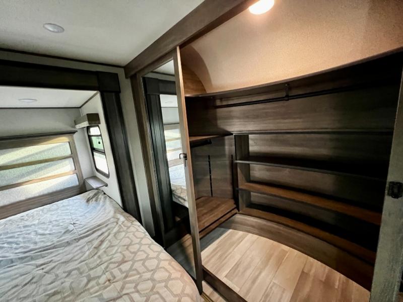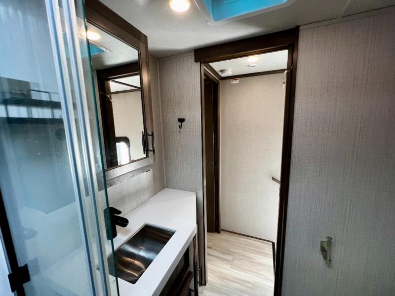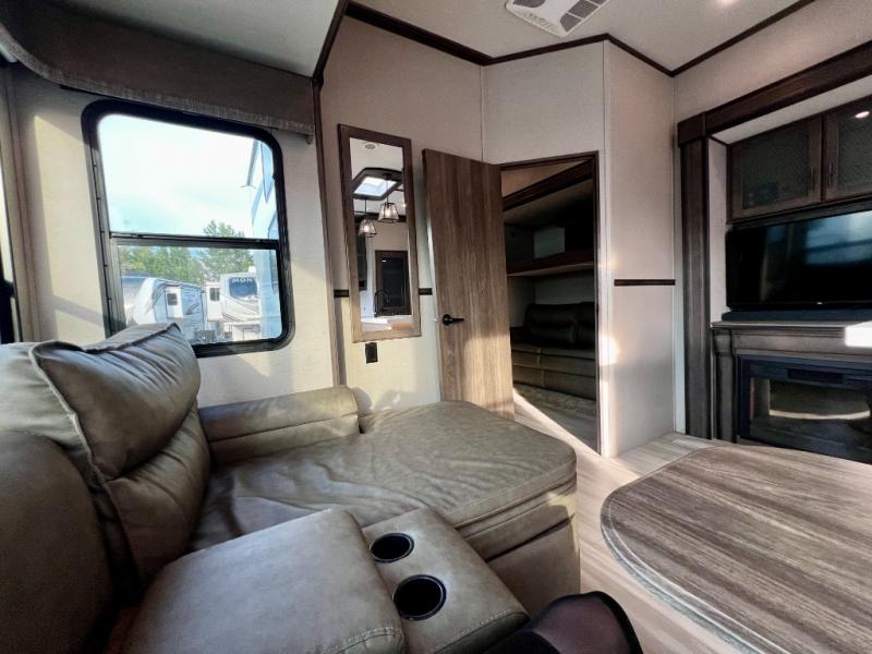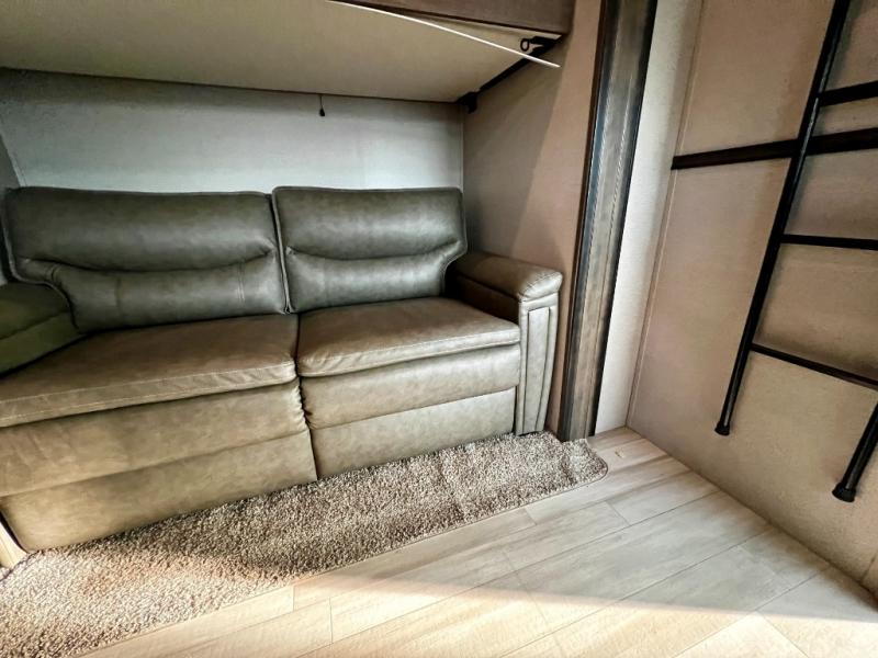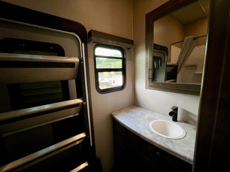 One look at this spacious fifth wheel and you'll be hooked! There are two full baths; one up front by the private bedroom, and one in the private bunkhouse. The rear bath also features a unique rear entry door for convenience. The chef of your group will love the outdoor kitchen that includes a beverage cooler, a sink, and an outdoor griddle for hot dogs and burgers. If the weather is raining on your parade, take the conversations inside to relax on the theatre seating or play a game at the free-standing dinette. There is also an LED TV here and a fireplace. This model includes plenty of storage space, including a large bedroom closet, a pantry in the kitchen, plus an exterior pass-through storage for larger camp gear!