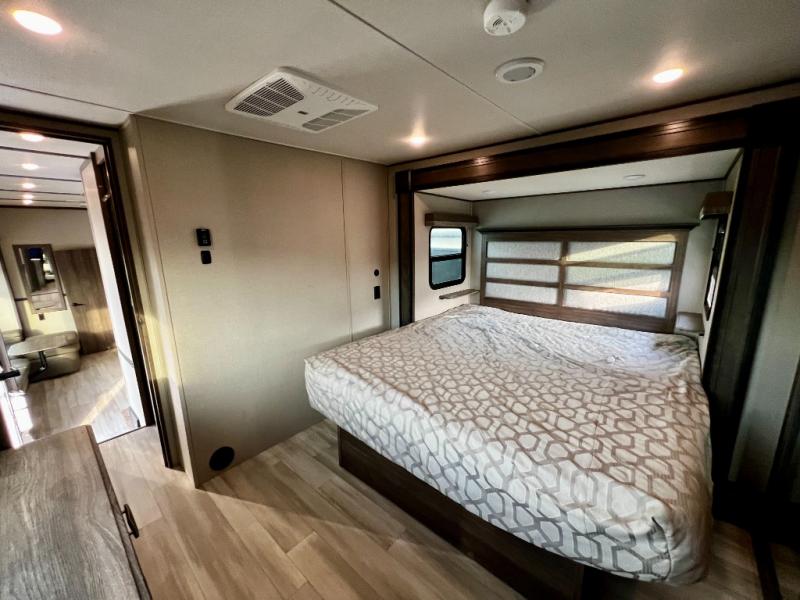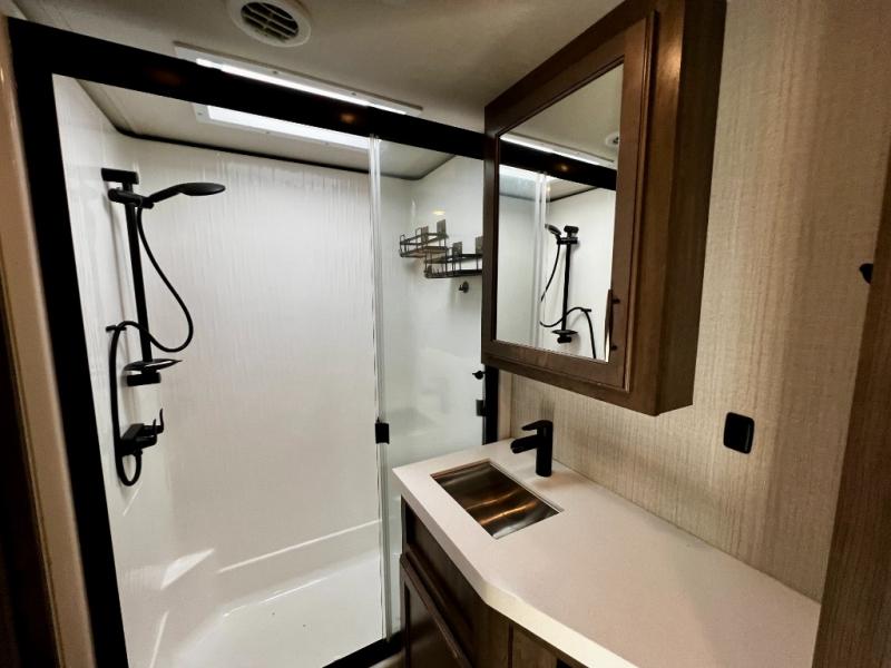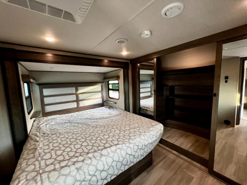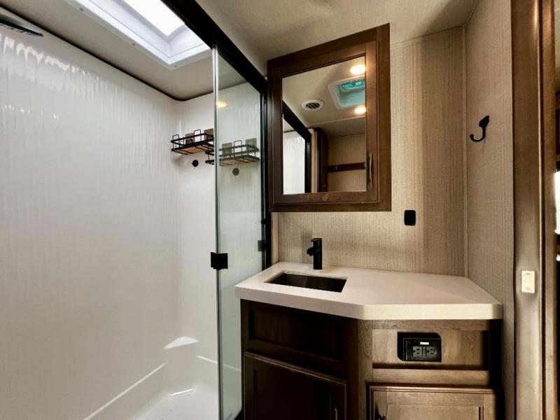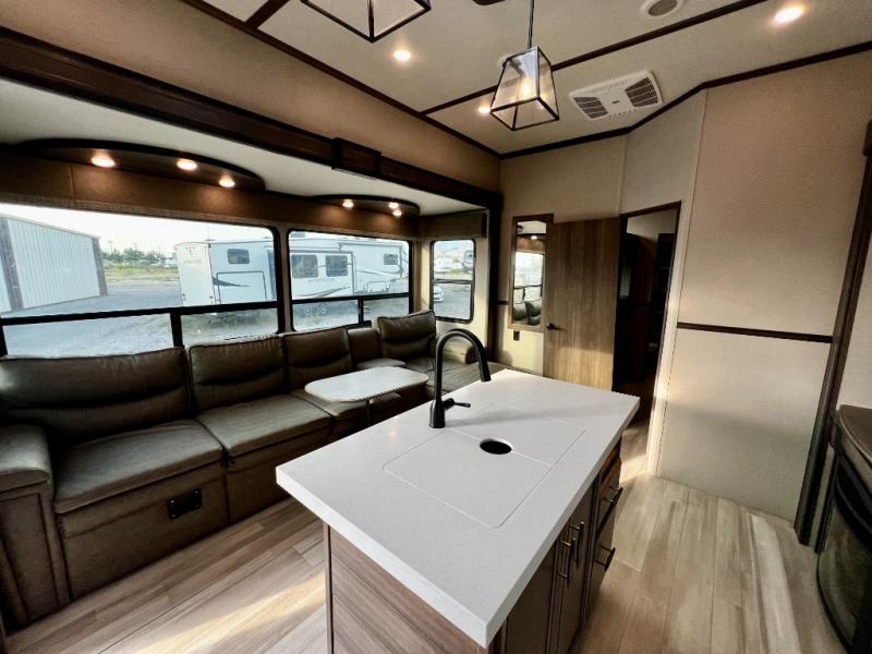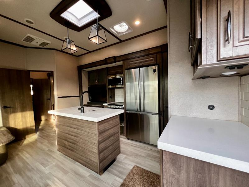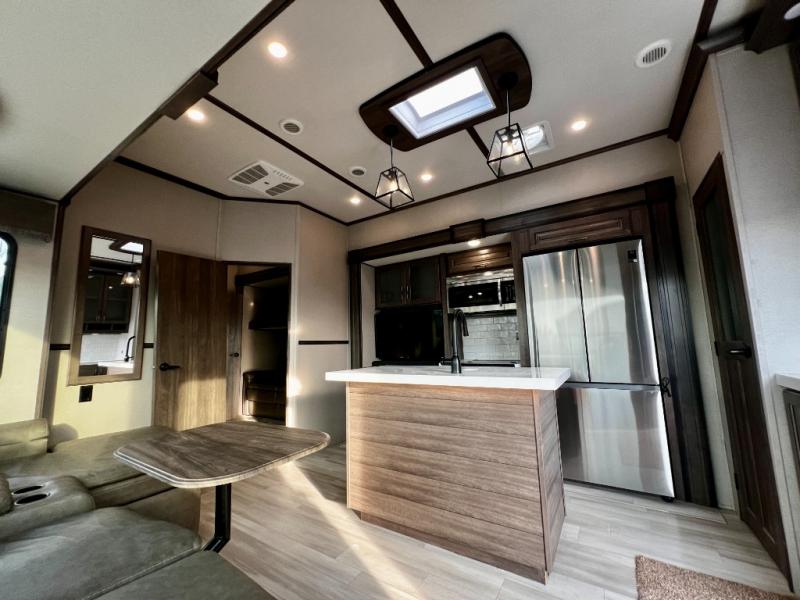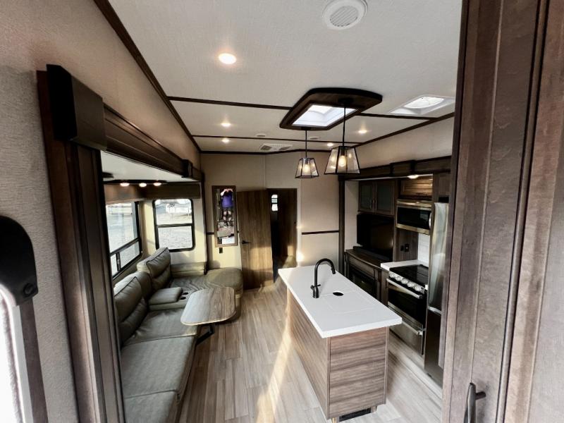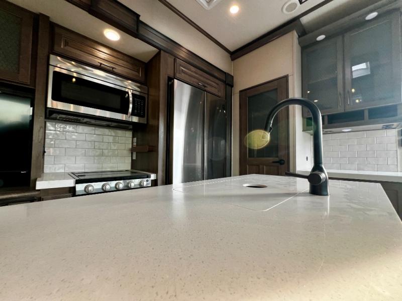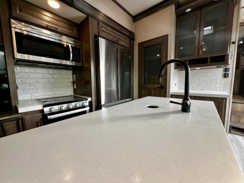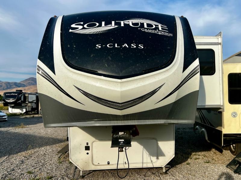 With any Solitude S-Class fifth wheel by Grand Design you will appreciate the Max Built Construction Package that features a 101" wide-body, gel coat exterior sidewalls, heavy-duty 7,000 lb. axles, plus many more durable construction materials. The self-adjusting brakes and the MORryde CRE3000 suspension system will provide a smooth towing experience, and each model includes heavy duty 17.5" H-rated tires with NitroFill. Some of the features you are sure to love are included in the Residential Living Package, like the solid surface countertops and sink covers, the hardwood cabinet doors, the night stands with USB ports, and the Rockford Fosgate stereo entertainment system with HDMI and App controls. These fifth wheels are extended-stay approved thanks to the Weather-Tek Package with a 35,000 BTU high-capacity furnace, the Stealth A/C system, and many high-end residential finishes to make you feel like you taken home with you!