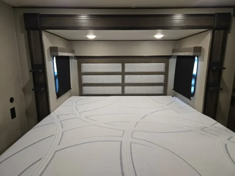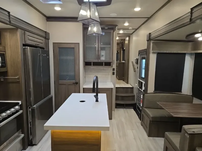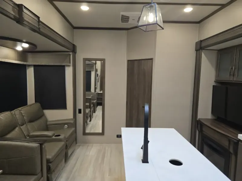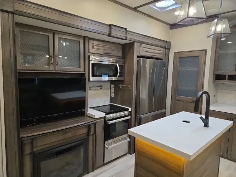 With any Solitude S-Class fifth wheel by Grand Design you will appreciate the Max Built Construction Package that features a 101" wide-body, gel coat exterior sidewalls, heavy-duty 7,000 lb. axles, plus many more durable construction materials. The self-adjusting brakes and the MORryde CRE3000 suspension system will provide a smooth towing experience, and each model includes heavy duty 17.5" H-rated tires with NitroFill. Some of the features you are sure to love are included in the Residential Living Package, like the solid surface countertops and sink covers, the hardwood cabinet doors, the night stands with USB ports, and the Rockford Fosgate stereo entertainment system with HDMI and App controls. These fifth wheels are extended-stay approved thanks to the Weather-Tek Package with a 35,000 BTU high-capacity furnace, the Stealth A/C system, and many high-end residential finishes to make you feel like you taken home with you!