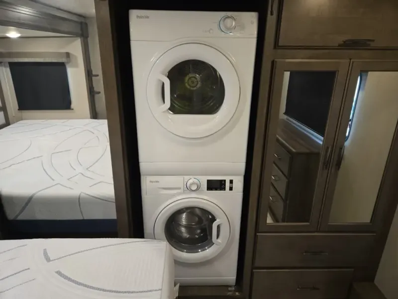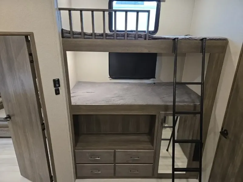 One look at this spacious fifth wheel and you'll be hooked! There are two full baths; one up front by the private bedroom, and one in the private bunkhouse. The rear bath also features a unique rear entry door for convenience. The chef of your group will love the outdoor kitchen that includes a beverage cooler, a sink, and an outdoor griddle for hot dogs and burgers. If the weather is raining on your parade, take the conversations inside to relax on the theatre seating or play a game at the free-standing dinette. There is also an LED TV here and a fireplace. This model includes plenty of storage space, including a large bedroom closet, a pantry in the kitchen, plus an exterior pass-through storage for larger camp gear!