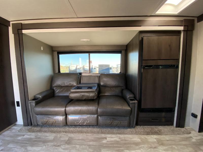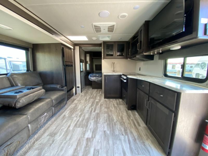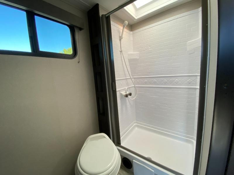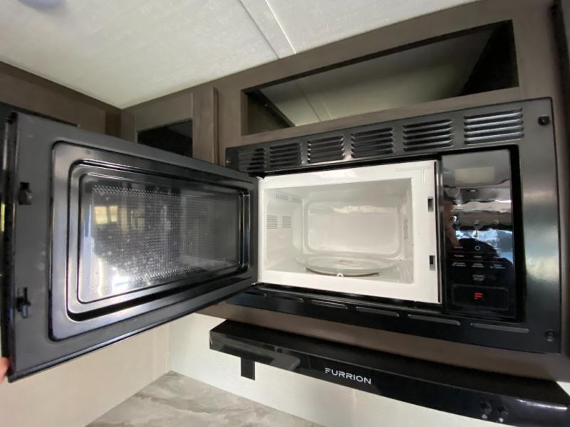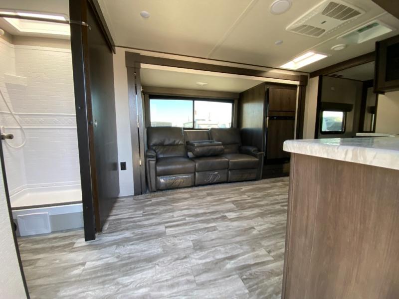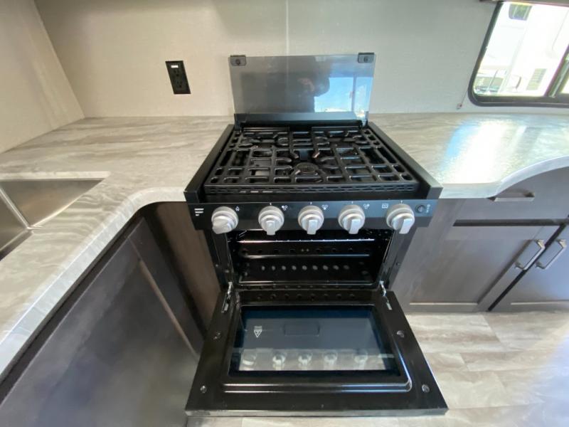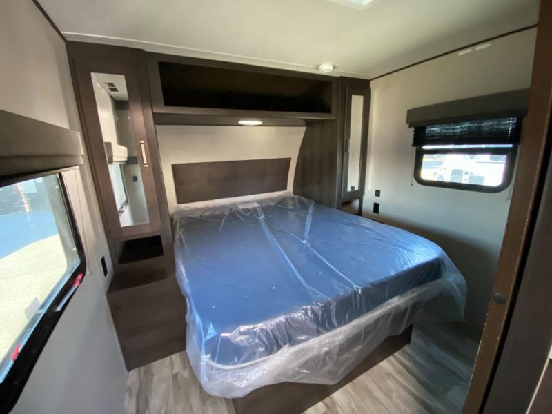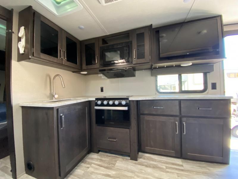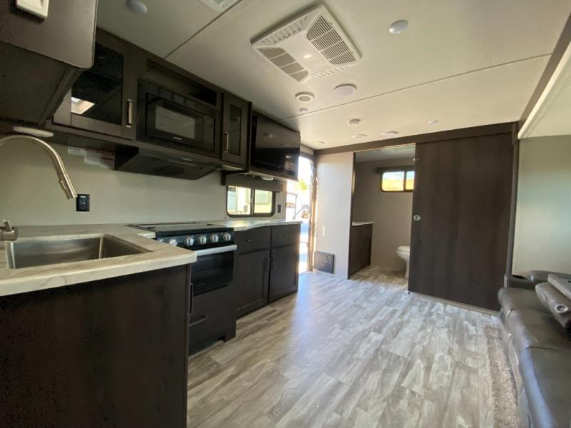 This travel trailer will feel just like home with its private bedroom that includes a queen bed, overhead storage, and TV prep if you choose to bring along your own television. The full rear bath is both spacious and tucked away for privacy, and the main living area includes a slide out for added space. Here, you'll enjoy dining around the U-shaped dinette or relaxing on the optional theater seats if you go that way. Whether you're cooking dinner in the spacious kitchen, relaxing under the 17' power awning, or cleaning up in the walk-in shower, you will always have a good time in this travel trailer!