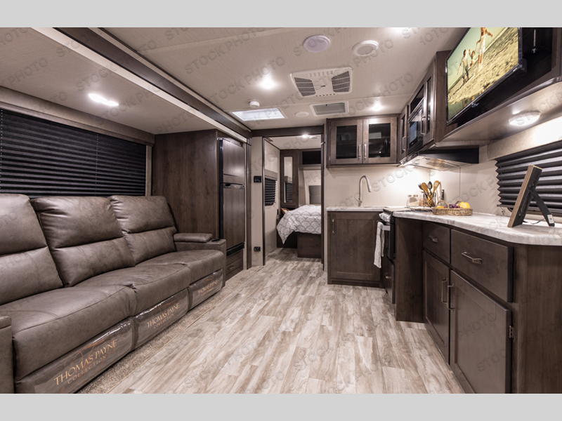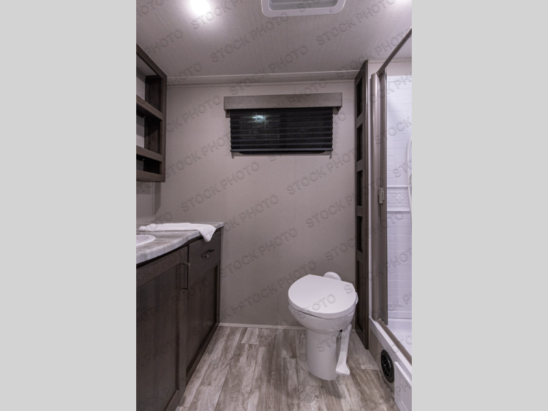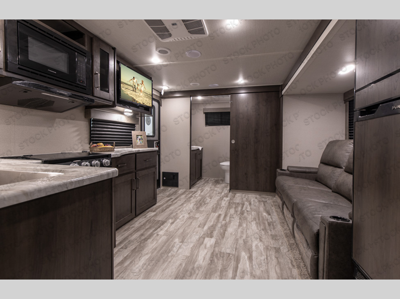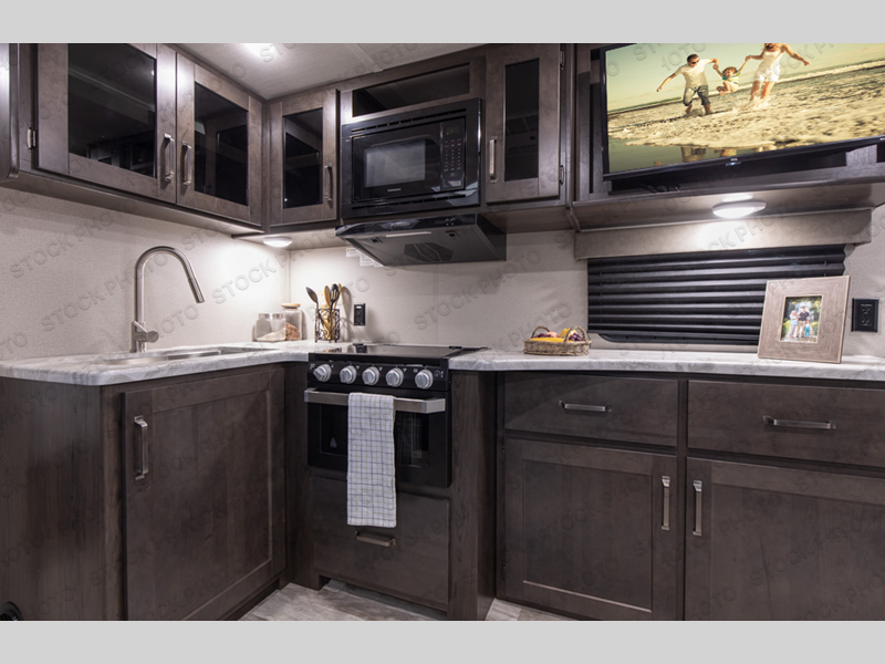This travel trailer will feel just like home with its private bedroom that includes a queen bed, overhead storage, and TV prep if you choose to bring along your own television. The full rear bath is both spacious and tucked away for privacy, and the main living area includes a slide out for added space. Here, you'll enjoy dining around the U-shaped dinette or relaxing on the optional theater seats if you go that way. Whether you're cooking dinner in the spacious kitchen, relaxing under the 17' power awning, or cleaning up in the walk-in shower, you will always have a good time in this travel trailer!