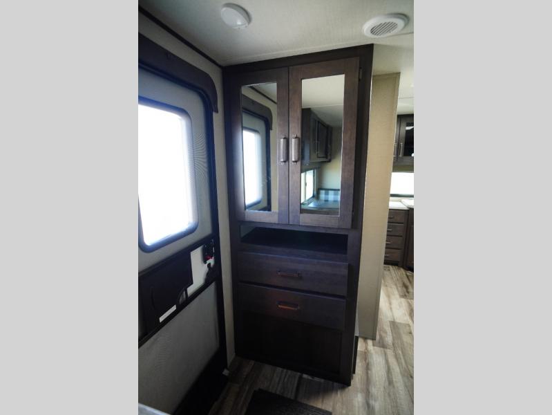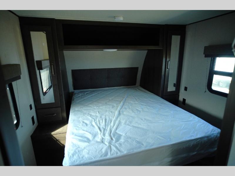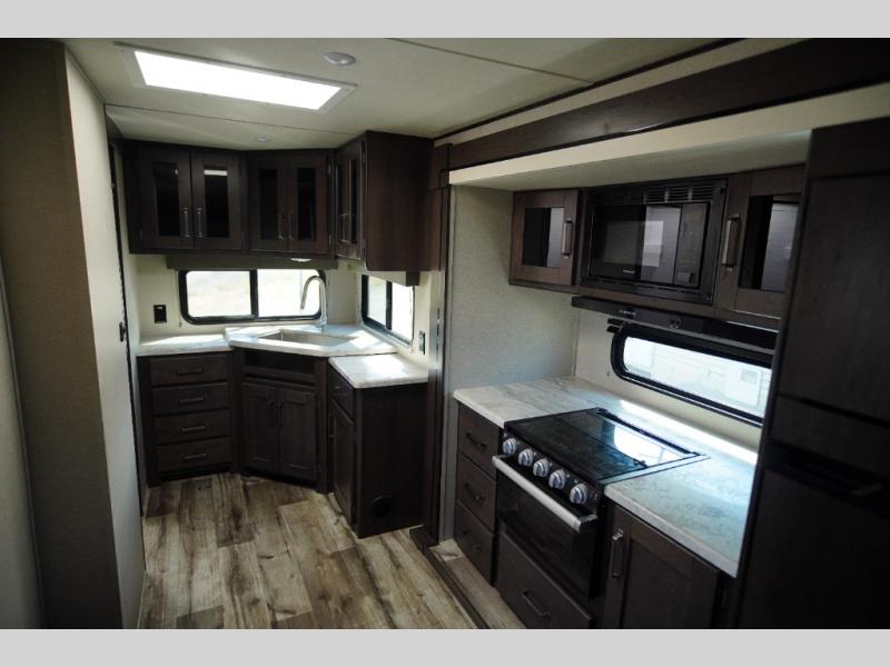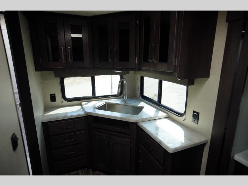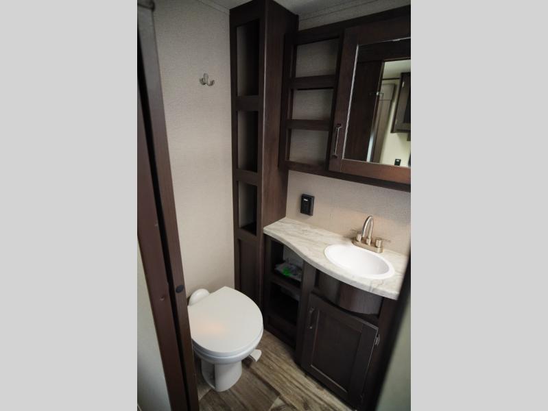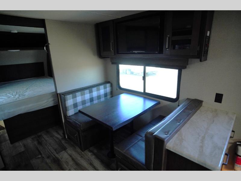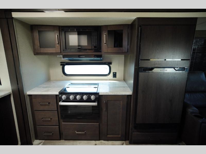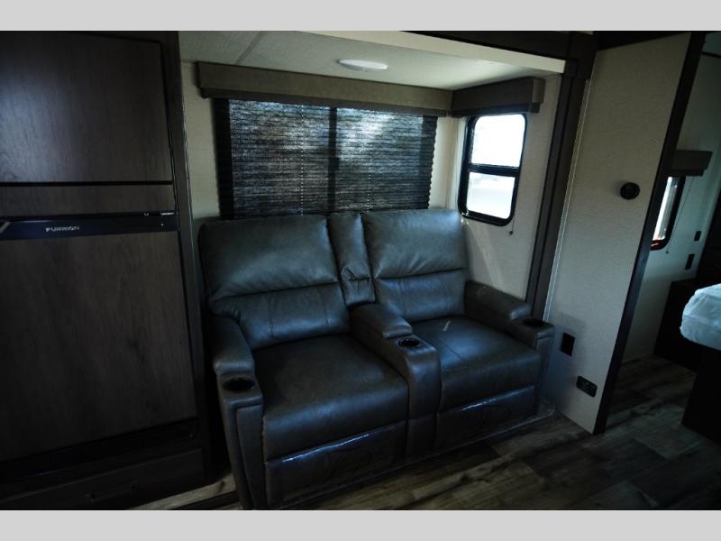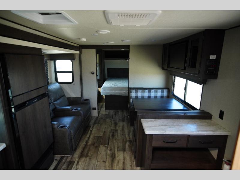 Relaxing weekends to the lake just got sweeter in this spacious travel trailer. Prepare lunch on the three-burner cooktop, and you can enjoy it at the booth dinette. There is also a 60" tri-fold sofa, or you can choose the optional theater seating in place of the sofa if you don't need the extra sleeping space. This model includes plenty of storage space, including a pantry/wardrobe just as you enter the unit, overhead compartments, plus an industry-leading pass-through storage for fishing poles, hiking gear, or lawn chairs!