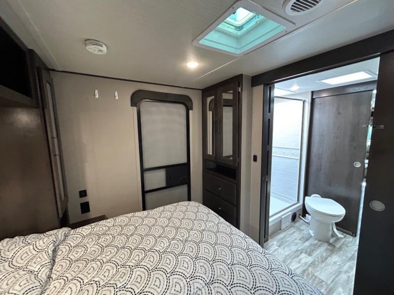 Key interior features include a microwave oven, residential-style countertops, upgraded furniture, and a large solid bedroom door for added privacy. Exterior highlights such as the 165W roof-mounted solar panel, 17-foot power awning, and pass-through storage enhance your camping experience, whether you're staying at a full-service site or exploring off-grid.
