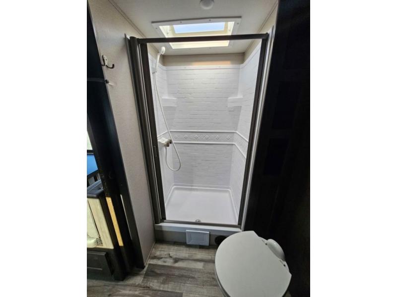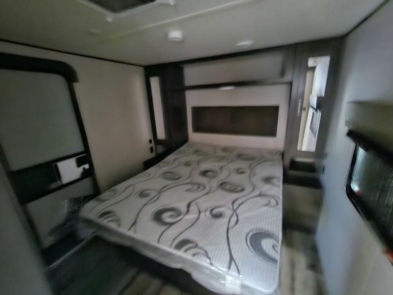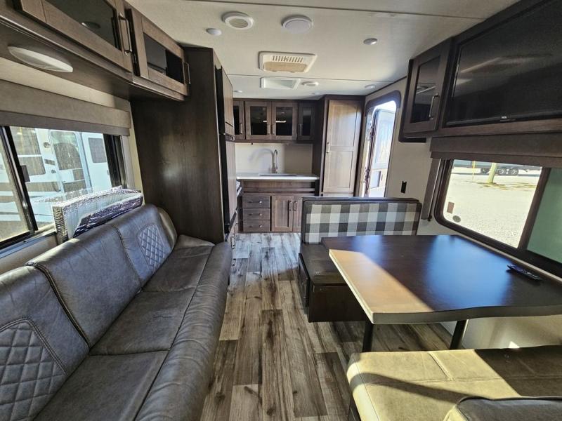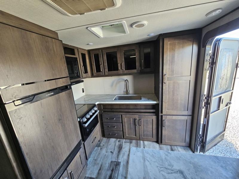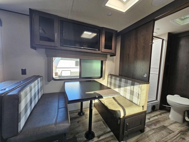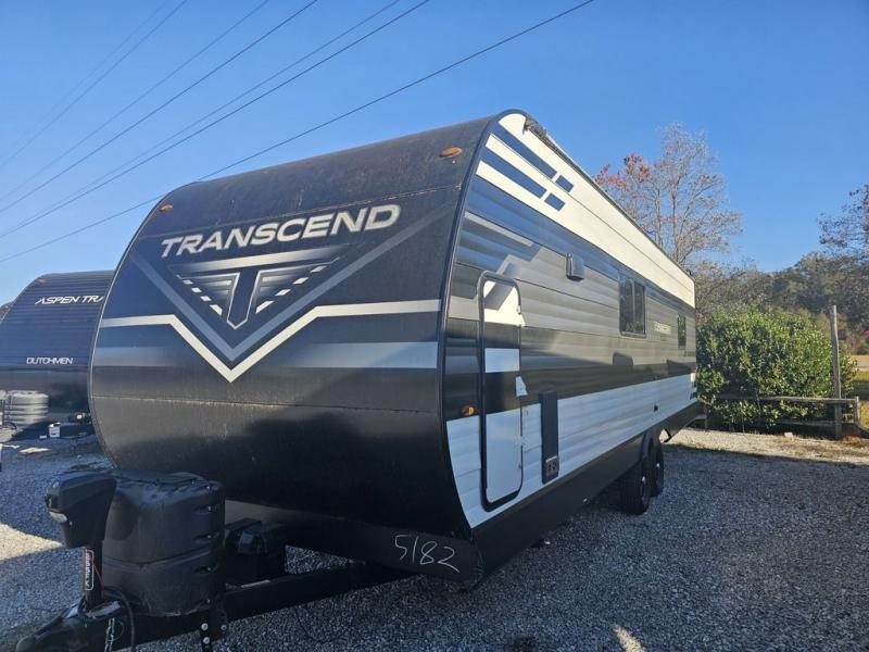 This Transcend Xplor travel trailer is a perfect trailer for couples who are looking to get away with each other! It has a large walk-through bathroom that leads right into the rear private bedroom, so you'll have an easy time getting ready in the morning. The large windows offer great airflow, and the front pass-through storage has plywood backing for different storage options. You can relax on the 69" rollover sofa across from the LED HDTV, and there is also seating at the booth dinette which is directly below the TV. To your left when you enter this trailer, you'll find a countertop with shoe rack, so you can set your wallet and keys down when you come and go.
